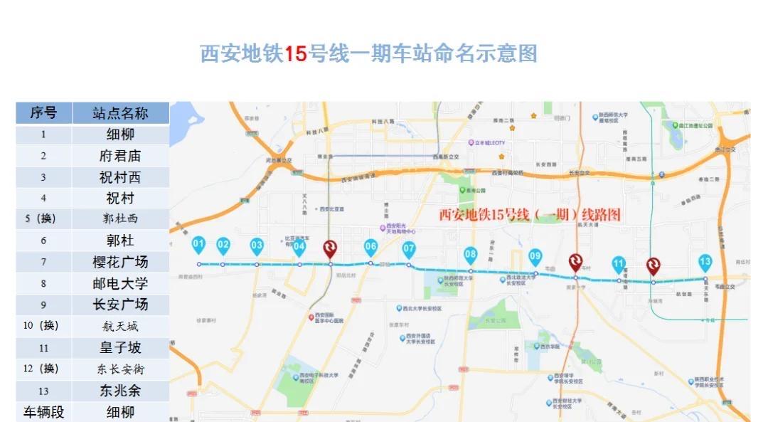 西安地铁15号线一期已于2025年9月正式开通运营。该线路全长19.46公里,设13座车站,西起细柳站,东至东兆余站,串联高新区、长安区和航天基地,并与2号线(航天城站)、4号线(东长安街站)、6号线(郭杜西站)实现换乘。 线路采用全自动驾驶技术,设计时速100公里,配备A型列车,是主城区南部东西向客流走廊的重要补充。 主要站点包括细柳、郭杜、樱花广场、邮电大学、航天城等,其中换乘站覆盖2/4/6号线。部分车站(如郭杜、樱花广场)未来将规划为交通商业综合枢纽。 西安地铁15号线线路建成运营后,极大缩短了长安大学城与相邻产业园以及城区的空间距离,对促进西安市南部的科创教育、文化旅游以及快速发展具有重要意义。15号线地铁盘 15号线沿线