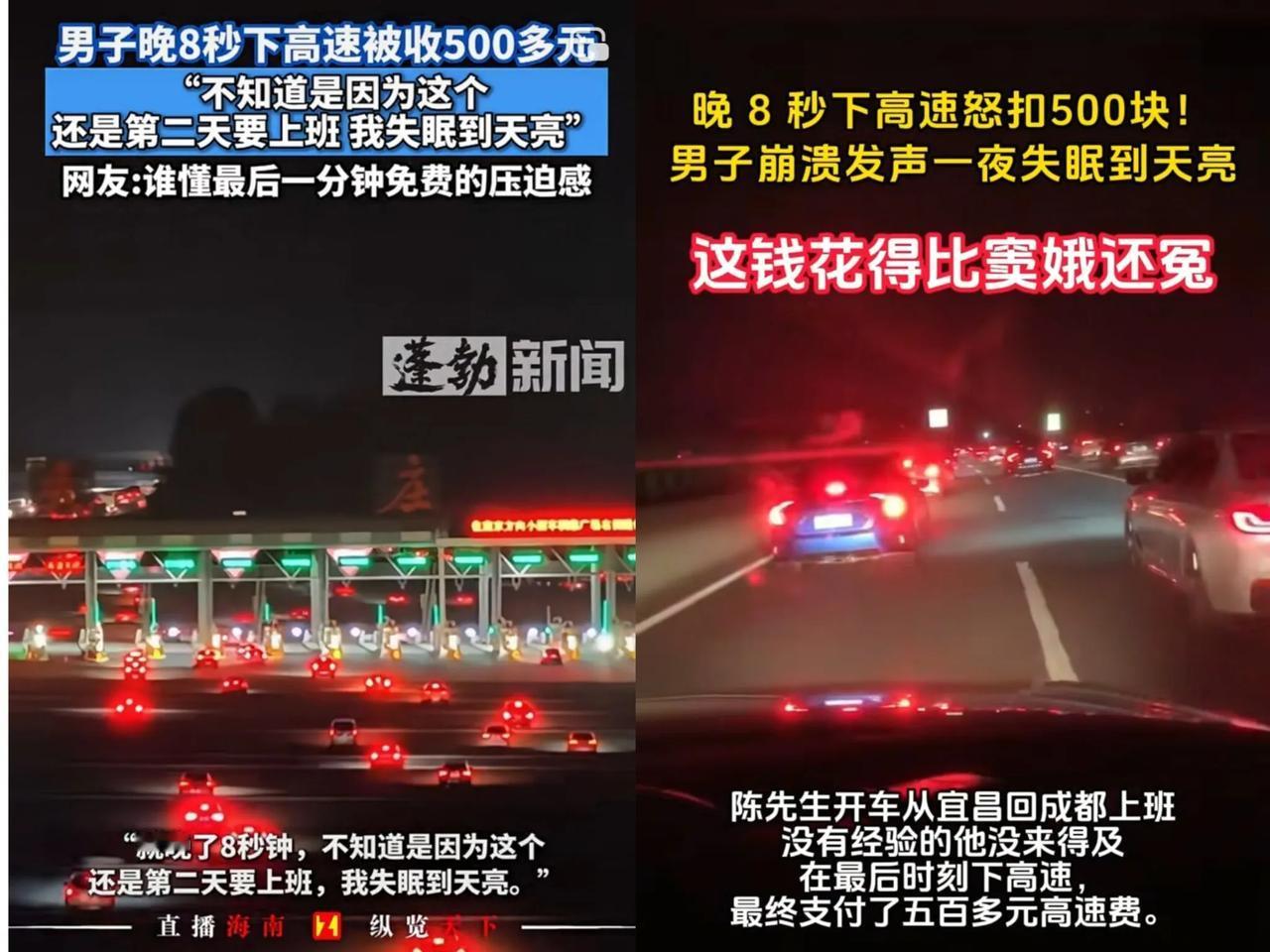 看到这一幕, 打工人集体破防了! 晚下高速8秒,宜昌的陈先生回成都上班,就因为没卡准高速免费时间,晚了8秒下闸口,直接掏了500多高速费! 说真的,这钱花得太冤了,但也怪不了别人,高速规矩摆在那儿,咱得守! 其实这事完全能避免,关键是没提前规划。要是知道快到免费截止时间,提前一个出口下高速,等过了免费点再重新上,既不用慌慌张张赶时间,还能省下这笔冤枉钱,多划算! 咱打工人挣钱都不容易,可别跟时间死磕。高速上啥情况都可能发生,万一遇上个堵车、前车慢,卡点根本不现实! 这事给我们所有人提个醒,尽量不要掐着时间点下高速,一是时间掐不准,二是高速路况随时会有变动,还是得提早有规划,合理安排时间! 你们有没有过卡点走高速的经历?要是遇到快到免费截止时间还没到目的地,你们会咋处理?