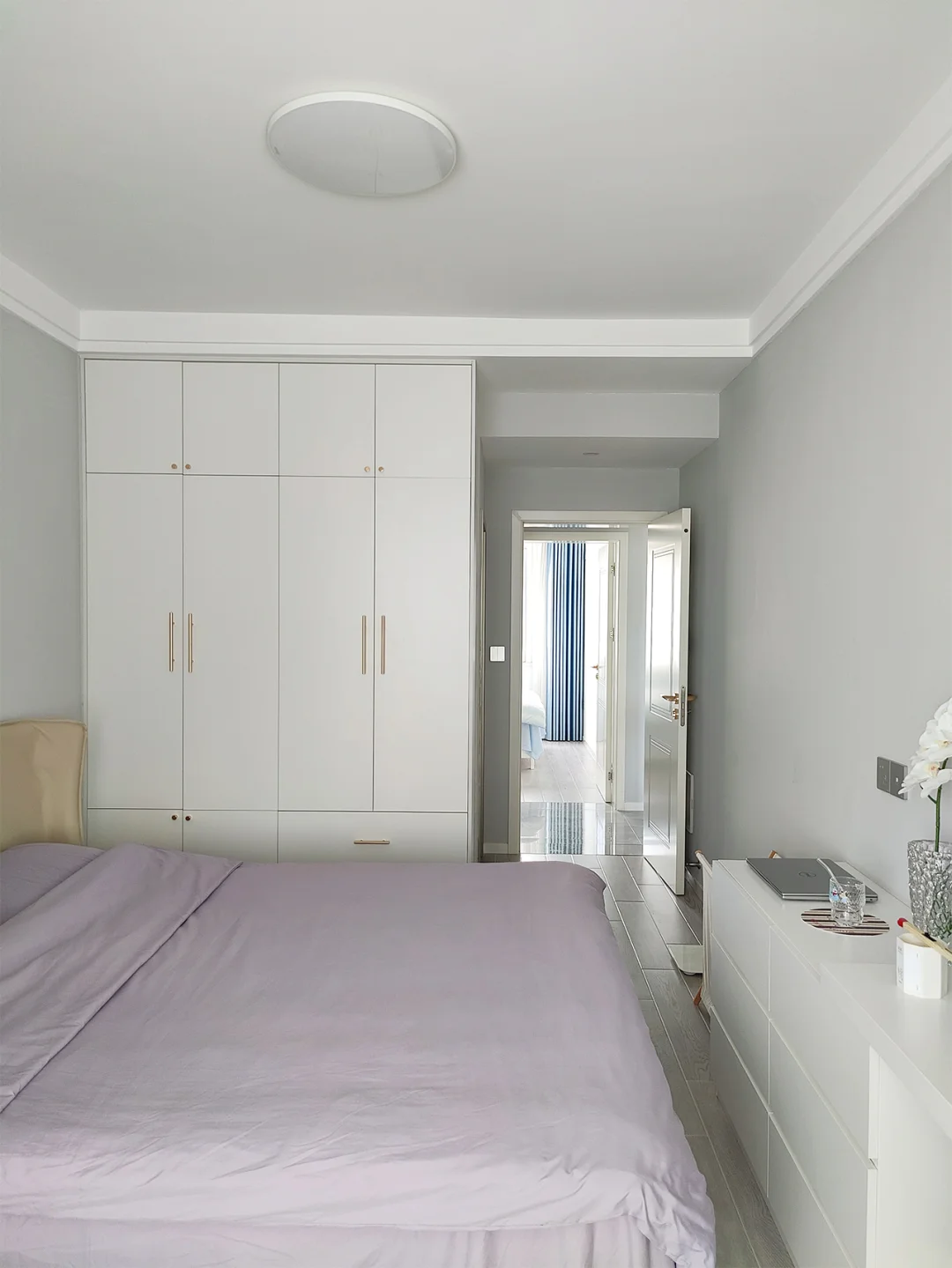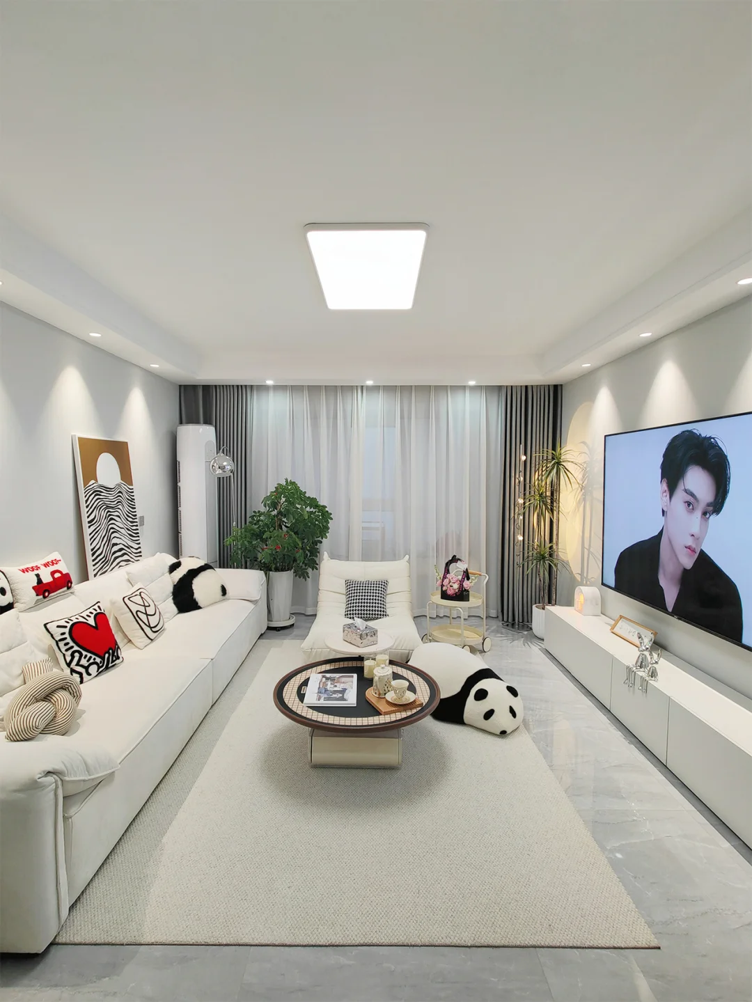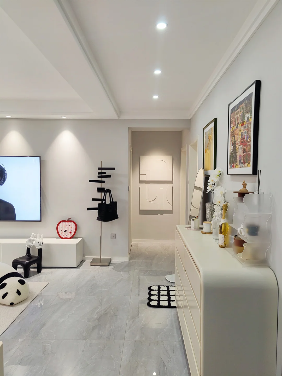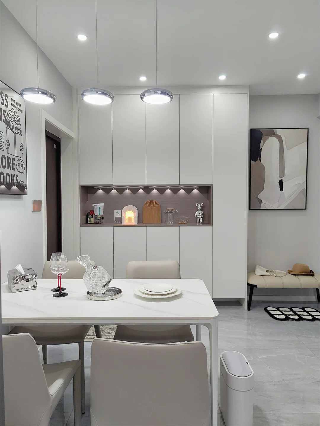 推门而入,喧嚣便被隔绝在外。整个空间以柔和的米白与浅灰为基底,没有繁复的装饰,却处处透着精心。 低矮的布艺沙发线条利落,搭配一个素色地毯,便构成了客厅的核心,简单却足够舒适。 墙面保持了最纯粹的质感,偶尔挂一两幅线条简约的装饰画,或是摆放一盆舒展的绿植,就足以点亮整个空间。餐厅与厨房相连,开放式的设计让视野更开阔,浅色调的橱柜与极简岩板餐桌相得益彰,营造出干净清爽的氛围。 每一处细节都在做减法,去掉多余的色彩和造型,留下的是最本真的质感与实用。在这里,生活回归简单,心情也随之沉静下来。