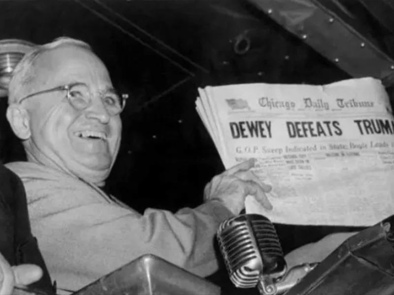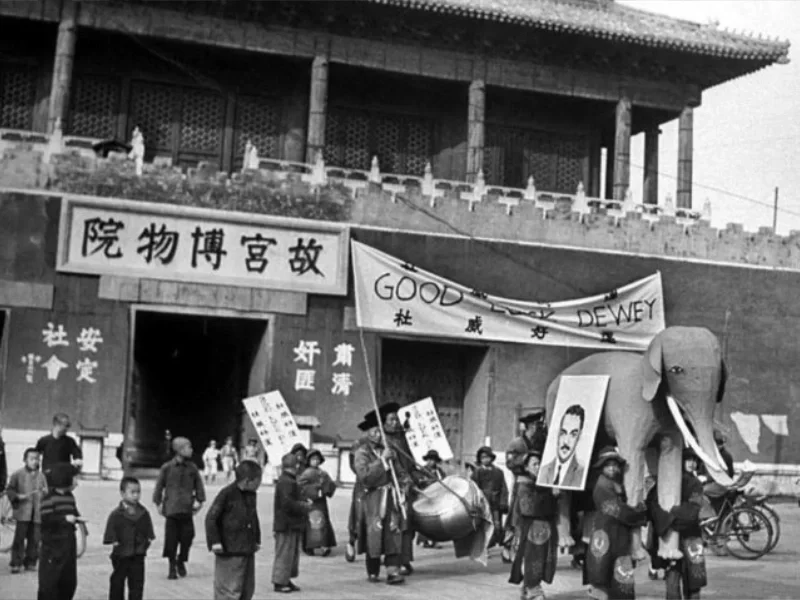 那年美国大选,居住在北平城的美国人组织了一次游行,为共和党候选人托马斯·杜威助选造势,当时,蒋介石也押宝杜威胜。但结局让人大跌眼镜,农民出身的民主党候选人哈里·S·杜鲁门成为了第33任美国总统,他是在最后一刻爆冷击败了大哲学家杜威。
