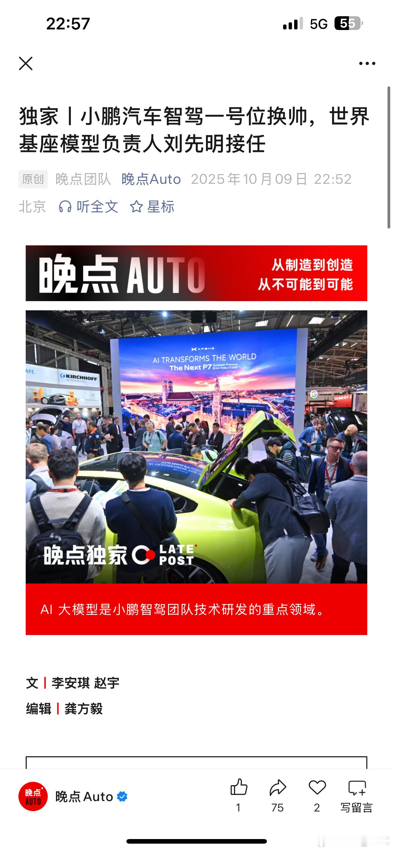 晚点Auto报道,李力耘不再担任小鹏自动驾驶中心负责人,世界基座模型负责人刘先明(Xianming Liu)接替该职位。
