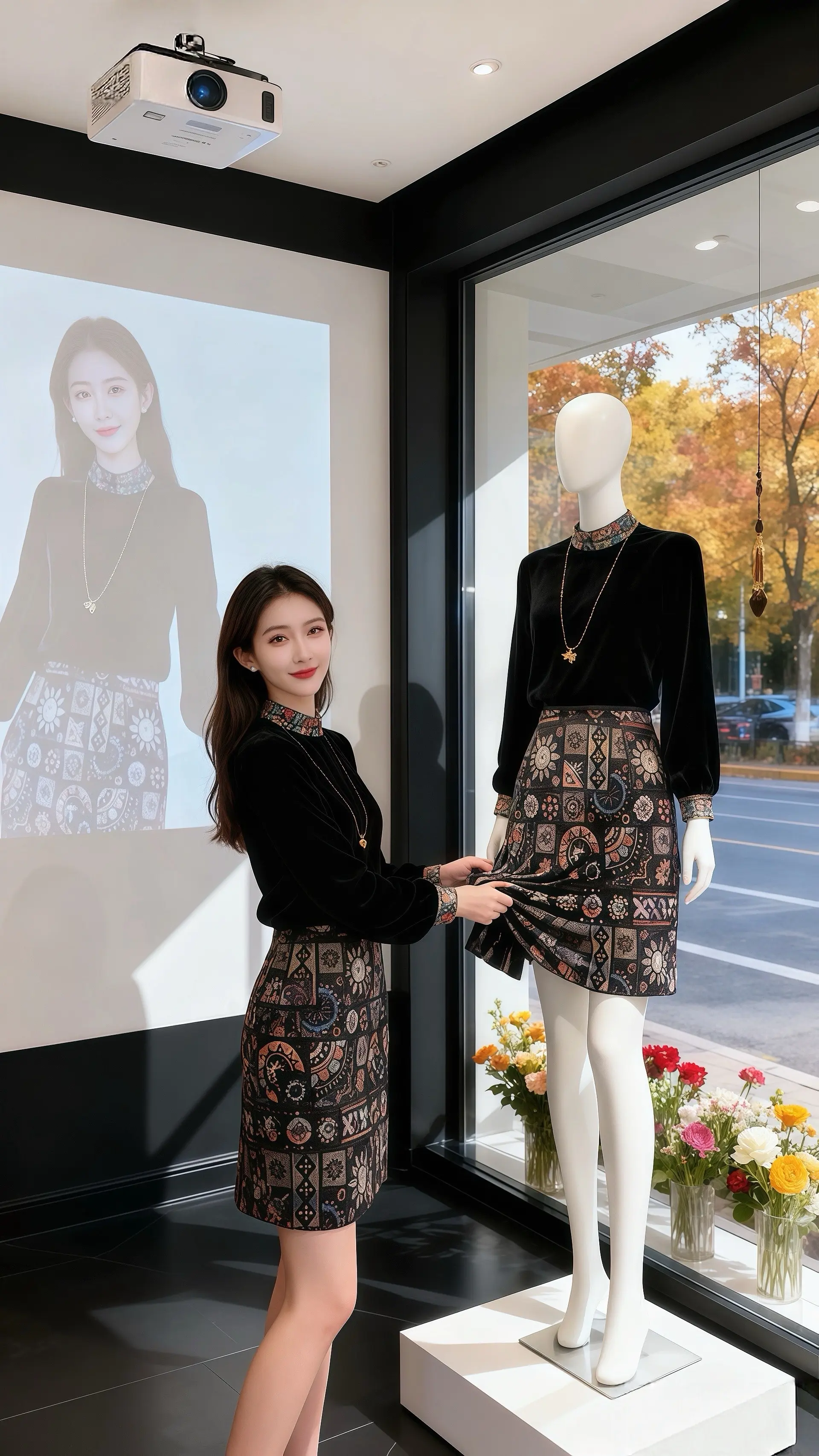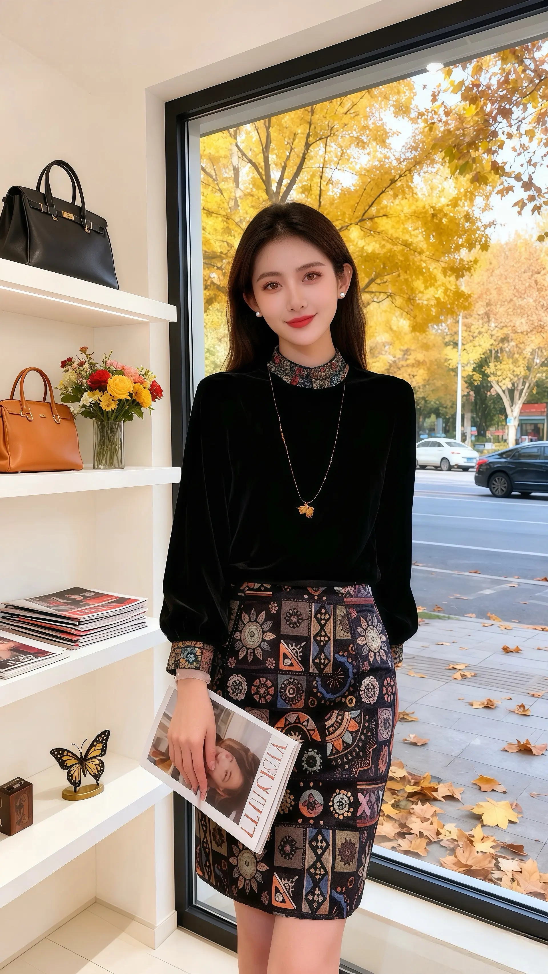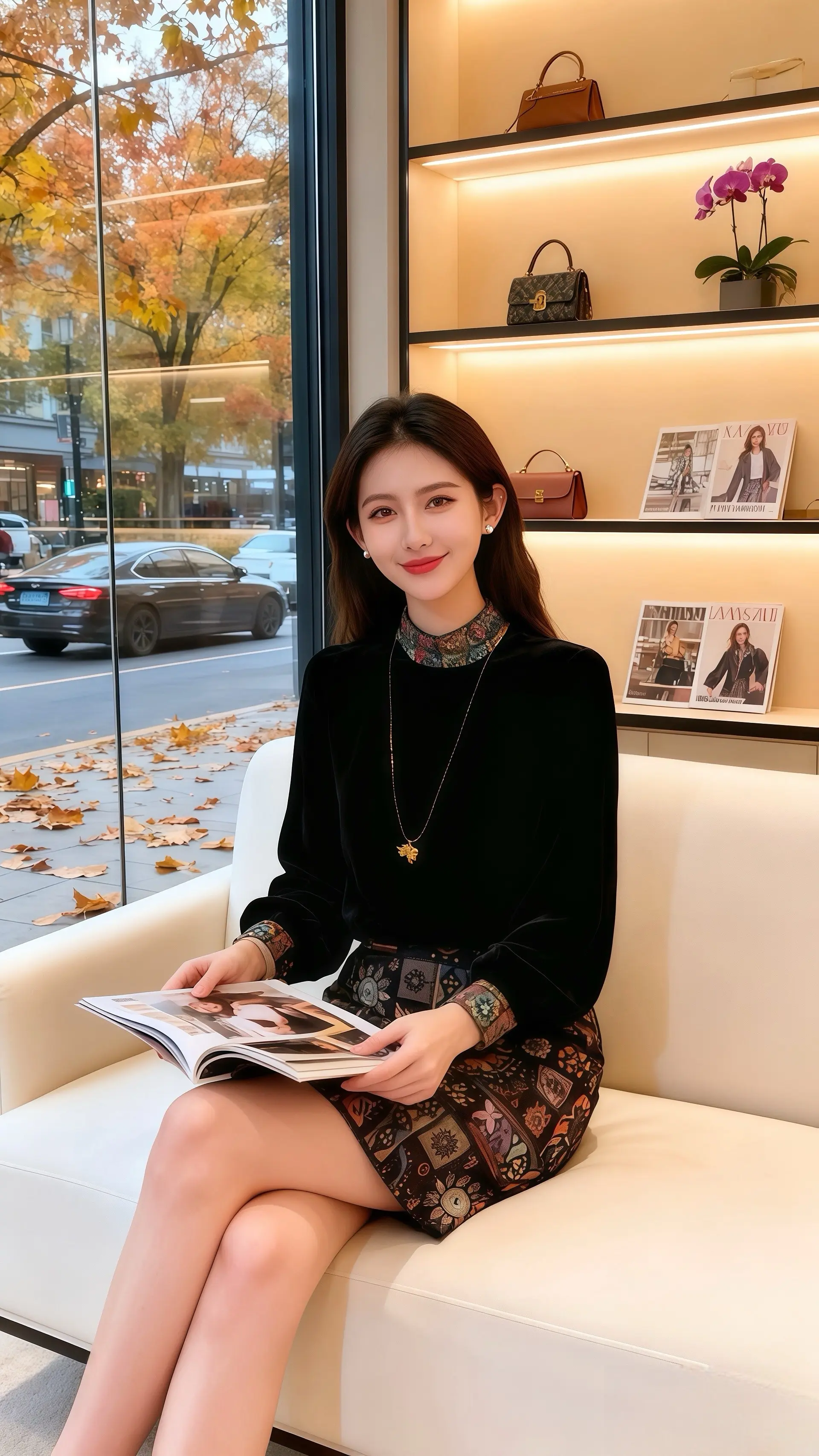 秋日的午后,阳光透过女装店的落地窗,在地板上洒下斑驳的叶影。许妍正坐在沙发上翻阅时尚杂志,丝绒上衣的光泽在光线下柔和流转,印花半裙的图案精致又富有艺术感。