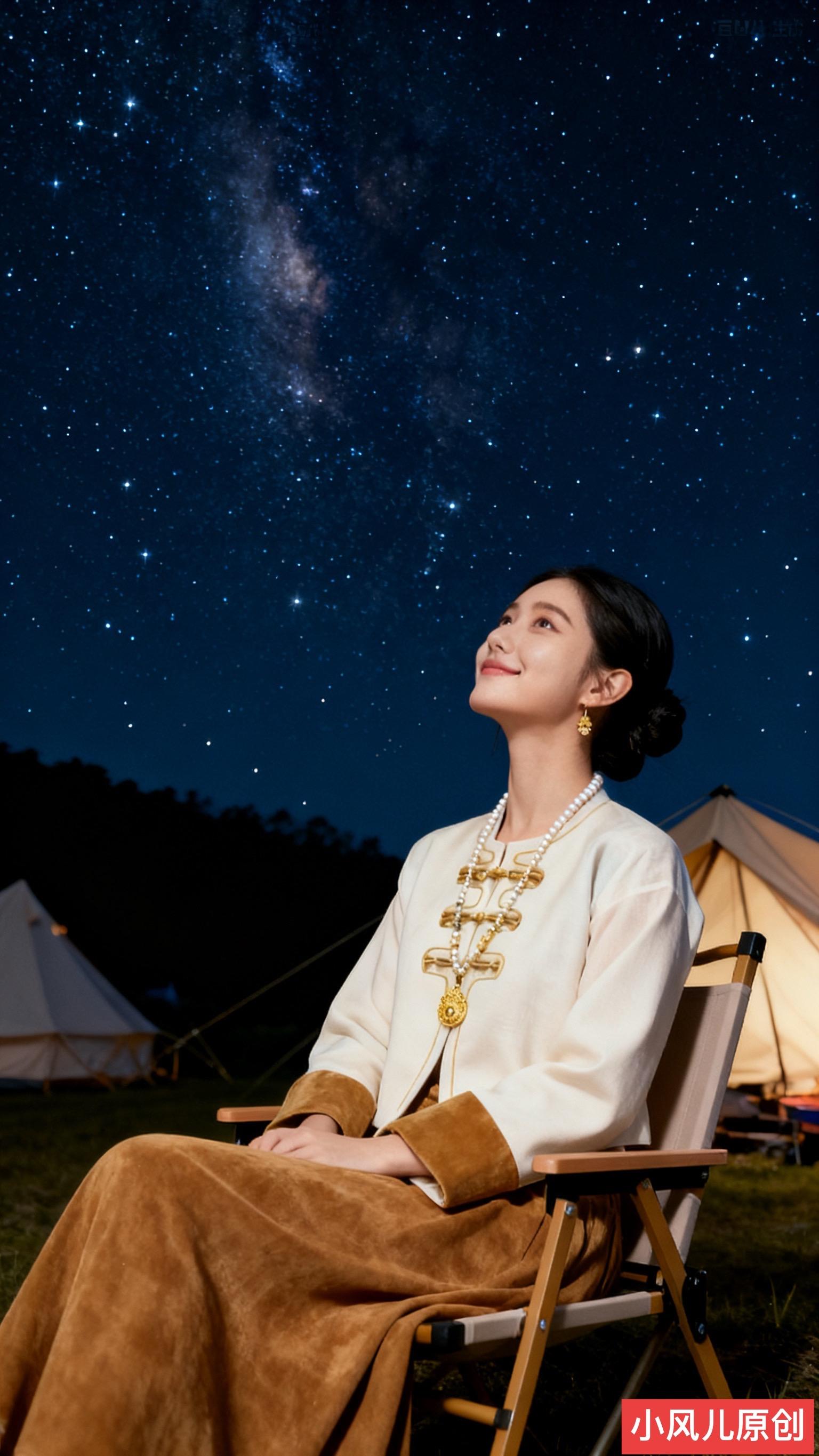 星空露营地,繁星璀璨,她悠然惬意,仰望星河,尽显宁静美好。