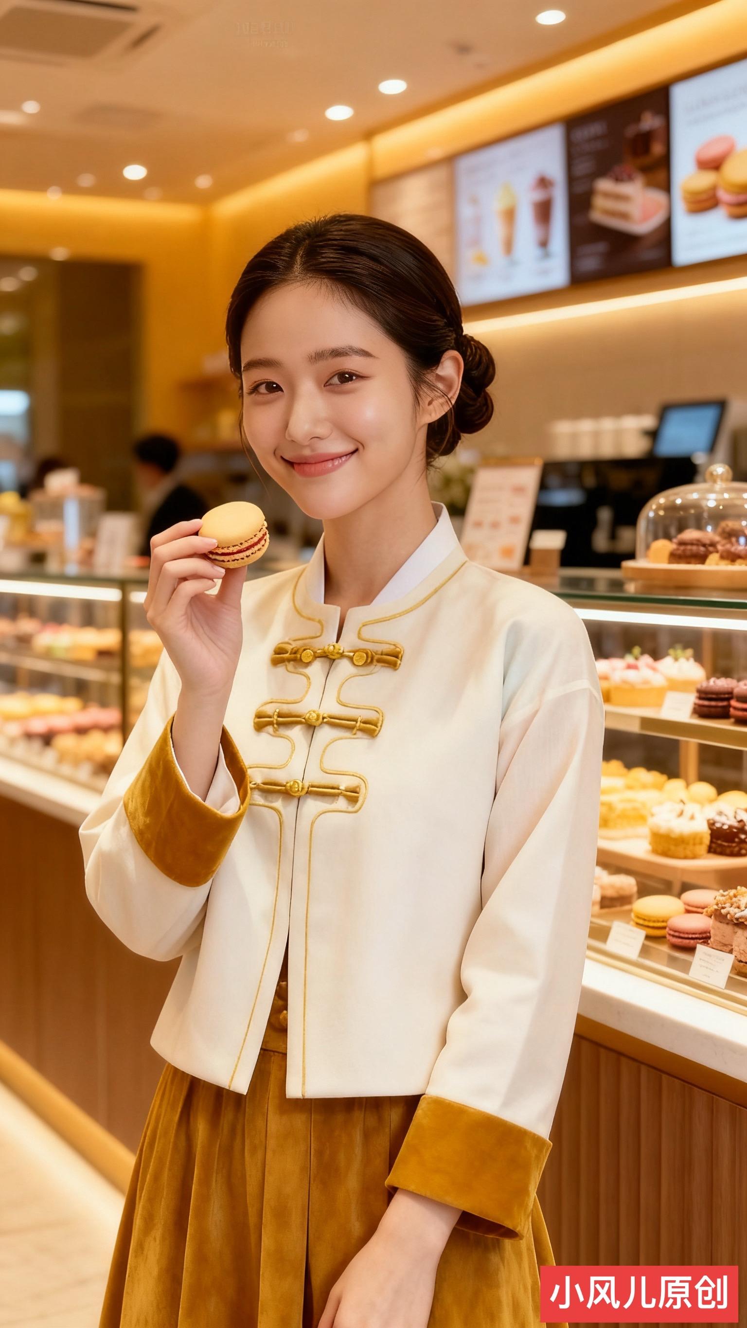 甜品店,甜点琳琅满目,笑容甜美,手持马卡龙,满是幸福甜蜜。