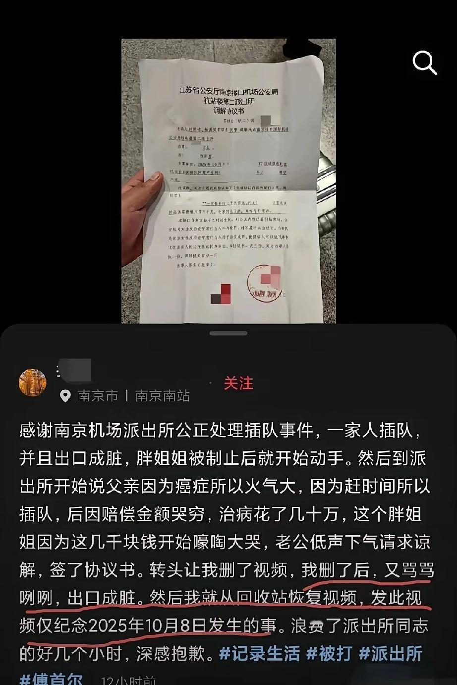 南京禄口机场,一家四口插队不成还动手打人,最后赔偿3500元。博主为了息事宁人删