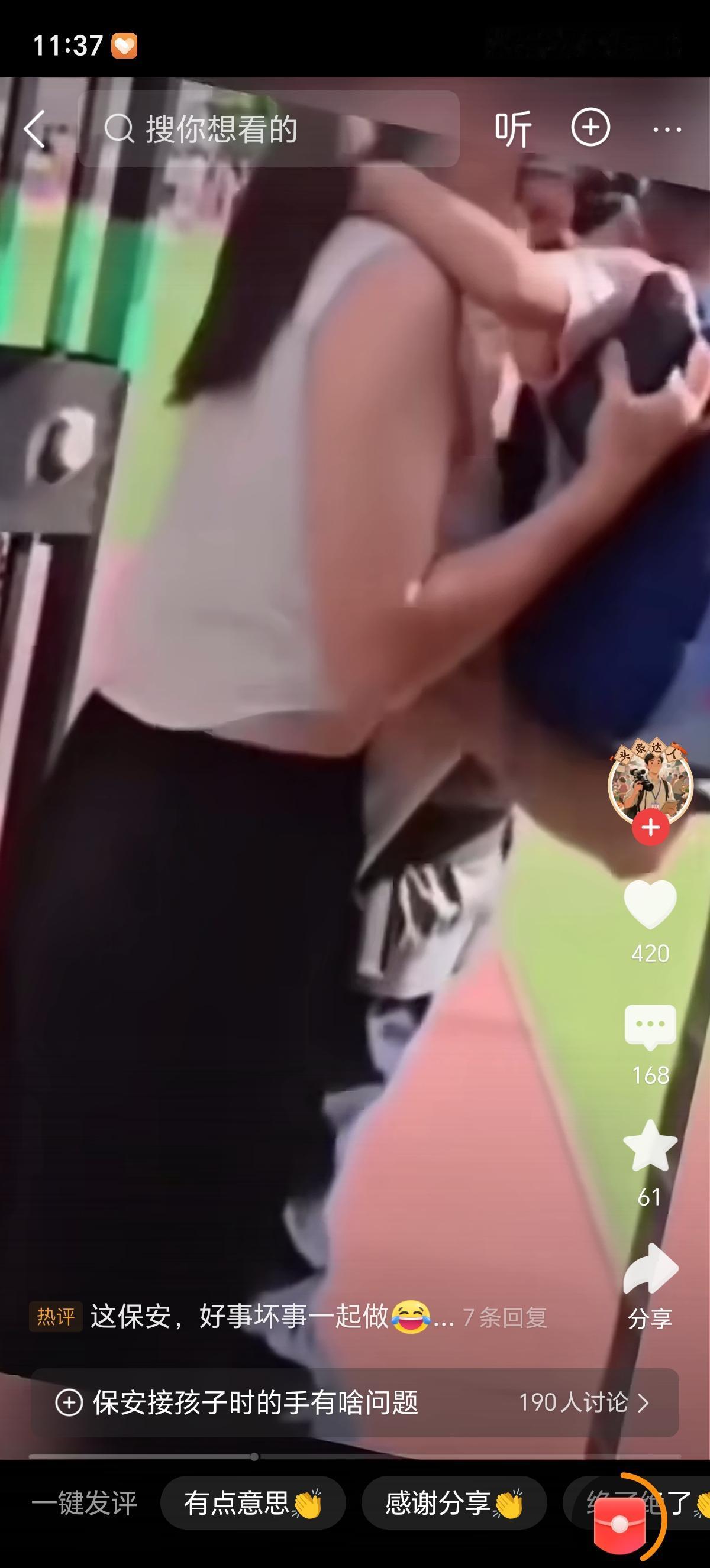 在幼儿园都是女老师帮着接过孩子的,基本用不着保安,保安一般岁数都60来岁左右了,年轻的也不低于50岁了,现在孩子都胖,不一定抱的动了,小朋友更多的是自己走进教室,被抱进教室的很少,保安为了省事都不会去抱孩子的,他看好大门就行了。 很多孩子上幼儿园好几年可能都不一定知道保安是谁,而且保安大叔即使抱孩子一般也知道男女有别,碰到女家长手就属于抱孩子失误了,碰到别的私密部位很难不让人怀疑是故意的,而且衣服还掀起了一角,就更是不可思议了,孩子并没有剧烈反抗,而且女宝宝很乖巧,很自然的就被抱走了,咋会摸到女家长呢?真的不是故意的吗? 这个男人还有个屈膝的动作,他跟女家长个头差不多,用不着的,还特意从下往上摸的,孩子就在那里没动,不去抱孩子腿,从下往上摸好几秒孩子妈妈,很难不让人误会啊!