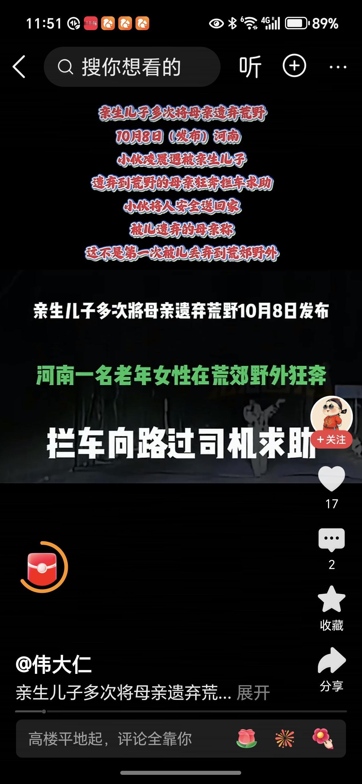 10月8日,河南一小伙凌晨开车时,遇到一位被亲生儿子遗弃荒野后狂奔拦车求助的母亲。在送阿姨回家途中,从老人哭诉中得知,这已不是第一次被亲生儿子丢到郊野荒外。老人要求小伙把她送到有灯的地方就行!听这话让人太心酸了!好心的小伙子最后把老人送回了家! 遗弃亲生母亲这事儿让人愤怒!不知道这位母亲究竟做了什么事让亲儿子这么不容? 孝顺父母是基本义务和传统美德,这儿子的行为简直天理难容。 而河南小伙子的做法太暖心了,在别人陷入困境时伸出援手。真希望这位母亲往后能和儿子和谐相处,也希望社会多些像河南小伙这样的好心人。