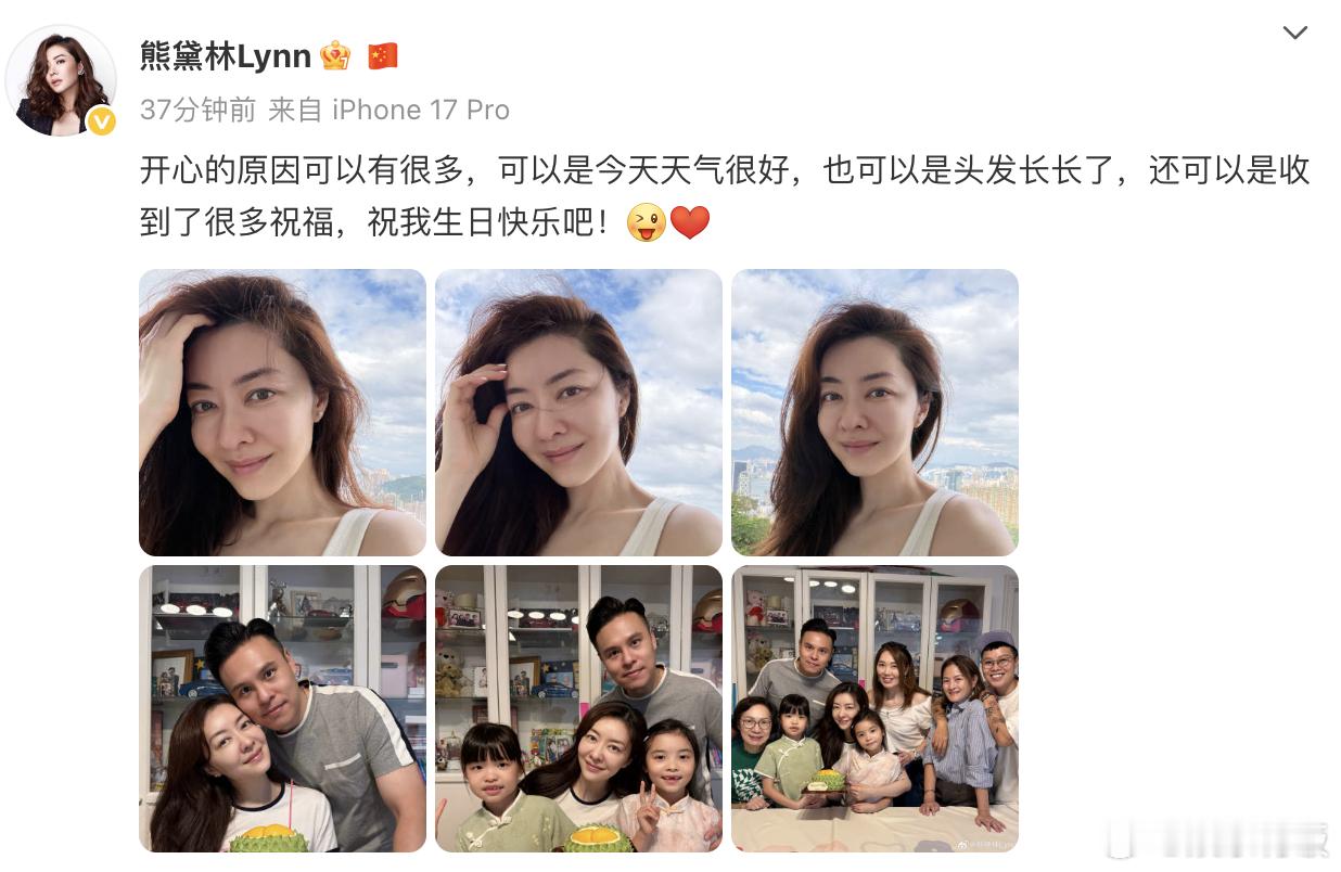 10月10日,熊黛林45岁生日,她在自己的社交平台晒出6张相片,有大家庭的全家福