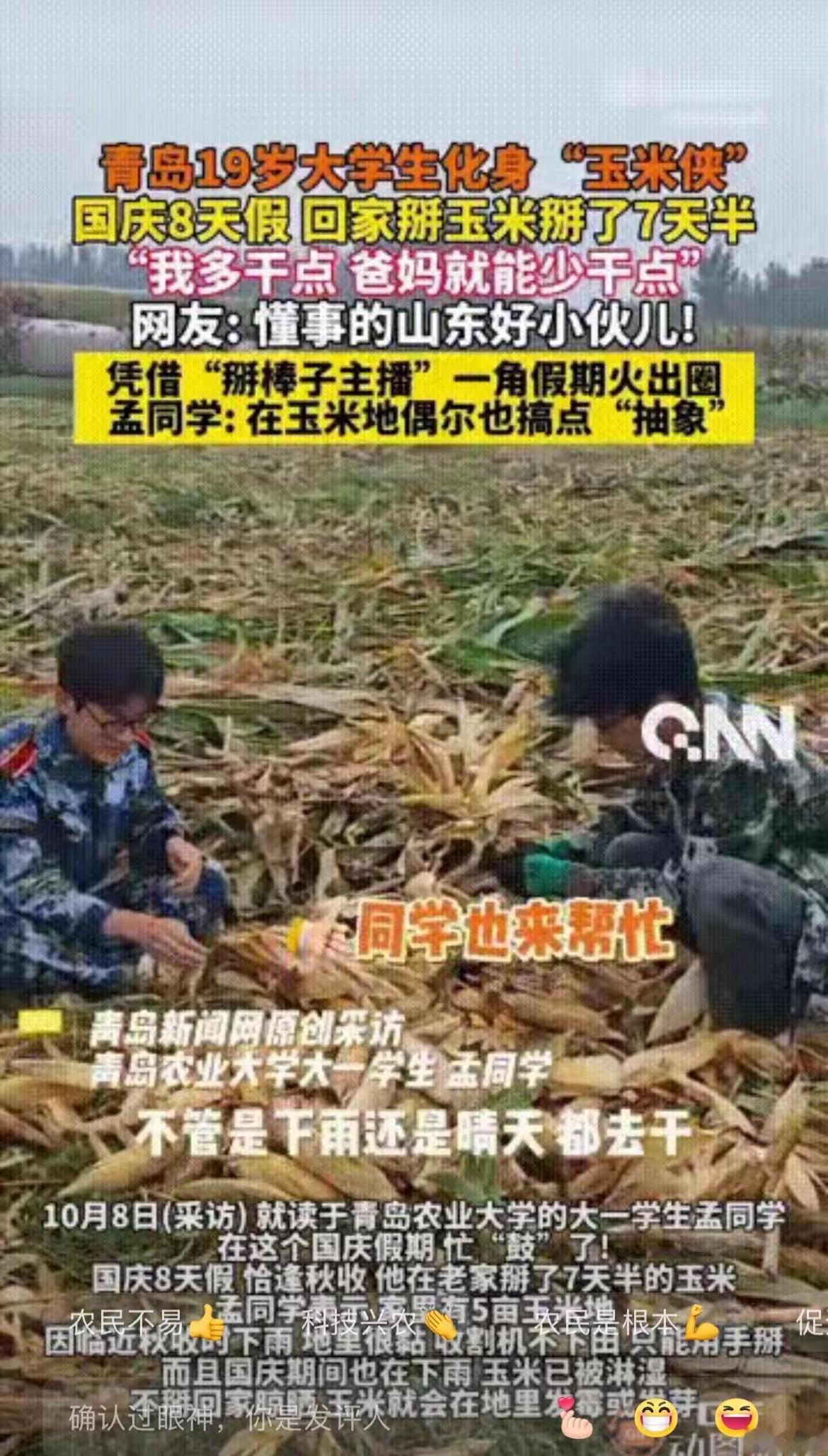 青岛农大这大一男生,把国庆假期过成了最暖的样子!别人去旅游打卡,他却带着俩同学,在田里干了7天半,把5亩玉米全收完了——就因为爸妈摆摊没空,他想多扛点,让爸妈少累点。 每天早上五点半就揣着馒头下地,玉米叶划得胳膊红,手心磨得疼,贴片创可贴接着干。同学干半小时就蔫了,他还手把手教技巧,怕爸妈操心。有天干到深夜11点,爸爸送灯来时红了眼,他却催着爸爸回摊位帮妈妈。 其实孝顺哪用等“以后有钱”?像他这样帮爸妈掰玉米、省着让妈妈少早起,比任何礼物都实在。现在不少大学生看了他的事,都想着回家帮爸妈干活,这才是最该学的“假期作业”。 你国庆有没有帮家里干过活?哪怕是洗碗扫地,现在想起来是不是也觉得暖?