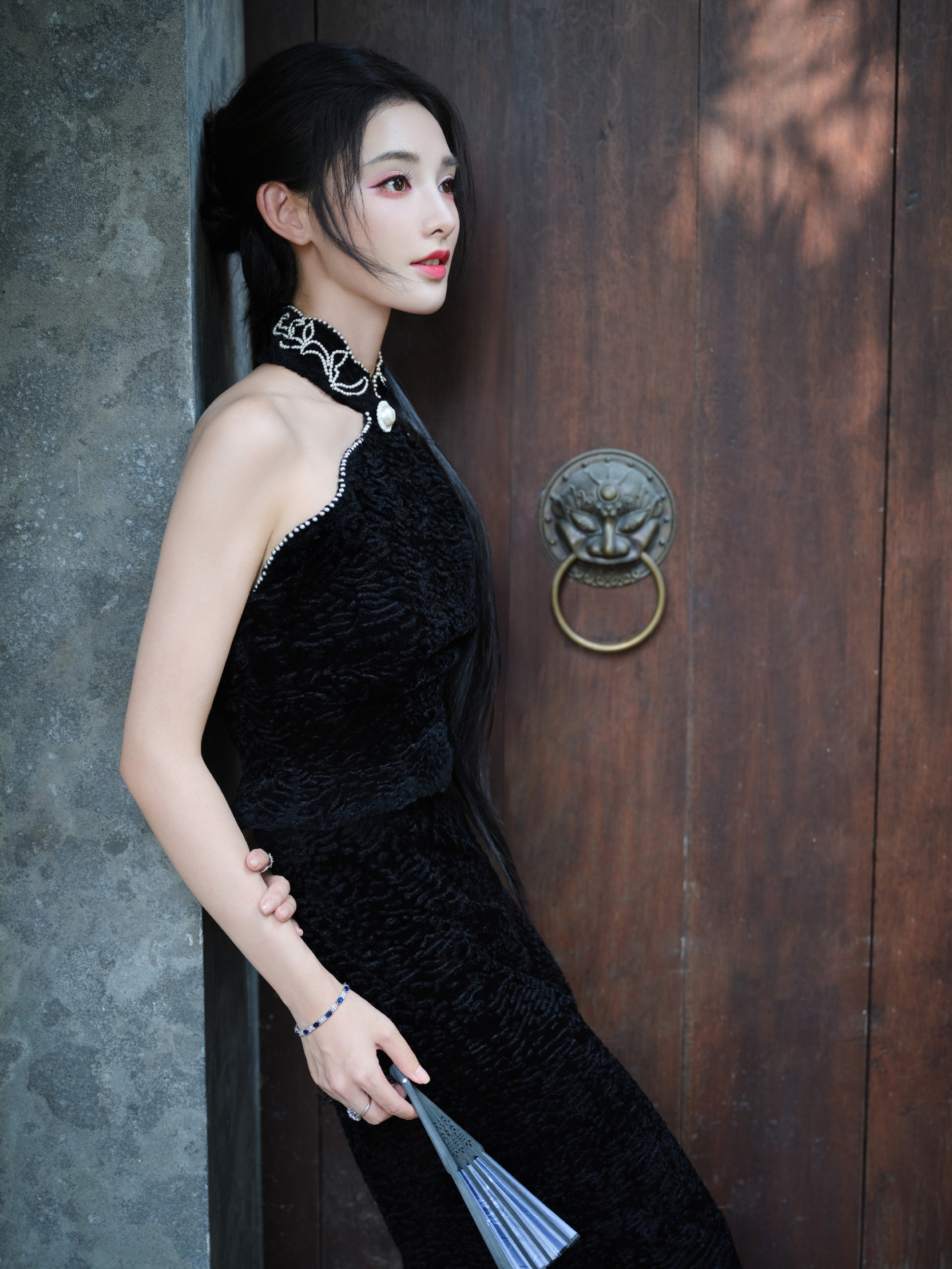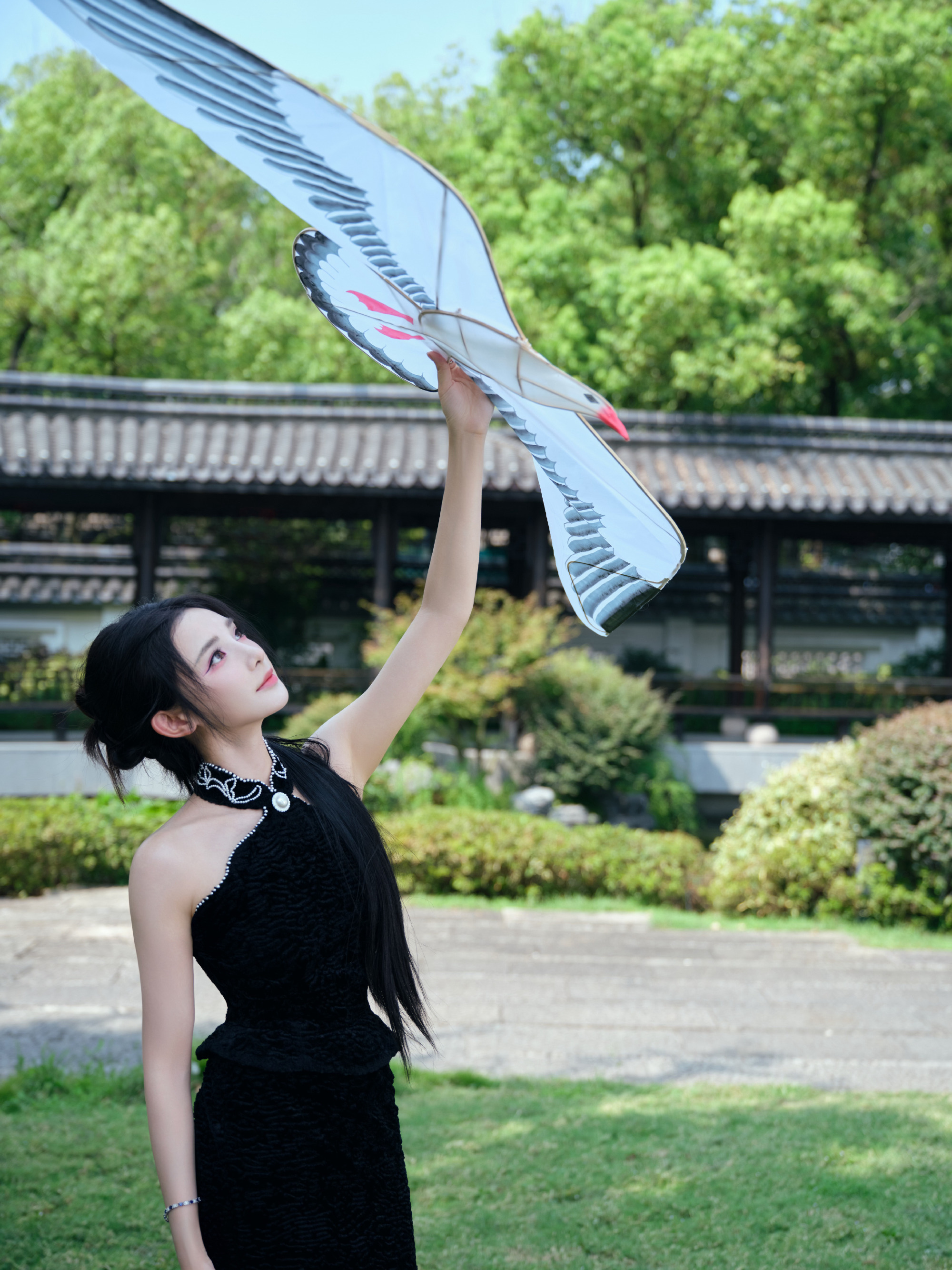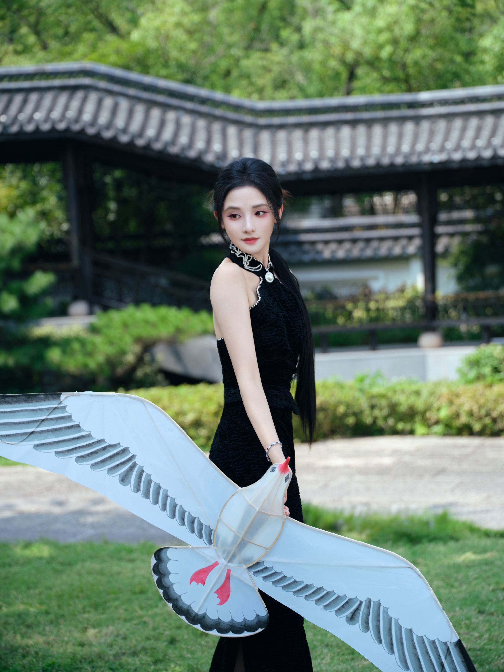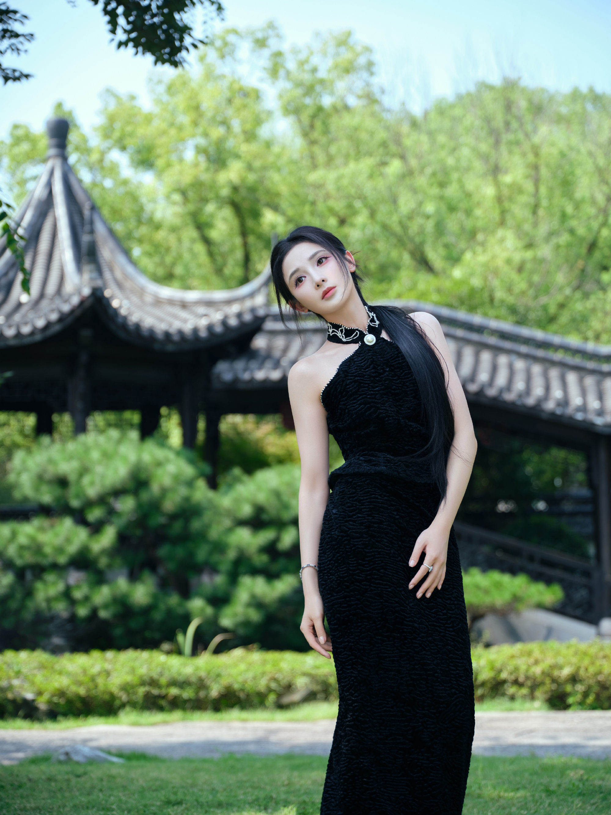 彭小苒秋日大片,明艳黑色长裙,满园绿意秋波扇动,湖光潋滟,悦目佳人