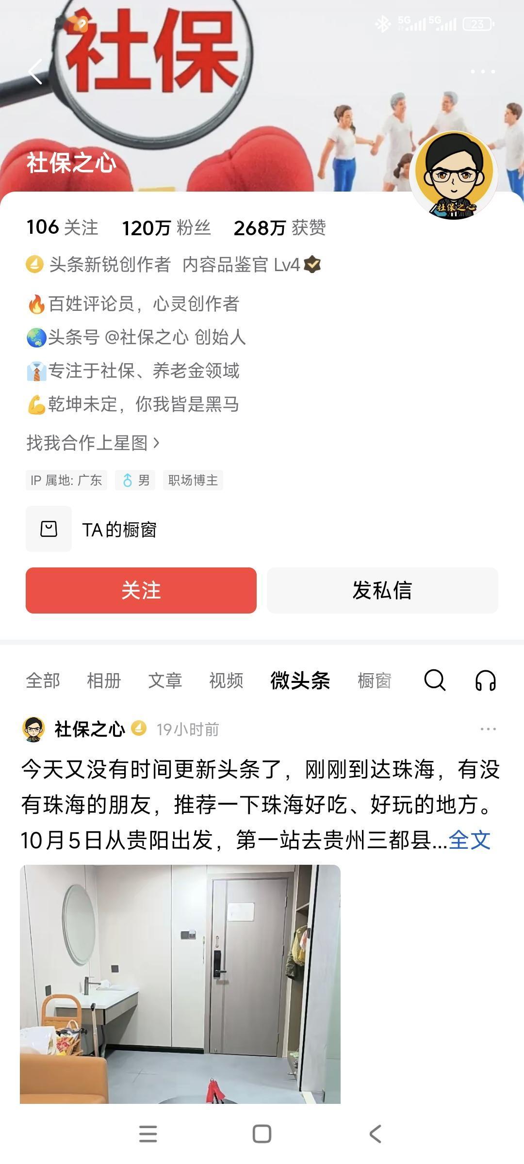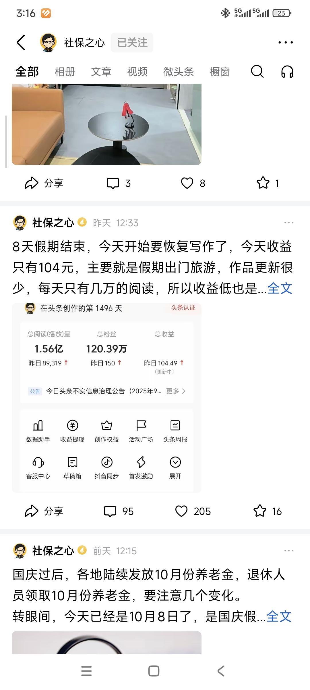 在头条上发现了一位大佬创作者,总共有120多万的粉丝,总阅读量已经达到了1.5亿以上。平时创作和社保,公积金相关的内容,几乎每篇文章的展现量都达到了几十万。 看了下这位大佬晒的收益,8万多的阅读量都能有上百元的收益,千次单价大概有一块多。真的是羡慕了。需要坚持多久,创作多少篇好的文章才能做到120多万的粉丝量,佩服!