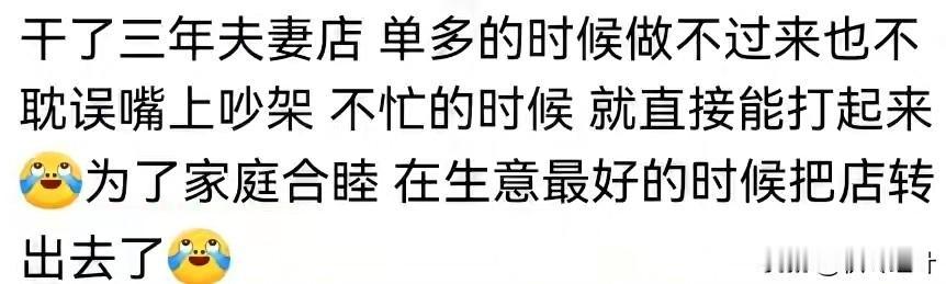 笑麻了,怪不得夫妻店“狗都不干”,妻子:根本不敢催菜 看完网友们的分享,真是笑到眼泪直流! 去过的客人都有共识:在夫妻店吃饭,千万别催菜!不是心疼老板辛苦,是真怕催菜的话,把后厨里正拌嘴的夫妻俩给惹毛了。 说不定前一秒还在为“谁洗菜慢了”“谁收错钱了”争得脸红脖子粗,下一秒听到催菜声,直接拿着锅铲从后厨冲出来,那场面想想都让人哭笑不得。 没客人的时候,夫妻俩能因为“生意不好是没做宣传”“今天该不该关店打麻将”吵半天;客人一进门,两人立马切换“营业脸”,笑容满面地招呼,变脸速度比翻书还快。 搞个免单活动,能为“亏不亏本”吵到忘记给客人上菜;聊到“谁挣得多”,能翻出半年前的账本较真; 甚至连“盐放多放少”“要不要转让店铺”都能成为吵架的导火索。网友调侃:“去他家吃饭,不仅能填饱肚子,还能免费看一场生活大戏,有时候盐都不用放,夫妻俩吵哭了,眼泪就是天然调料!” 可别看他们天天吵,吵完之后还是会一起收拾碗筷、一起算当天的收入,锅碗瓢盆的碰撞声里,满是为生活打拼的烟火气。这种吵吵闹闹却又彼此扶持的样子,不就是普通人最真实的生活吗? 你在夫妻店遇到过哪些搞笑的事?要是碰到老板夫妻俩吵架,你会选择悄悄吃瓜,还是赶紧吃完溜之大吉?