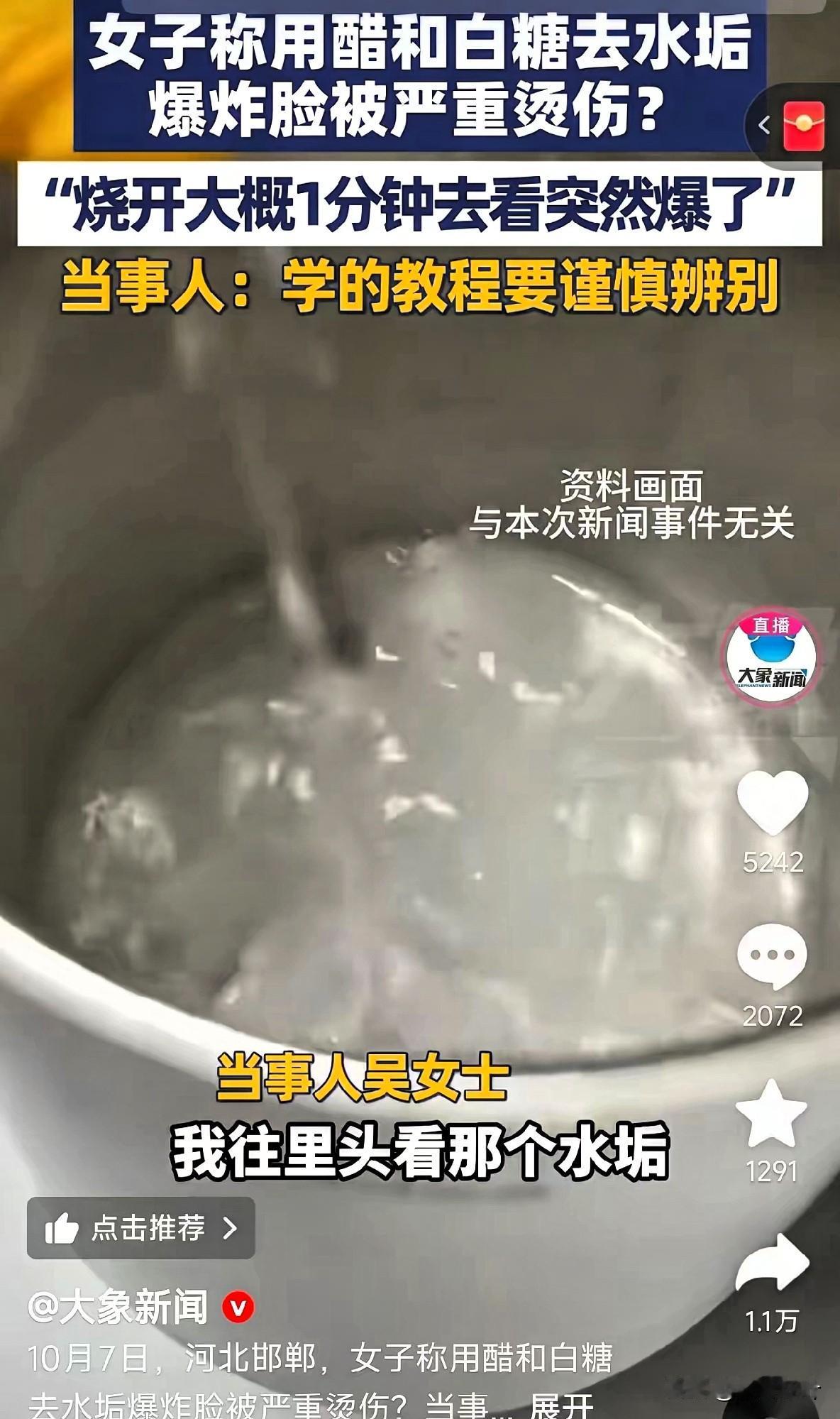 太危险了!河北邯郸一位女士的遭遇,看完真让人脊背发凉! 电水壶水垢难清理,她刷到“白糖+醋煮水去垢”的网红教程,觉得材料常见又方便,立马往壶里倒了白糖、加了醋,再兑点水通电加热。 才煮了一分钟,她就急着开盖看效果,结果“嘭”的一声巨响,壶内热水裹挟着蒸汽瞬间喷射而出,直接泼在脸上,导致严重烫伤,当场被送往医院救治。 这起意外绝非偶然,而是“网红妙招”的致命缺陷所致!网上不少所谓的生活技巧,要么是博主粗心大意,把“小苏打+醋”的正确配方误写成白糖; 要么为了制造“快速见效”的噱头,刻意隐瞒“煮后需关火放凉”的关键步骤。 要知道,醋遇高温会迅速产生大量气体,白糖在热水中会加速化学反应,密闭的电水壶内部气压急剧升高,此时开盖,就像打开了失控的“压力阀”,热水自然会喷涌伤人。 其实,安全有效的除垢方法简单又实用:只需往电水壶中倒入半壶纯白醋,加少量水煮沸,关火后焖30分钟,水垢便会自行脱落,用抹布一擦就能清理干净; 也可以将柠檬切片放入壶中,加水没过水垢,煮15分钟后静置,同样能轻松除垢。这些方法经过无数人验证,安全又靠谱。 过日子讲究的是安全省心,千万别被“低成本、高效率”的网红噱头迷惑。那些看似新奇的“神仙配方”,大多是博主为了流量凭空捏造,毫无科学依据。 你还被哪些“网红生活妙招”坑过?是用风油精擦家具导致褪色,还是用啤酒洗头发越洗越油?