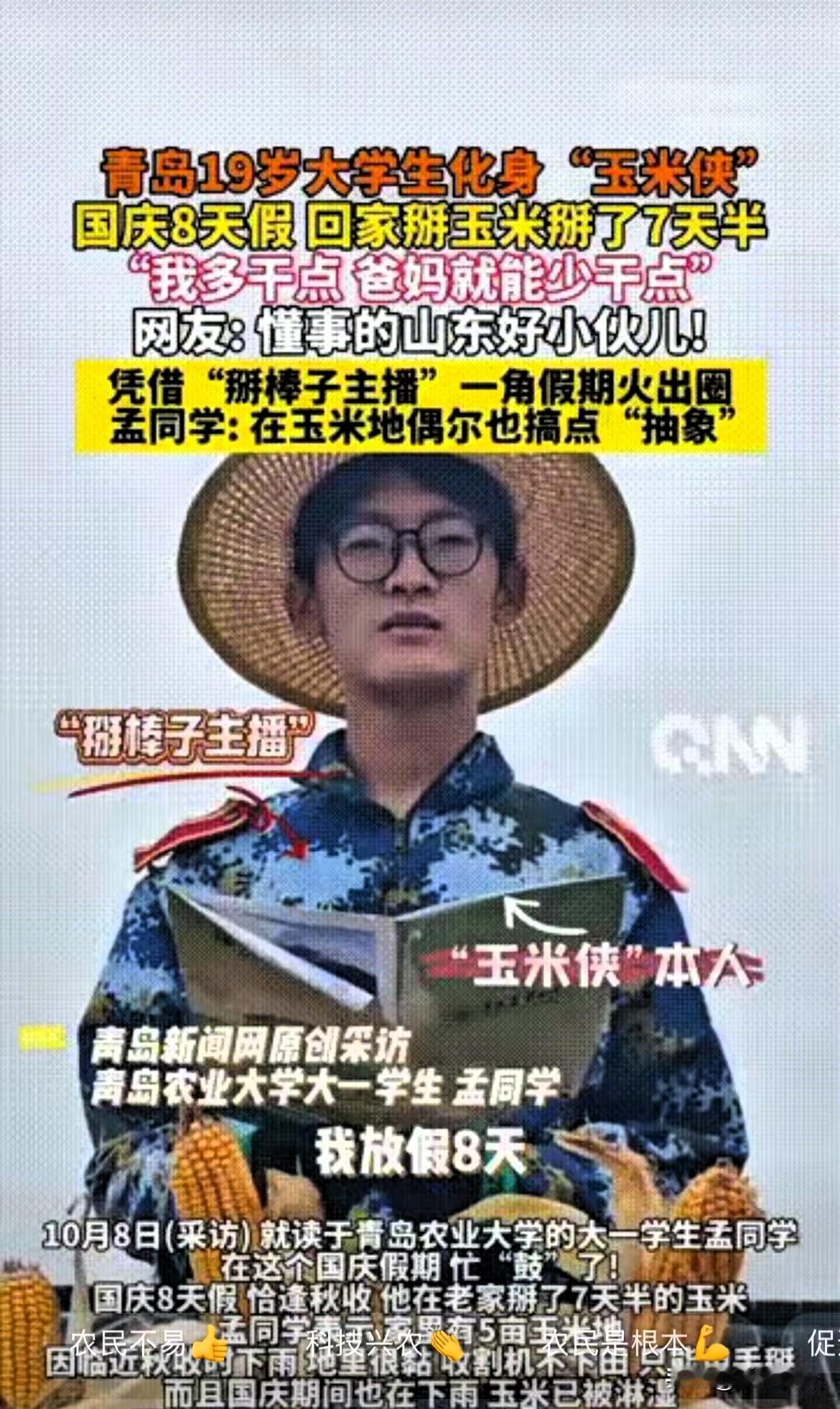 国庆假期的朋友圈,一半是山川湖海的打卡,一半是美食探店的炫耀,青岛农业大学这位大一男生的假期,却藏在5亩玉米地里,藏在清晨五点半的露水和深夜十一点的灯光里。 爸妈在街上摆摊卖水果,从早到晚挪不开身,田里的玉米却等着秋收。男生没犹豫,揣着妈妈蒸的白面馒头就下了地。 玉米叶边缘的小刺划得胳膊发红,他拽拽校服袖子接着掰;手心被玉米硬壳磨得发疼,随便缠个创可贴继续干——他怕太阳晒得玉米杆变脆,更怕爸妈收摊后还要惦记田里的活。 后来他叫上两个同学帮忙,可没干半小时,同学就被玉米须挠得发痒、弯腰弯得直不起腰。他赶紧递水壶、教技巧,说“累了就歇,咱不急,别让我爸妈操心”。三个小伙子搭着伙,把掰好的玉米装上车,他骑车、同学推车,夕阳把影子拉得老长,成了田里最动人的风景。 有天晚上干到11点,爸爸送来充电灯,看着他满是泥点的鞋子红了眼眶,他却催着爸爸回摊位帮妈妈。 回家后吃着妈妈煮的鸡蛋面,他还说“明天不用早起蒸馒头,买俩包子就行”,其实是怕妈妈休息不好。有人问他羡慕别人旅游吗?他说“咋不羡慕,但爸妈比玩重要”。 这哪是什么“别人家的孩子”,不过是把孝心落在了实处。比起“以后孝敬爸妈”的空头承诺,能替父母扛下一份辛苦、减轻一点负担,才是年轻人最该有的样子。 你小时候有没有帮家里干过农活?或者长大后为父母做过哪些“接地气”的小事?