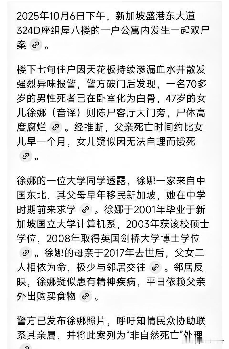刷到新加坡那则令人揪心的新闻时,心里像堵了块石头——47岁的剑桥博士徐娜,遗体在公寓里被发现,而卧室中,70多岁的父亲早已化为白骨。法医推测,父亲离世一个月后,徐娜才走到了生命尽头。 很难将“剑桥博士”这个光鲜标签,与“饿死家中”的结局联系在一起。 据邻居回忆,徐娜疑似患有精神障碍,多年来几乎不与外界接触,生活全靠父亲照料。父亲是她的监护人,更是她与这个世界唯一的连接。父亲突然离世后,失去生活能力的她,既不会出门觅食,也不愿离开这个充满父亲气息的家。 这一个月里,她或许在空荡荡的屋子里摸索过父亲的痕迹,或许蜷缩在靠近卧室的角落,感受着仅存的“陪伴”。直到最后一刻,她倒在客厅门边,手可能还朝着卧室的方向——那里有她最牵挂的人。 有人说这是一场彻头彻尾的悲剧,可在这份绝望里,藏着最纯粹的亲情:即便意识混沌,即便身陷绝境,她依然选择守着父亲,不肯独自离开。 更让人深思的是,邻里明知这对父女生活封闭,却鲜少主动关心;本应及时介入的帮扶力量,也没能敲开那扇紧闭的家门。这不是一个人的不幸,而是现代社会“人情疏离”与“救助缺口”共同酿成的遗憾。 你身边是否也有独居的老人或困境中的家庭?