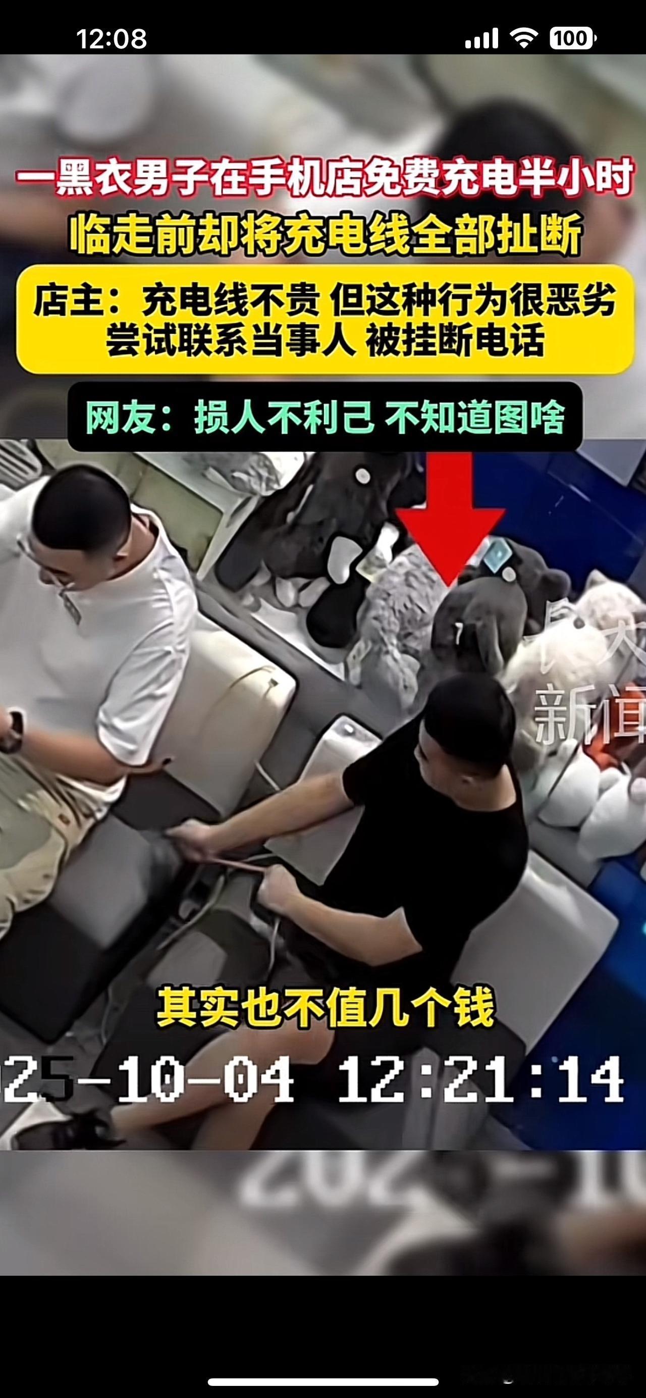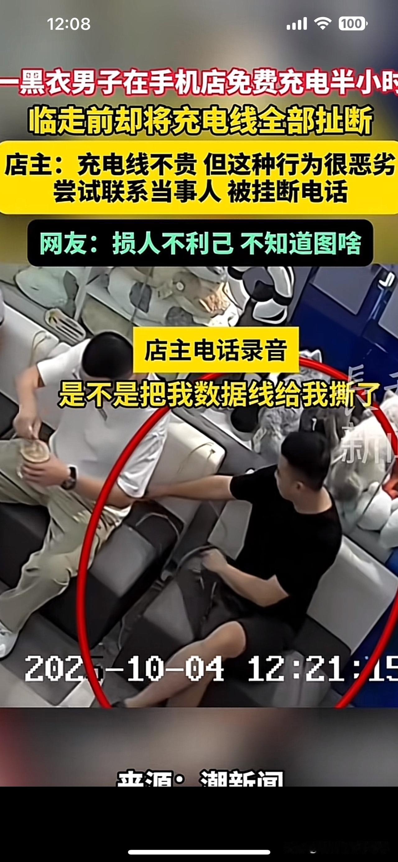 坏种怎么这么坏 ,给你充电,你却扯断人家充电线,还往沙发缝里塞嚼过的口香糖。事情曝光之后,终于打来了所谓的道歉电话,这不是知道错了,只是后怕了 事发10月4号的烟台。那这家手机店的老板呀,一直坚持做一件小善事店里呢,设有免费充电区,谁手机没电了都可以进来充一会儿。 这天中午 来了4位外地的游客,两男两女说手机没电了。老板笑着说,坐吧,甚至让他们在沙发上歇着。30分钟之后呀,这场好心收留变成了人性翻车。 黑衣男一边巡视店铺,一边背手舞剑,你以为他是检查线路吗?店里的那种一拖三的万能充电线,直接被徒手扯了几下,还不够解气啊,又扯了旁边同伴的那根充电线! 随手塞进了沙发缝里,真的是物以类聚,人以群分呐,这不是没素质,纯粹就是骨子里的坏 老板一开始不知道这些。等他忙完之后,看到破损才懵了。赶紧调监控,才发现这4个人早已逃之夭夭。 随后呢,联系上了这名黑衣男子,但是呢,对方开始死活不承认,后来随着舆论的发酵,才打来了电话表示道歉,还问人家老板有一点错没有嘛?你咣铛踢一下凳子干嘛?吓我们一跳!所以我把手机充电线扯断,把口香糖塞入沙发缝是有原因的, 都说滴水之恩,涌泉相报,可有些人你给他一滴水他可能给你给你涂口涂抹在给你一把土,别以为干点坏事没有人知道人在做天下看,你做的缺德事摄像头也在看!