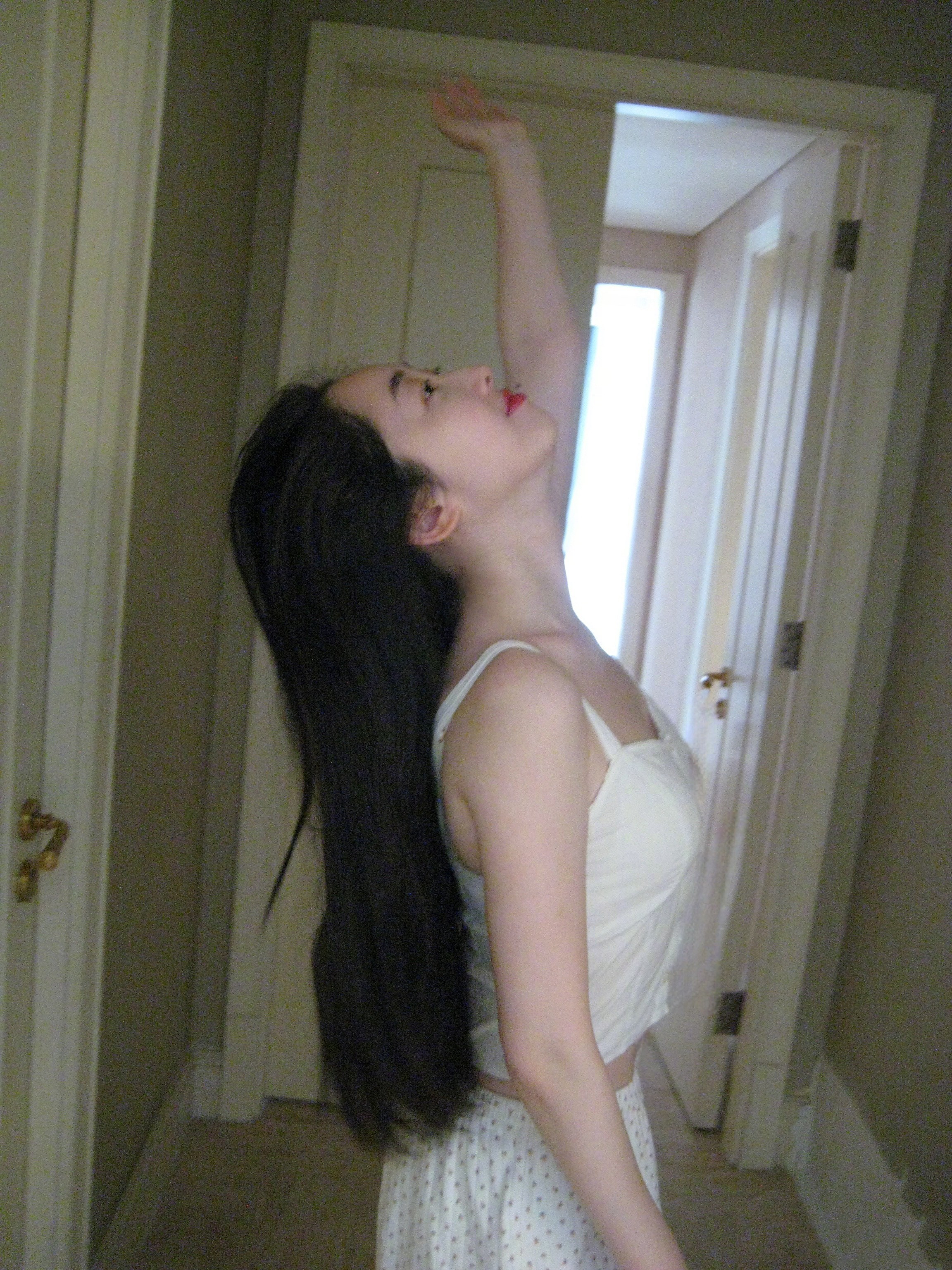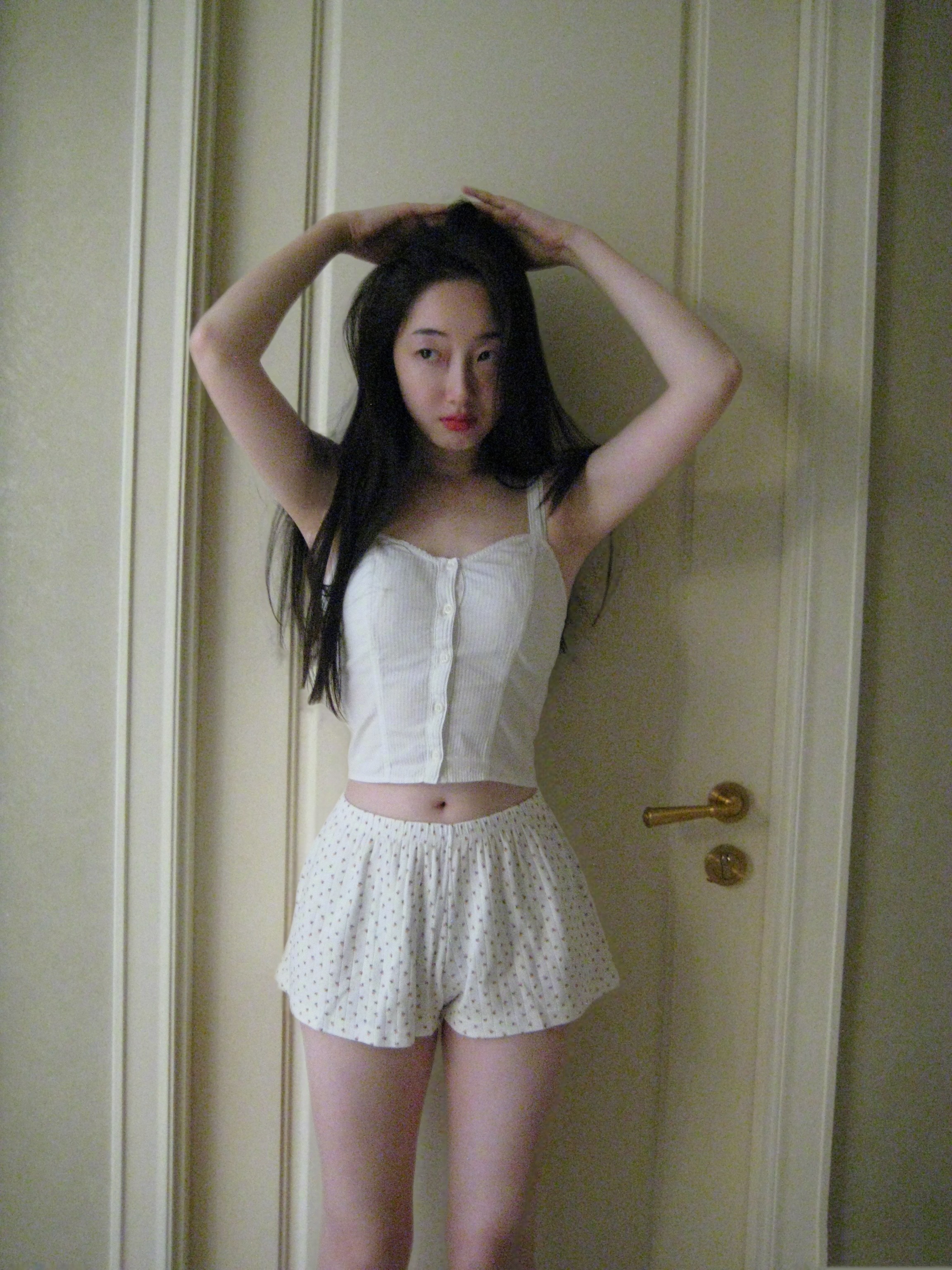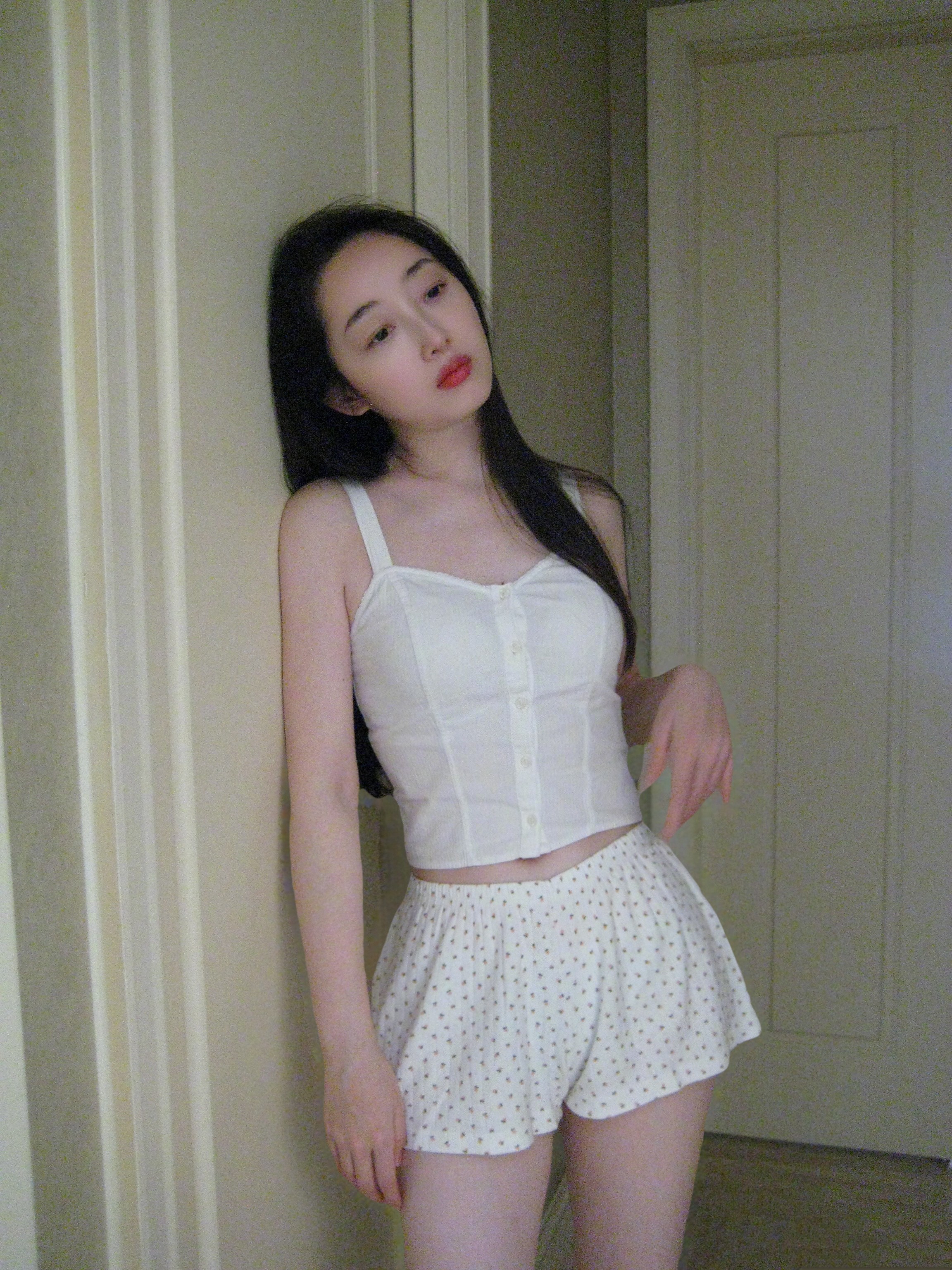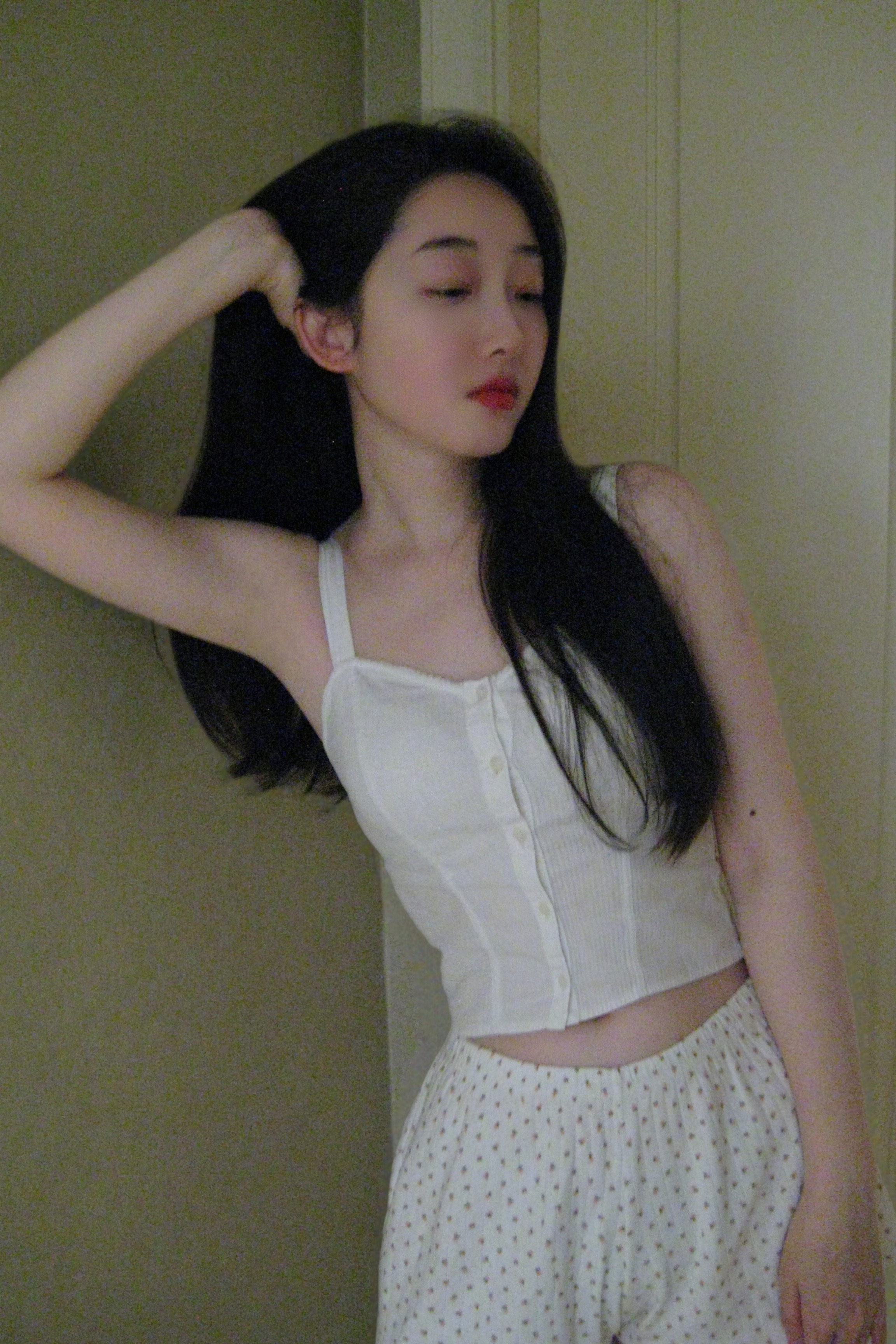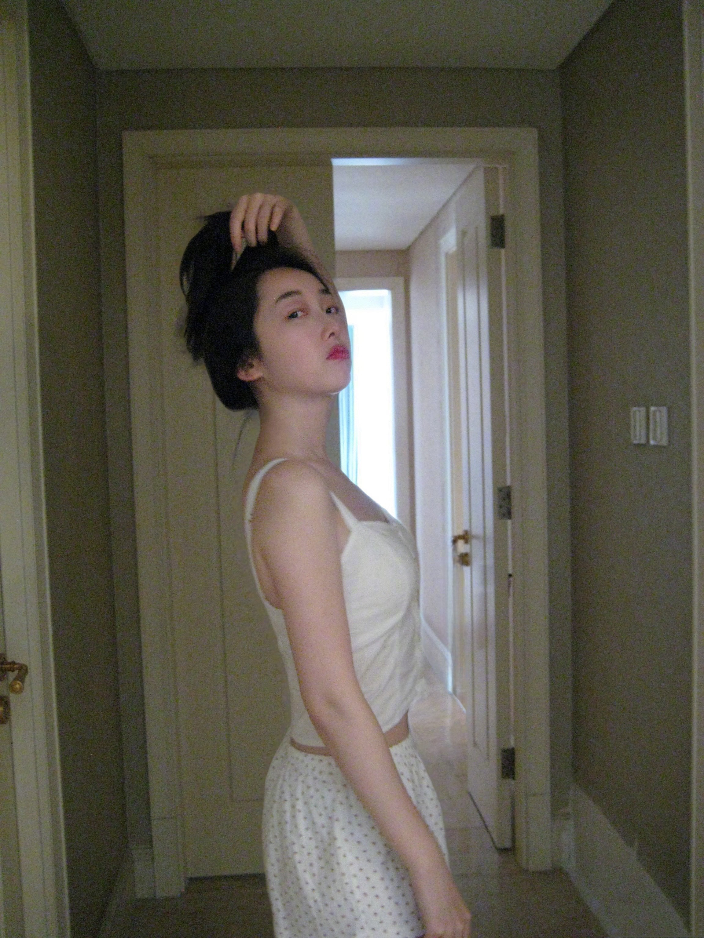 蒋梦婕甜美私服,白色吊带,轻柔甜美
