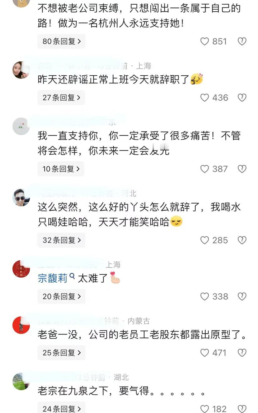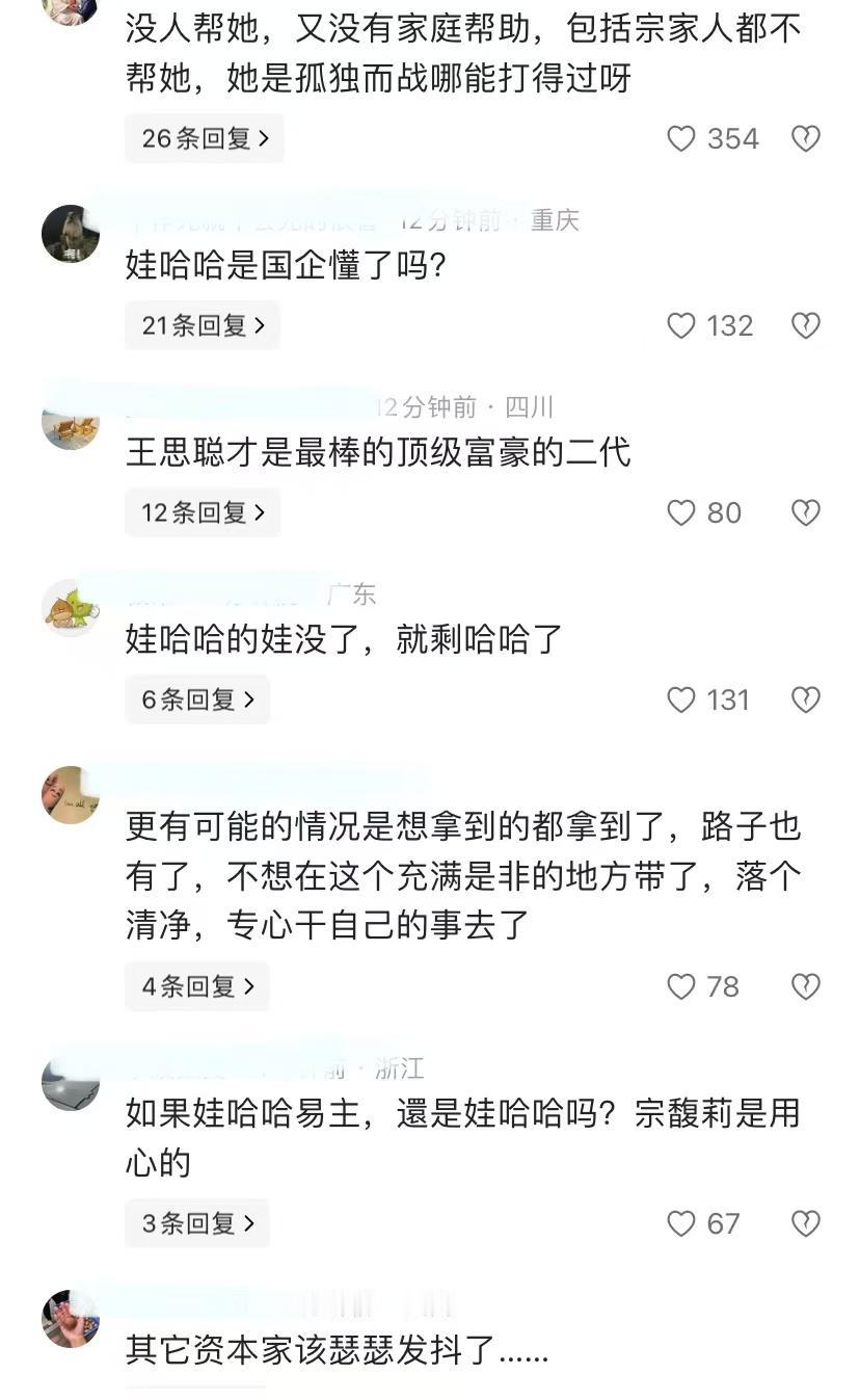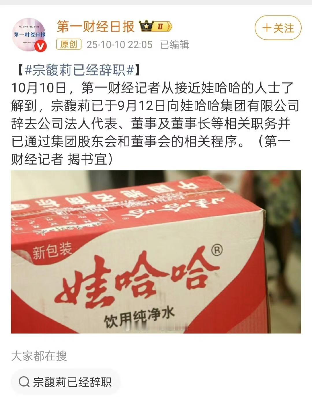 炸裂!宗馥莉已经辞职实锤了! 第一财经日报的发文一出立马就秒上热搜,网友们吵翻天!原来宗馥莉是在9月12日就已经辞职,难怪说字体越少,事情越大。宗老去世前就已经把娃娃哈最高利润的项目都外包给了家族名下的其他企业,这让宗馥莉接手后非常被动,加上信托分配给三个私生子事件,这无疑让宗馥莉在集团没办法立足立威。 也有不少网友对宗馥莉的辞职很诧异,认为这种辞职行为是无能的行为,还有网友认为宗馥莉是把所有业务转移到了宏盛,她现在是在开溜。无论如何,宗馥莉都不容易。突然就觉得王思聪才是最舒服的富二代,独生子的含金量在这里体现的淋漓尽致。
