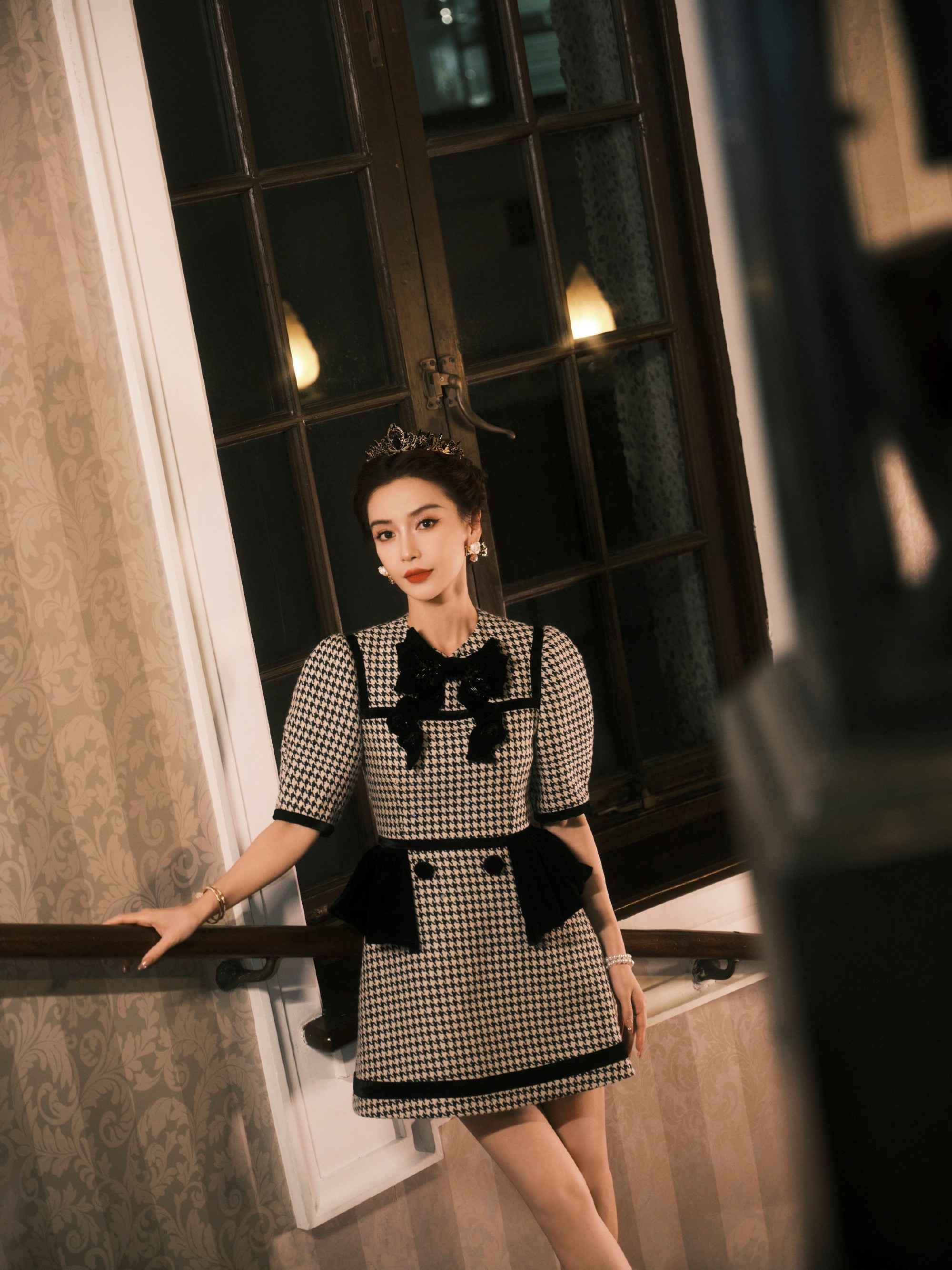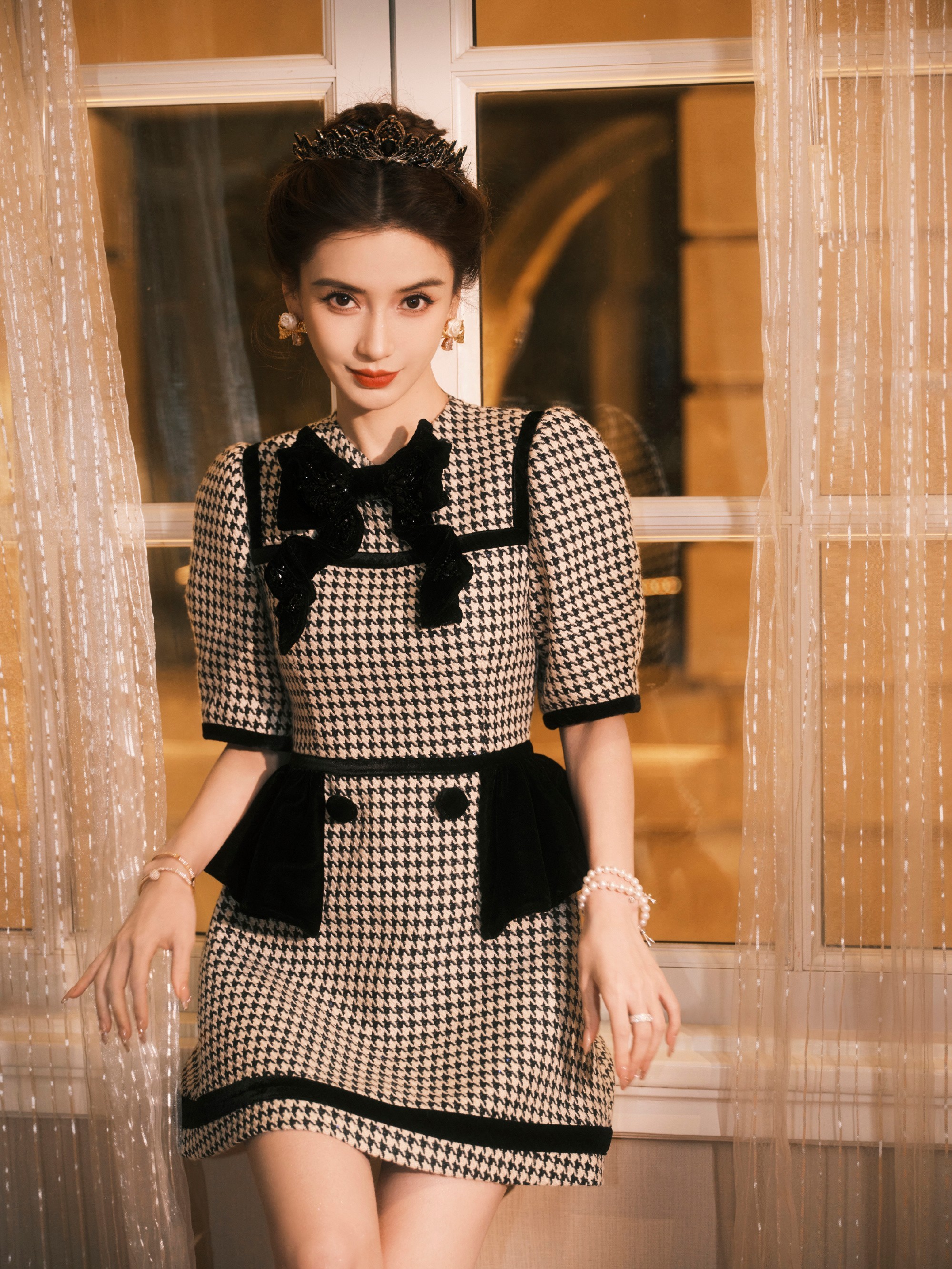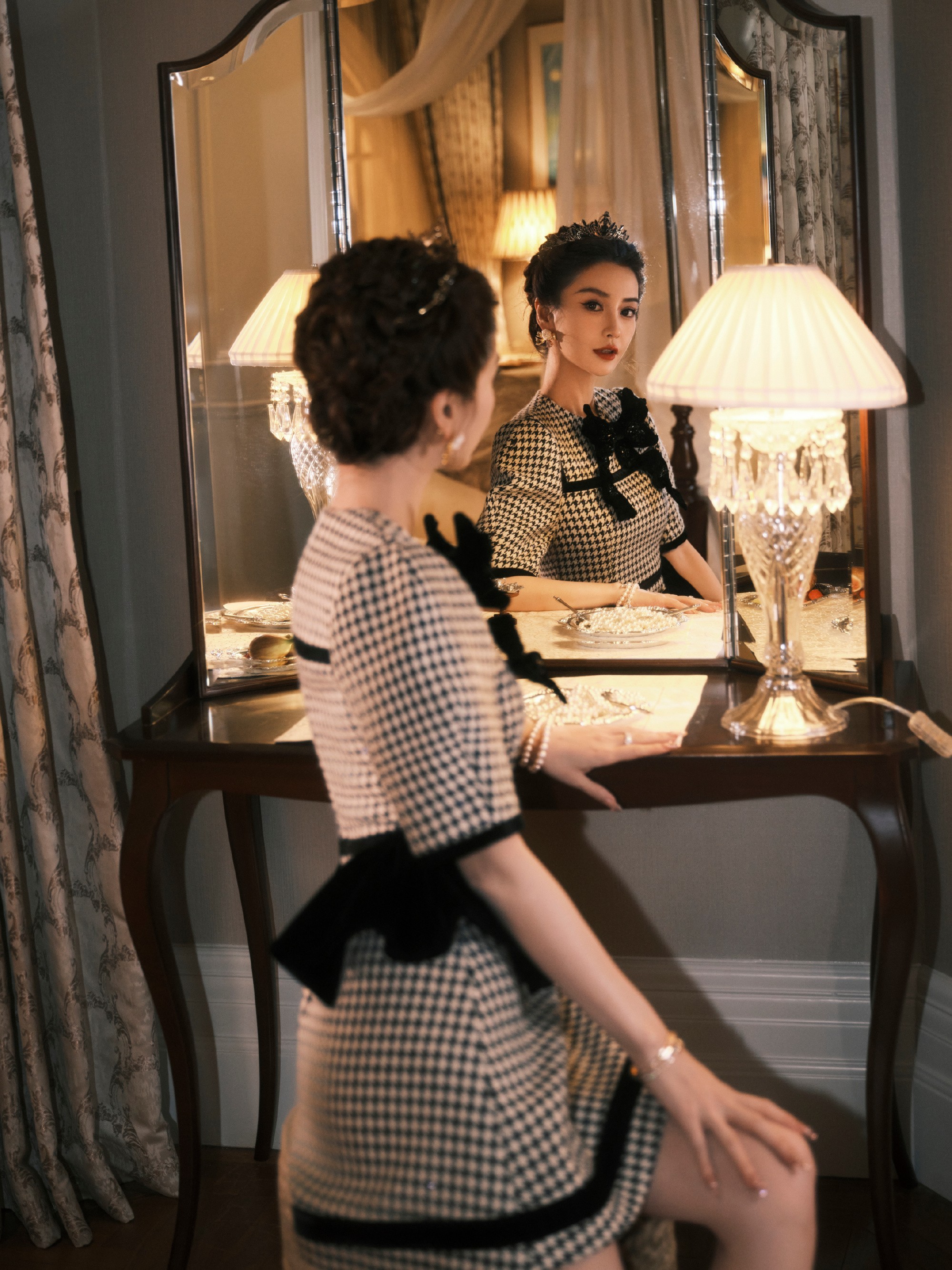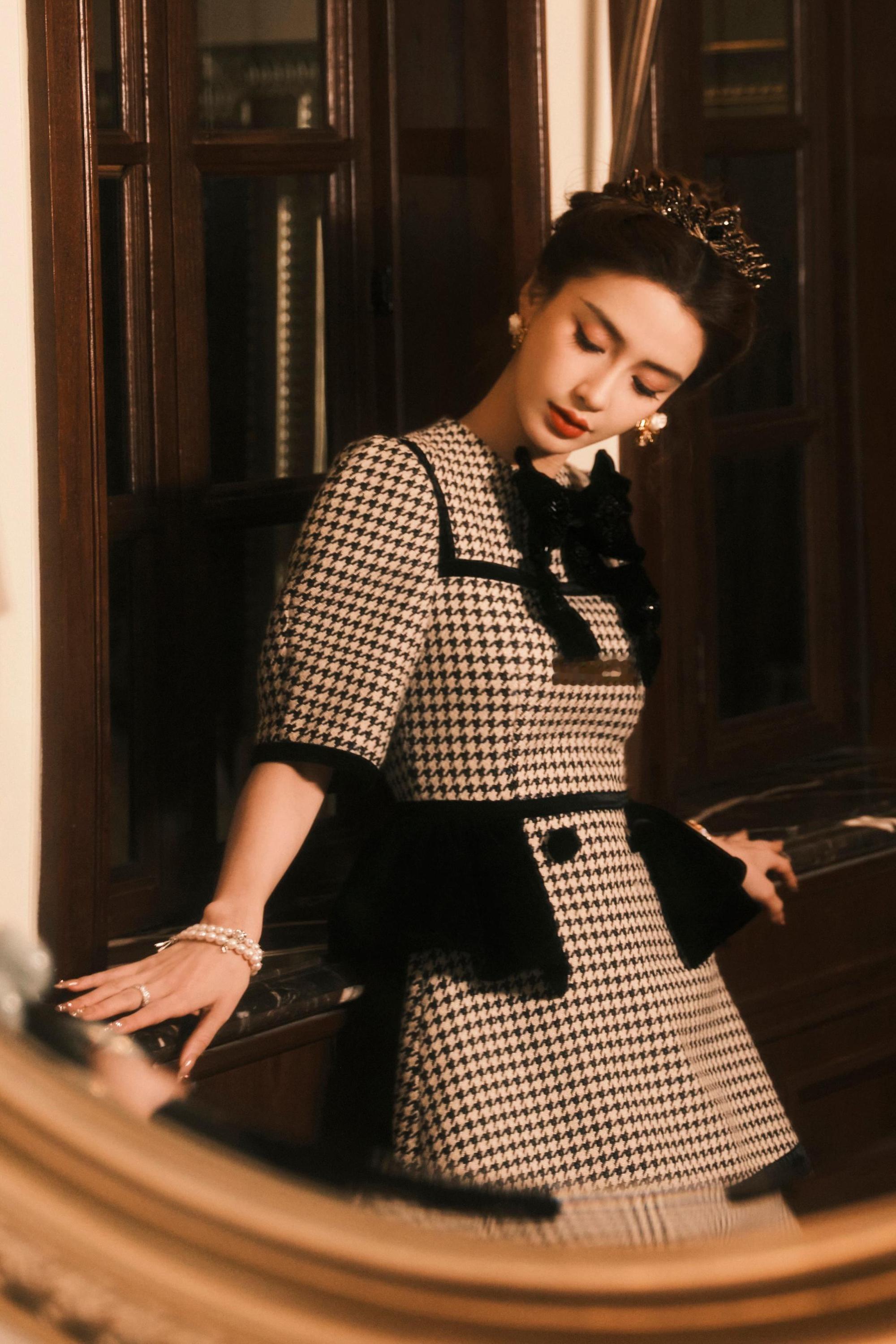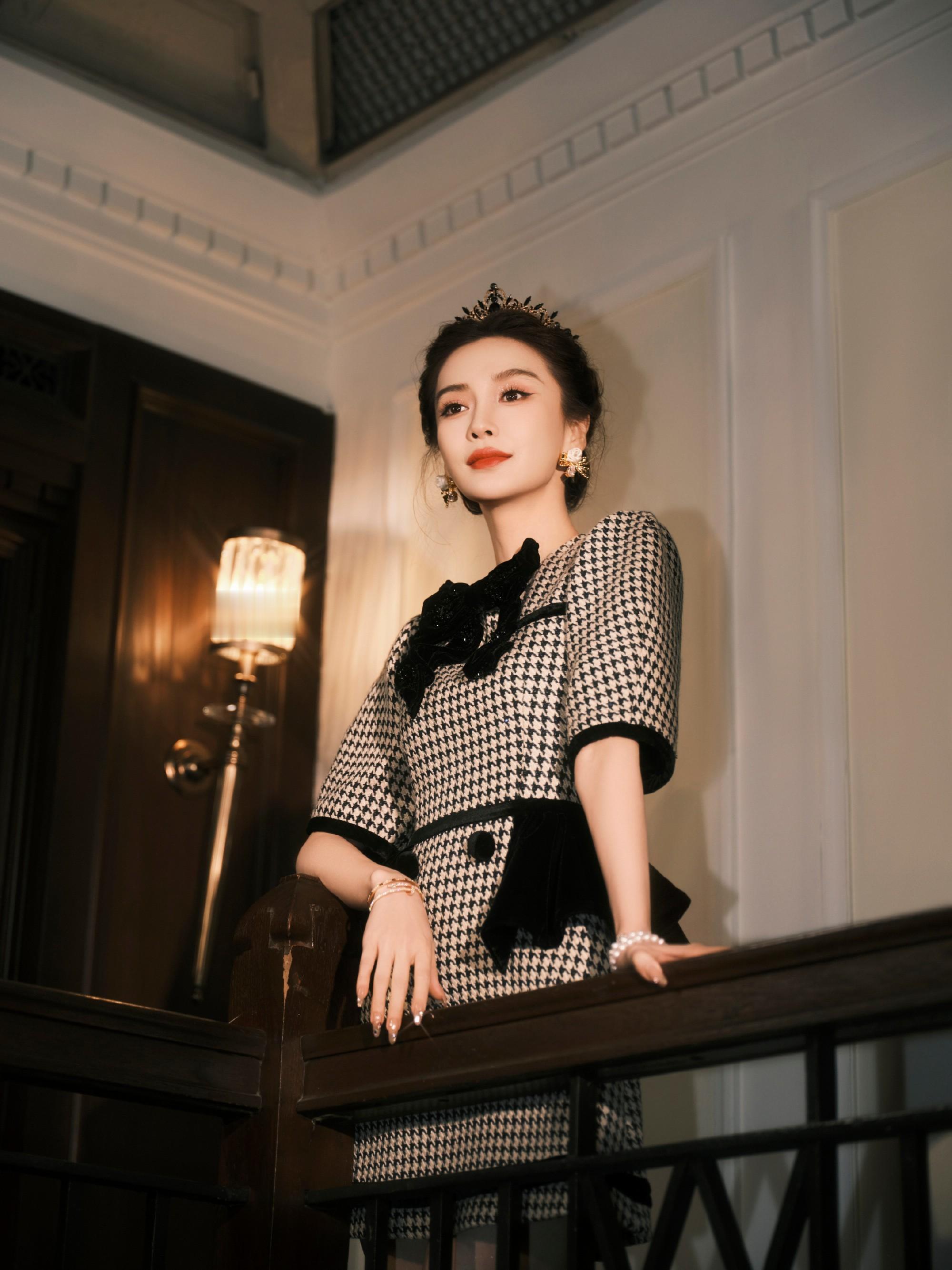 Angelababy(杨颖)身穿LeFame 2025秋冬高定黑白千鸟格套裙,头戴金色水晶皇冠,现身上海时装周LeFame大秀
