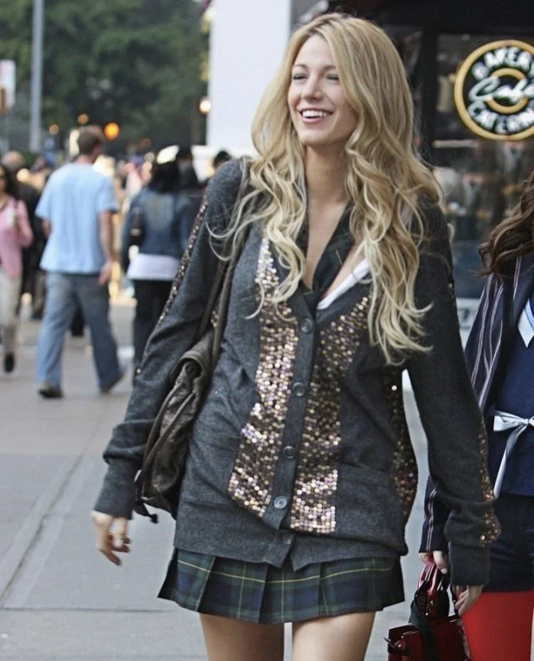 Serena van der Woodsen的穿搭堪称"老钱美学"的典范——不追逐logo却自带贵气,慵懒中藏着精雕细琢的细节。她的造型密码藏在三件套里:一件垂坠感极佳的MaxMara驼色开司米大衣,内搭Ralph Lauren真丝飘带衬衫,下装选择Theory的羊毛百褶裙或Frame的做旧牛仔裤,看似随意的组合实则暗含面料与剪裁的绝对考究。