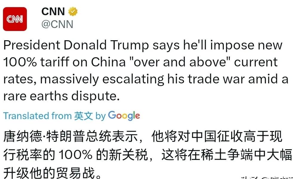 来自CNN的消息说,特朗普宣布将从11月1日起,对中国产品加征100%的关税。 事实上,我们对稀土的管制,让特朗普彻底恼火了,不满了,这是出来采取措施了。 只是,关税问题不是万能钥匙,并不能解决所有问题。这种讹诈的方式,我们并不会接受的。而稀土是关键一招,也会让美国充分感受到自己在这件事情上的无力和无奈。