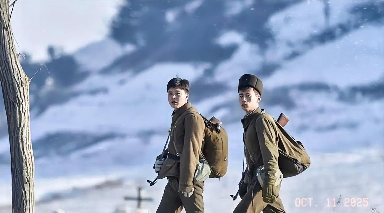 朝鲜的两名军人走在冬天的雪地里,他们用警惕的眼神目视着前方的一切。