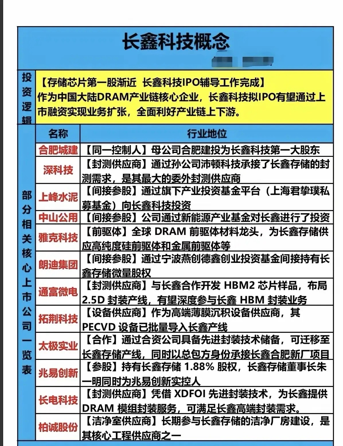 长鑫科技作为中国大陆DRAM产业链核心企业,IPO辅导完成后有望通过上市融资实现业务扩张,其产业链覆盖股权关联、设备供应、封测服务、材料提供、工程建设等多个环节,上下游企业将充分受益于长鑫的发展,形成了具有产业联动价值的投资生态。