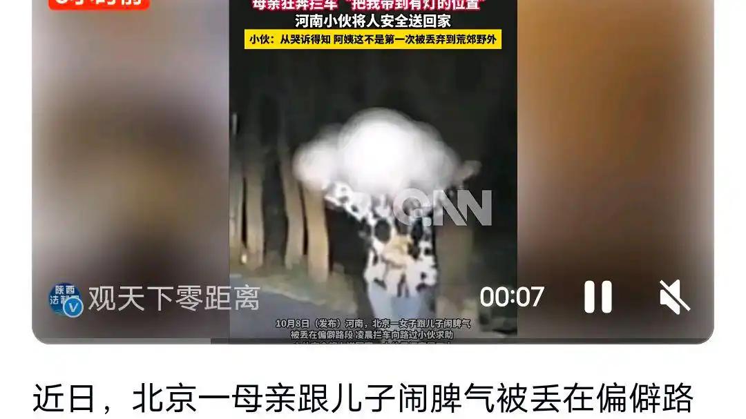 10月8日,有人发帖称,自己夜间行车,遇到一个满头白发的老年妇女拦车。发帖人说,自己把老人扶上车安全送回了家。老人对发帖人讲,自己是被亲生儿子给扔到荒郊野外的,已经有好多次了。 首先说,这个发帖人绝对是一个好人。能够想到,深更半夜、老人拦车,这要是一般人还不得多想:是不是碰瓷、讹人的?拦路抢劫的?还不赶紧打方向一脚油门跑开。这里说的‘一般人“也包括我自己。 第二是想说,天下无不是的父母。即便父母有千错万错,做儿女的也不能把父母一扔了之,是吧?这样做还有一点人味吗?被儿子遗弃荒野 母亲狂奔拦车求助