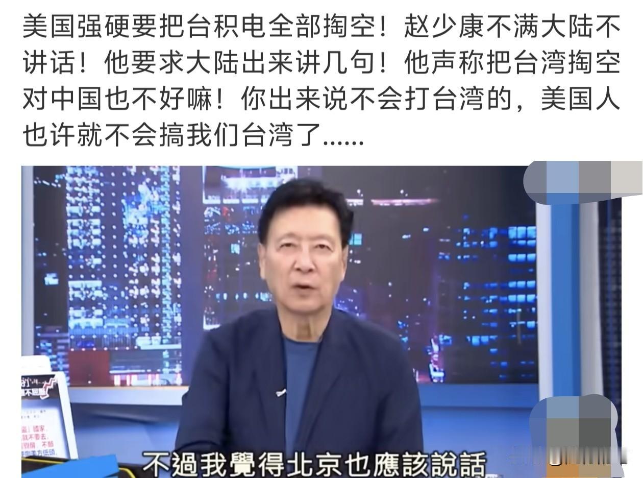 赵少康真的是年纪越大越令人无语了,什么事都要推到大陆身上,荒谬至极。 赵少康多次在自己的节目中对大陆吐槽还不算,11日还专门大张旗鼓的开记者会污蔑大陆介入国民党主席竞选,真的滑天下之大稽。 看来郝龙斌的民调不如郑丽文,赵少康真的很急,千方百计的想给郝龙斌制造声量,所以思来想去又把目标对准大陆。 其实这已经不是第一次赵少康把责任推到大陆这边了,近期因为美国要求台积电五五分,赵少康居然在节目中对大陆抱怨起来了,诡辩称大陆应该要承诺不用武力对台湾,美国就没有借口挖空台积电了,很明显赵少康认为台积电被美国挖空都是大陆的责任。 赵少康作为一个媒体人,在无凭无据的情况下多次公然摸黑大陆,居心之坏与民进党政客相比有过之而无不及,迟早没有好果子吃。