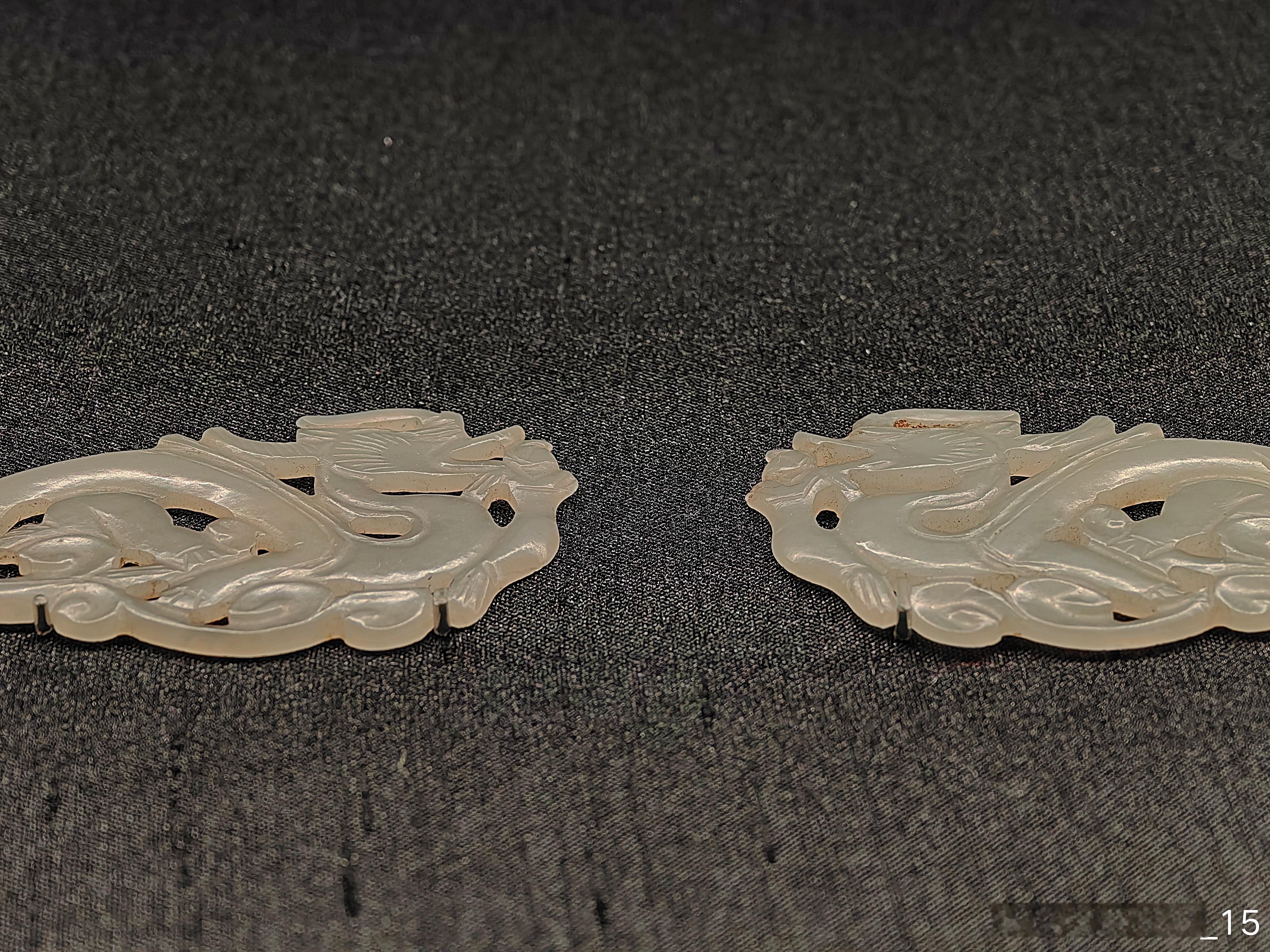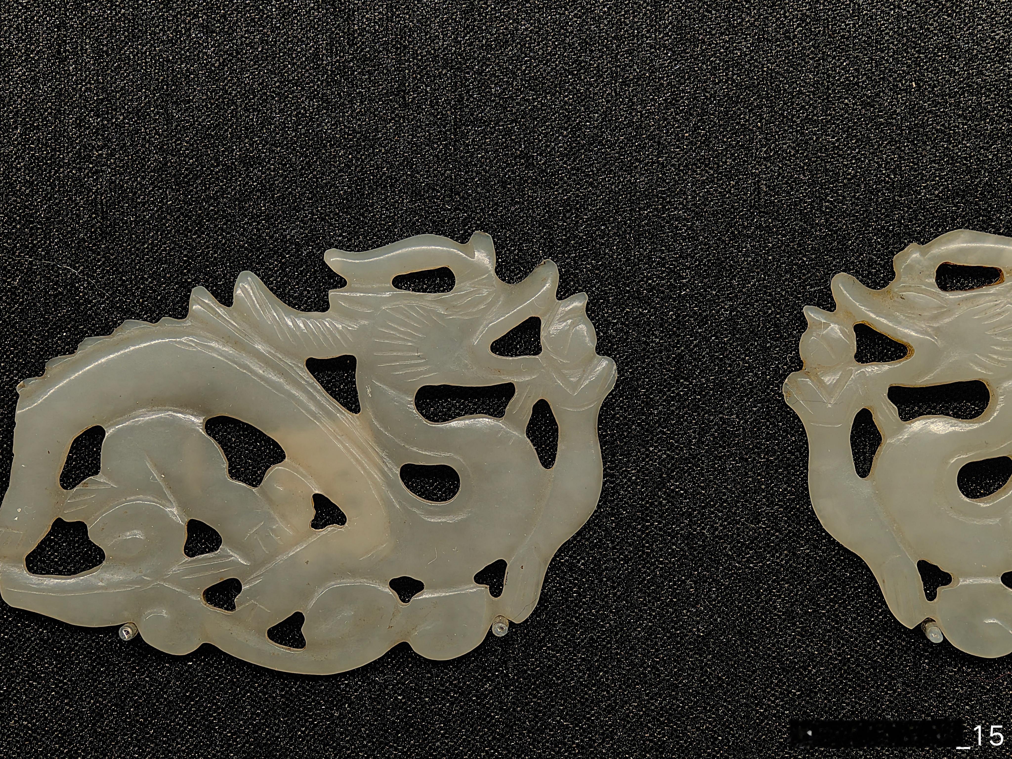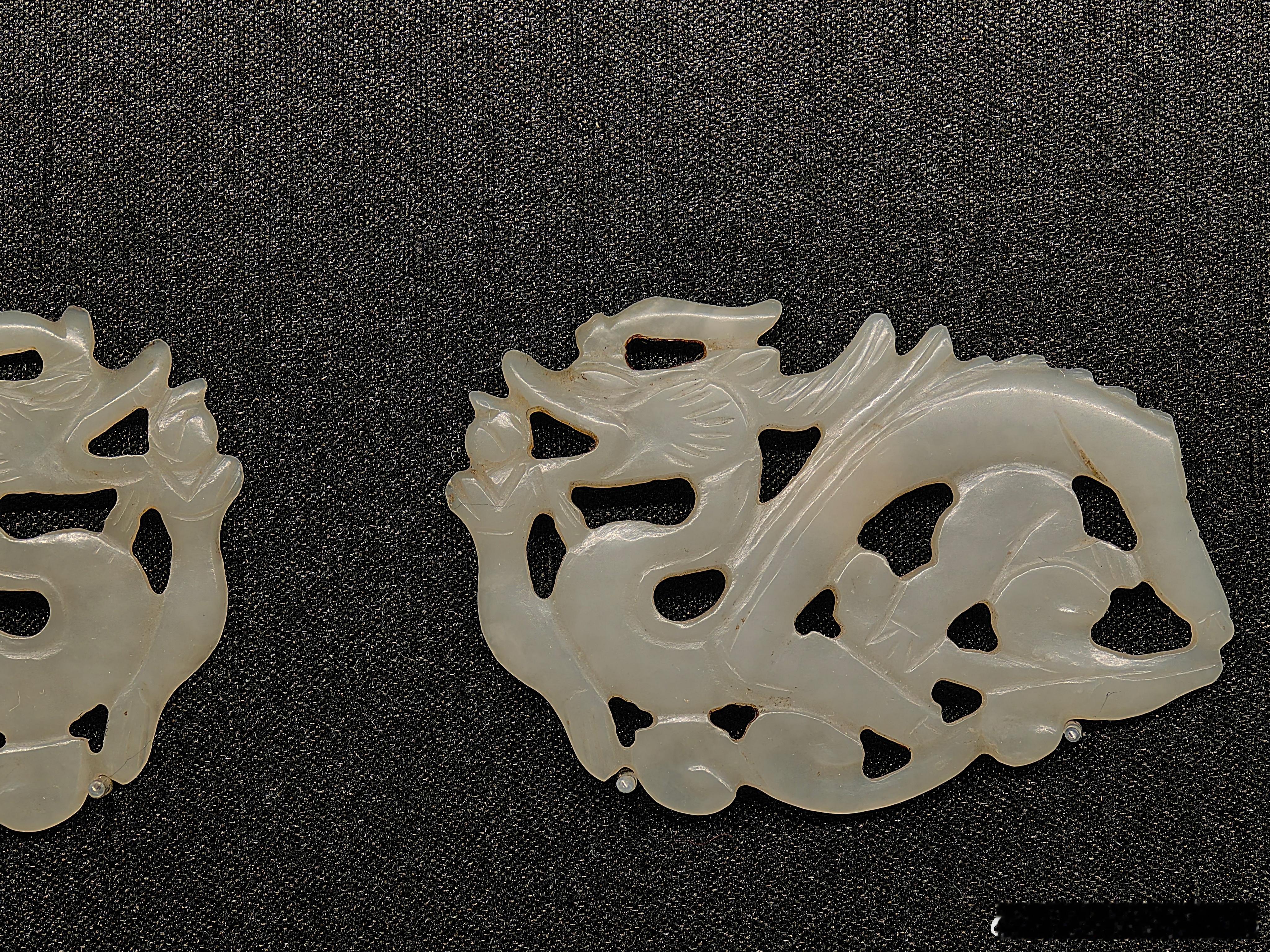 这对簪首以白玉雕刻而成。单面片雕,以对开工艺雕刻成龙的形象,龙身线条流畅,蜿蜒曲折,展现出灵动的姿态。因采用了镂空雕刻工艺,让龙的形象更具立体感。龙尾部被切成直榫,可以镶嵌其他材质的钗体。