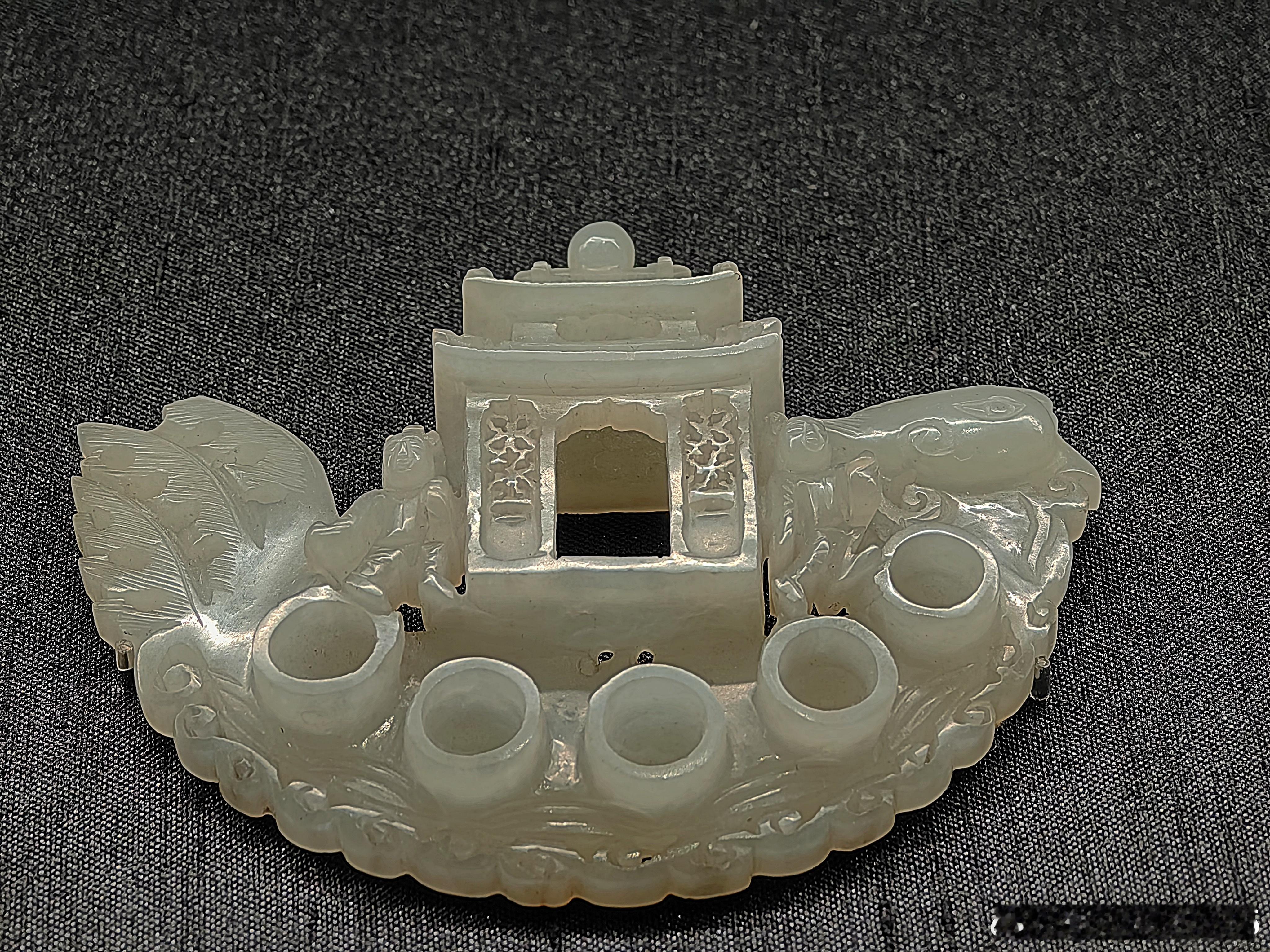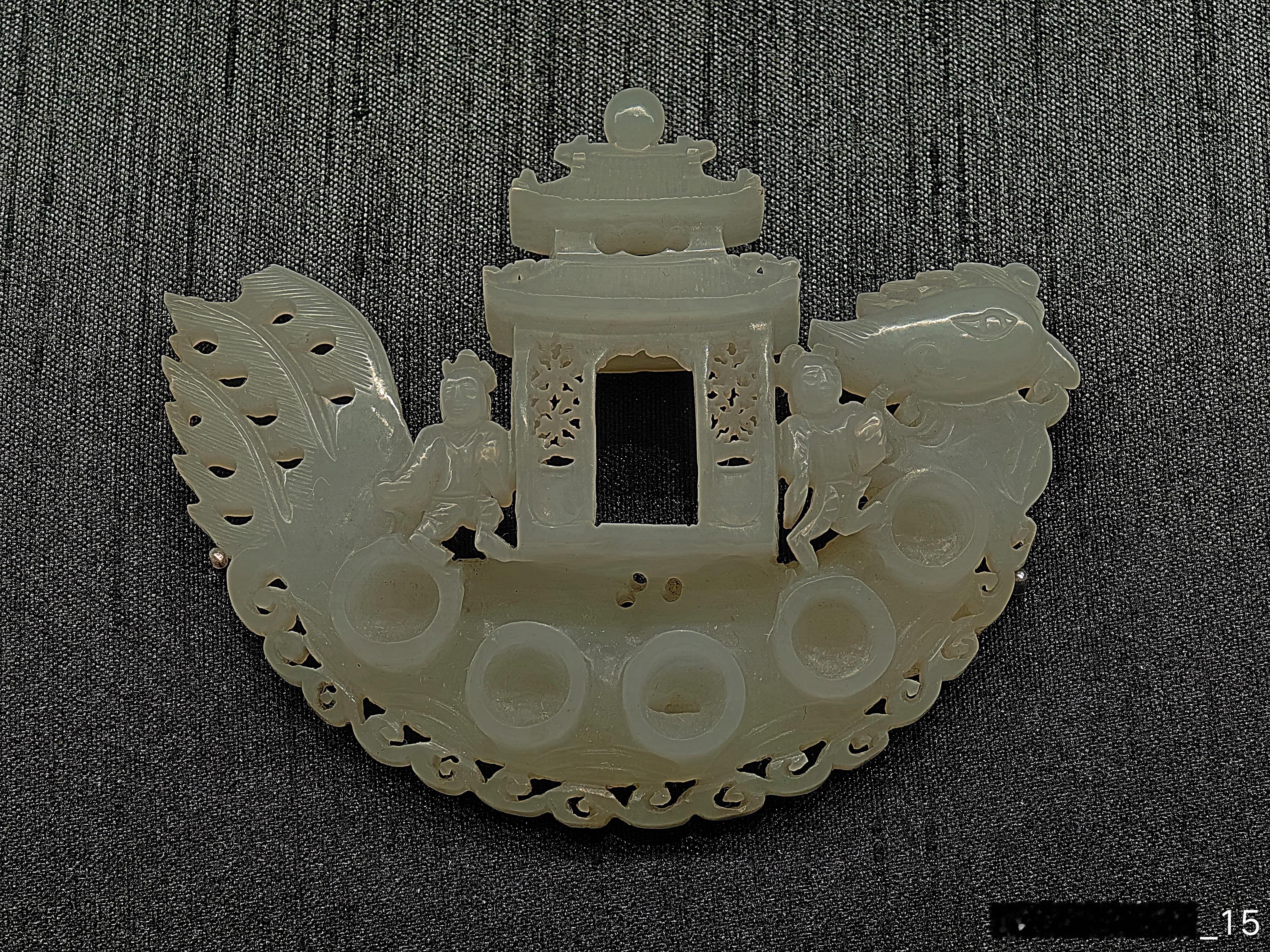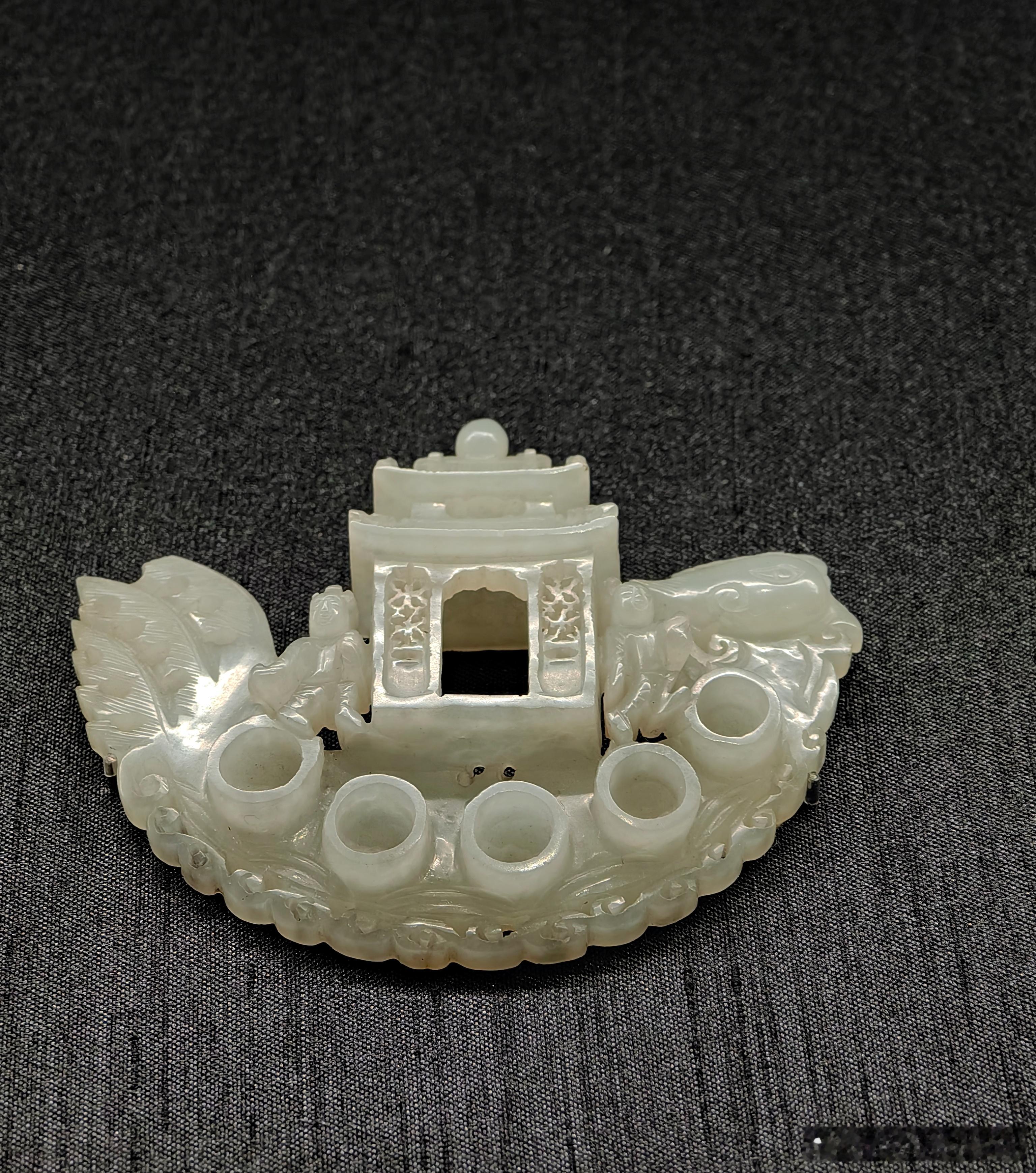整体呈现出凤舟的造型,极具巧思。舟上雕琢有亭阁,亭阁的细节丰富,门窗等结构清晰可见。亭阁两侧各有一人物形象,人物姿态各异。舟身结合凤凰的元素,凤的形态栩栩如生,羽翼雕刻细腻。此外,舟身上还有一些圆形等造型的装饰,增添了整体的丰富性。