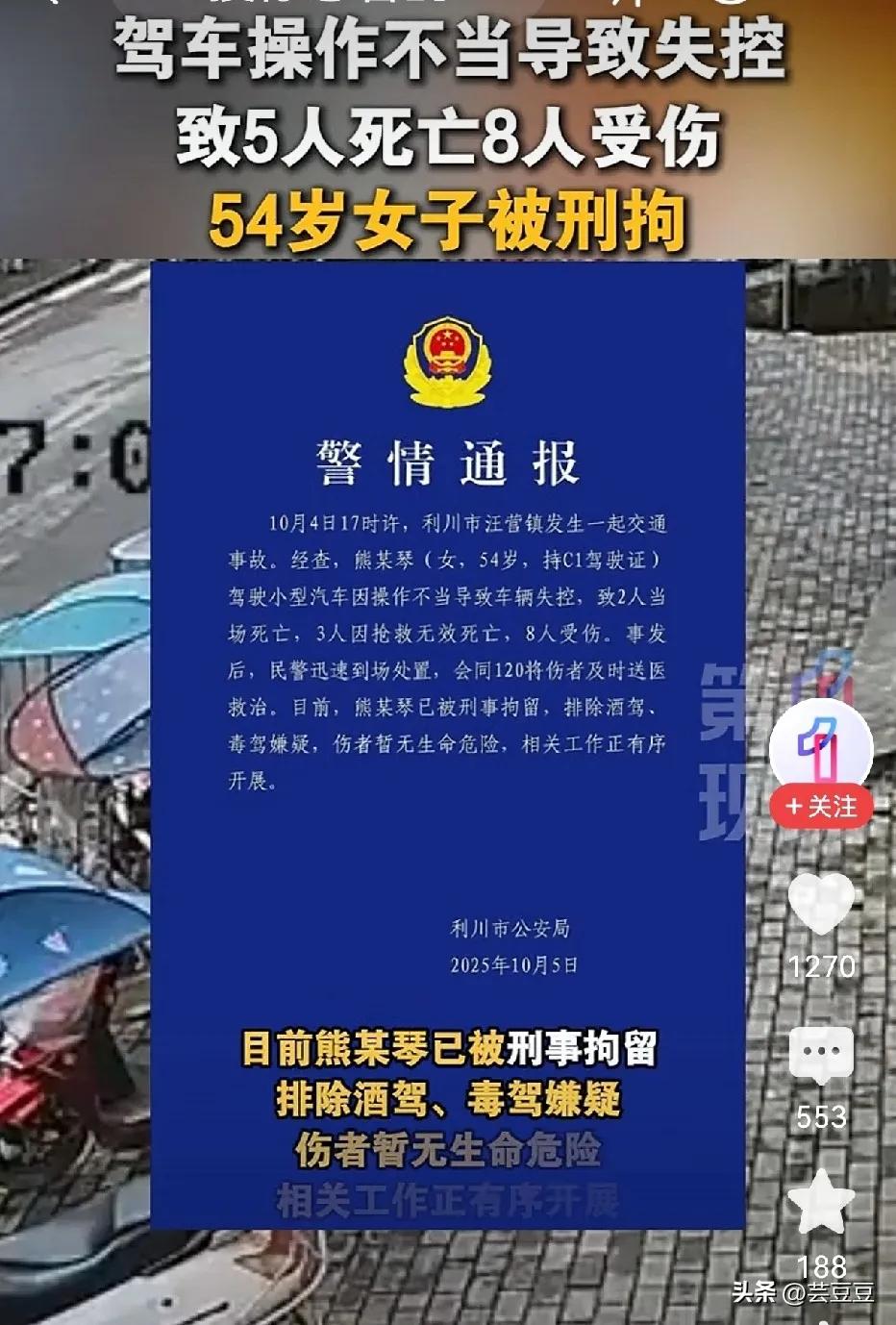 13个家庭的天塌了!中秋再也无法团圆了! 因为一次操作不当,5条人命没了,8个人躺在医院里,13个家庭的日子瞬间破碎了。 10月4号,湖北利川一54岁女子驾驶小型汽车因操作不当导致车辆失控,致2人当场死亡,3人因抢救无效死亡,8人受伤。 面对5条人命的丧葬费、死亡赔偿金,再加上8个伤者的医疗费、误工费,就算是300万的三责险,面对这等惨剧也远远不够。 明天和意外,真不知道谁先到来,出行安全是第一位的,大家认同吗? 网友评论: 不要把开车当成时尚,有些人即使拿到驾照也不适合开车,不适合开车的就不要强迫自己去开车,不适合上高速公路的就不要轻易上高速,开车的风险时时刻刻存在。 这样的恶魔应该判处死刑! 这吊水平也敢开车上路,她的驾驶证怎么考出来的,拒绝马路杀手。 买车上路就应该要强制购买大额意外险,不够买不能上路。现在机动车多,这样一句没钱,搞得双方都精疲力尽。 这种倒霉事谁也不想发生,主要是这些人对危险的严重性意识不到,才闯了个大祸,造成了如此严重的后果,确实很糟心。 建议吊销她的驾照终生禁驾,别几年后她又开车又撞车危害他人。