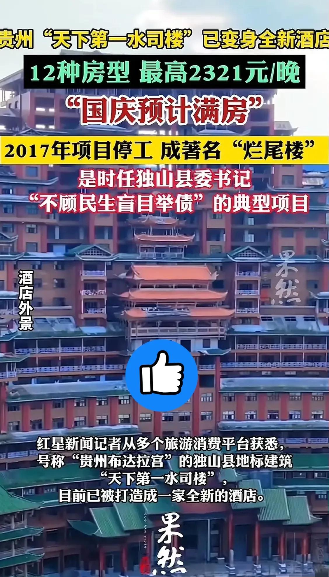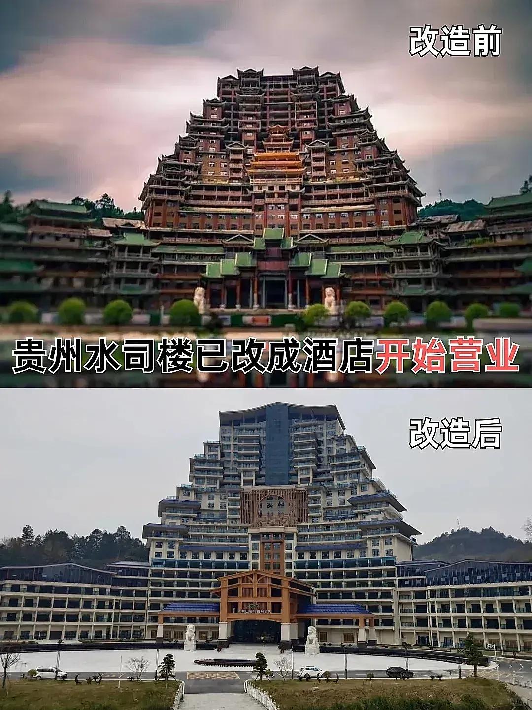 这下不止贵州,全国都知道了! 没2亿烂尾楼“天下第一水司楼”变身啦! 水司楼建筑很有特色,外观和主体结构都很有美感,改成豪华酒店既合理利用了废弃资源,又能减轻地方的财政压力。国庆期间已经满房,连3688一晚的行政套房都被抢光了。 网友评论: 为什么要改?直接收回改为贵州人民活动中心不好吗?里面设图书馆,羽毛球馆,乒兵球馆,绘画馆,曲艺舞蹈馆,智能科技馆,棋类馆,增加老百姓人文精神建设!也会成为贵州仿古建筑的典范。 改的真差劲,没有了之前建筑飞檐走壁之感。 改之前是少数民族玄幻风味,改之后是直接成了古墓派! 外观不如之前好看了,还不如不改省下了资金,还能成为特色建筑。 本来是古代恢宏宫殿,现在成了大众化的现代建筑。 去贵阳时,特地下高速到独山县吃牛肉火锅,又便宜又美味。 不改也能当酒店啊?这种现代风格太普遍了,不如之前的有特色。