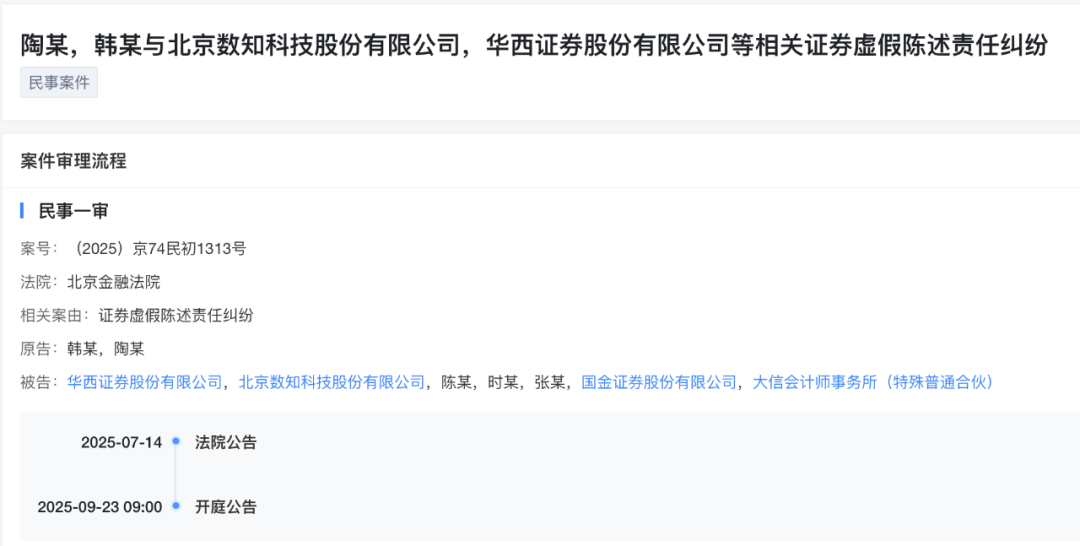 根据天眼查信息,原告韩某、陶某,与被告华西证券、数知科技等证券虚假陈述责任纠纷案件,已于9月份开庭审理。