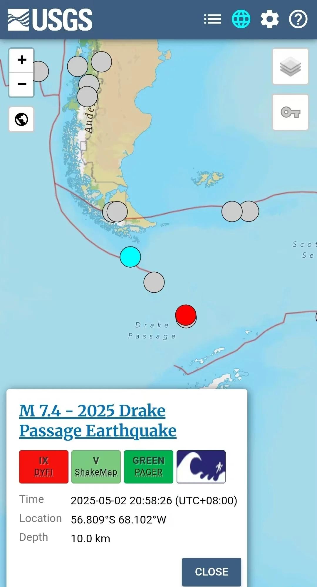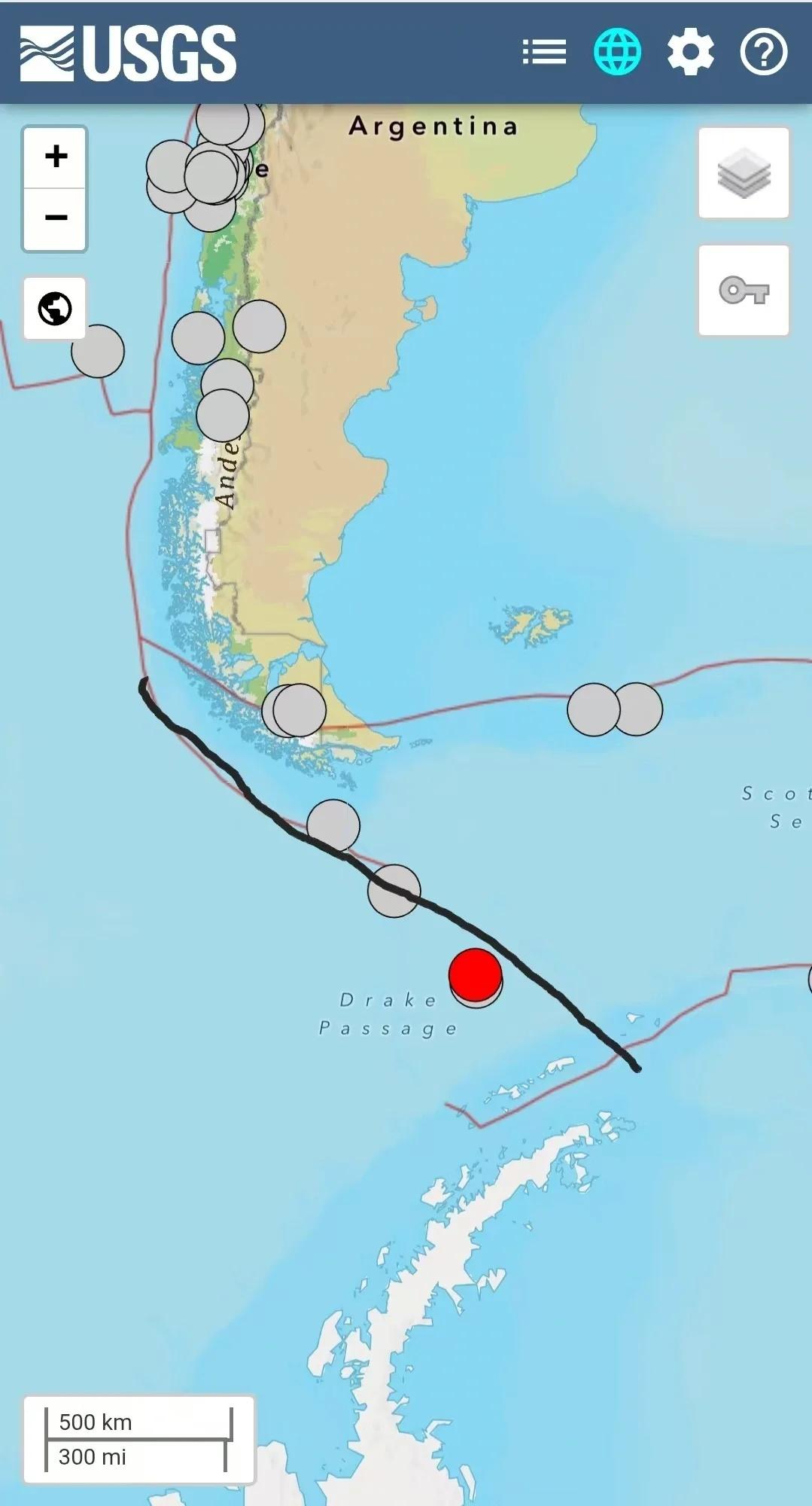 10月11日德雷克海峡再次发生7.6级地震 本次地震是该海峡自今年5月以来第三次7.5级左右地震,这一系列地震活动破裂了长约200千米左右板块边界。值得注意的是每当德雷克海峡发生强震后俄罗斯堪察加半岛以东海域就发生大地震。5月2日德雷克海峡发生7.4级地震,7月20日俄罗斯堪察加半岛以东海域发生7.4级地震,7月30日俄罗斯堪察加半岛以东海域发生8.8级地震。8月22日德雷克海峡发生7.5级地震,9月13日俄罗斯堪察加半岛以东海域发生7.4级地震,9月19日俄罗斯堪察加半岛以东海域发生7.8级地震。10月11日德雷克海峡发生7.6级地震,10月~12月俄罗斯堪察加半岛以东海域发生8+?