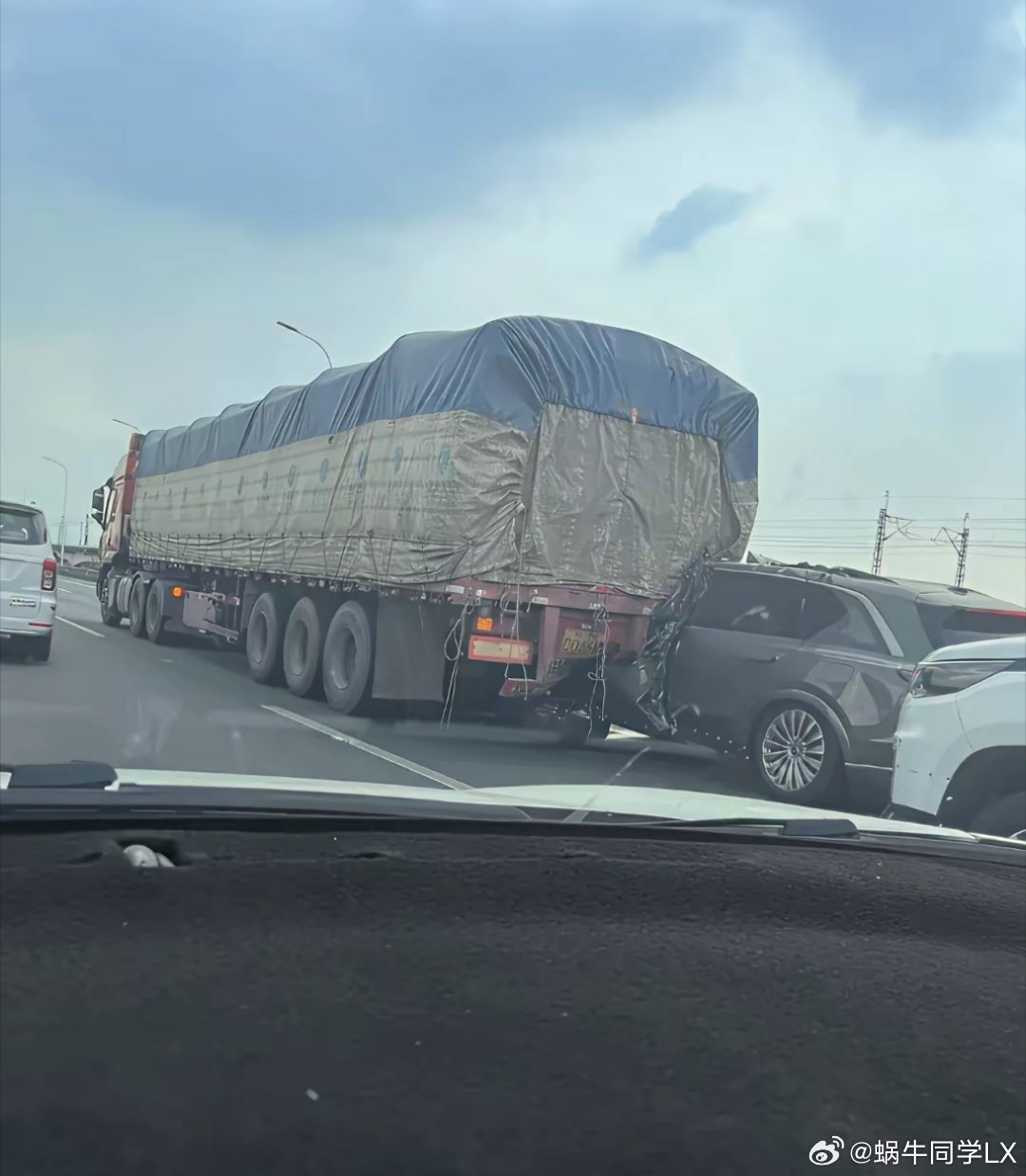 乐道L90追尾半挂车,撞击后车顶变形,A柱肯定没了,希望人能留住吧。