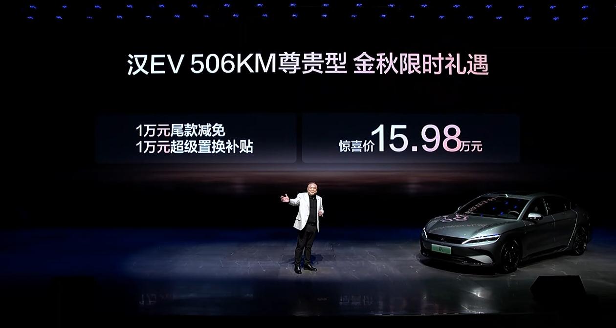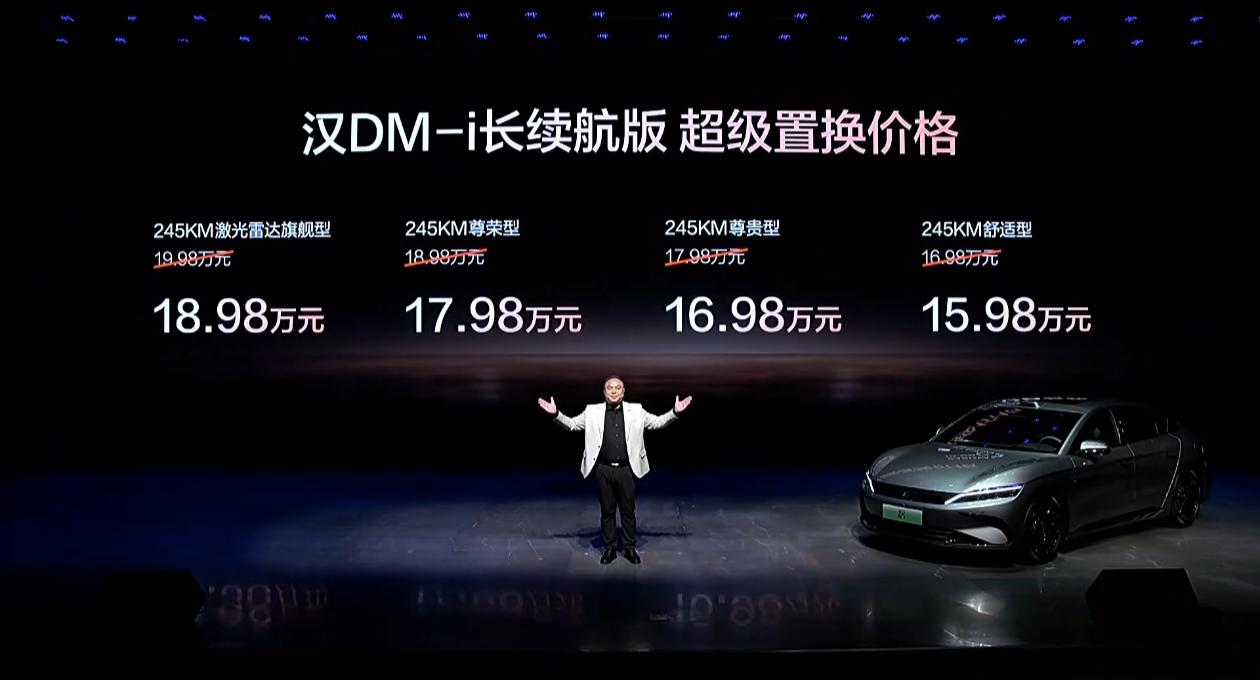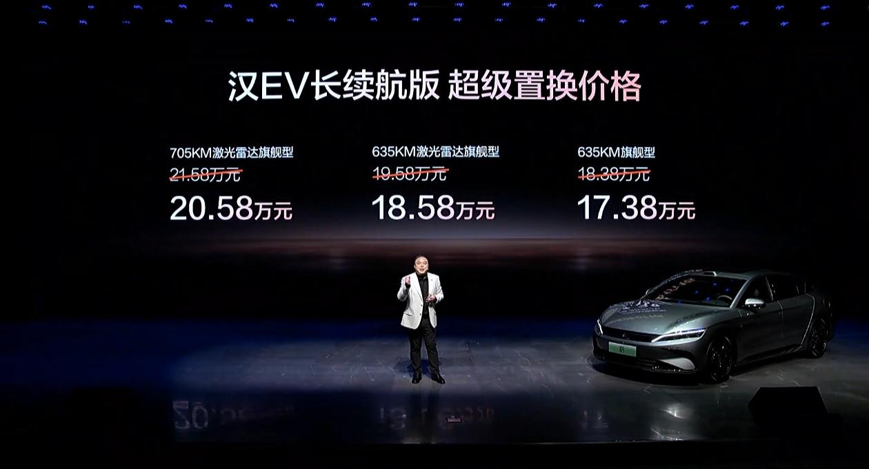 2026款比亚迪汉上市,产品力升级太多了,价格也比较来劲,竞争力再次提上来了,估计销量也该提升一波了。 先看价格。汉DM-i指导价16.98万-19.98万,加上限时置换补贴权益,价格来到了15.98万-18.98万。 汉EV指导价18.38万-21.58万,置换补贴权益价17.38万-20.58万。老款506KM尊贵版,在尾款减免和置换补贴的加持下,已经来到了15.98万。 产品力方面。外观增加了雾凇金,松影绿,远峰蓝几种新车色。 配备了4.5L冷暖冰箱。配备了全套智能防晕车系统。升级主动降噪,隔音效果大幅度提升。车机增加动态萌宠桌面。配备手车互联,无麦K歌。搭载比亚迪外接生态(儿童安全座椅,智能眼罩,游戏手柄,影石相机等等)。 更主要的是续航大提升,这个太重要了。DM-i版本把纯电续航提到了245公里,百公里亏电油耗3.44升,综合续航1560公里。 纯电版续航也增加了,有705公里和635公里可选。汉EV百公里油耗做到了10.6度每百公里。 还提供了机场,高铁站,医院等场景的泊车服务,保养去送车服务。这些服务的费用都是可以限时减免的。 当然还有智能泊车场景的安全兜底承诺等。 这次新款比亚迪汉的提升真不小,续航,生态和服务确实都让人眼前一亮,另外价格也到位了。 我觉得有了这些东西,比亚迪汉来一波大的销量提升应该没什么问题。【来自懂车帝车友圈】