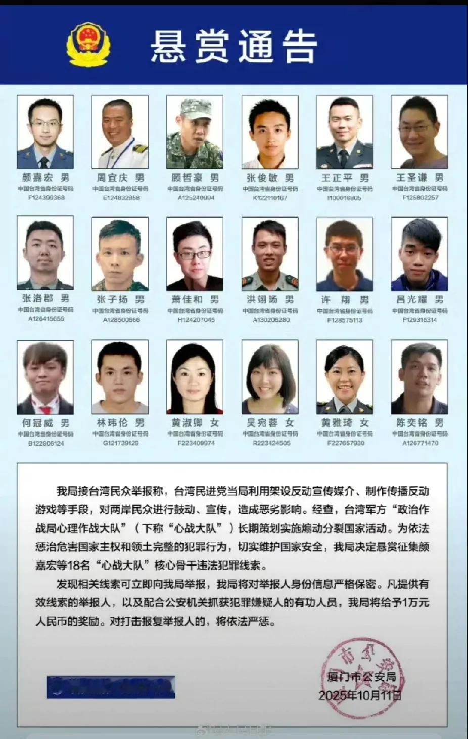 这个通告来得及时,无疑是对网特的重大打击。 颜嘉宏,请大家记住这些人的名字,留意他们的违法犯罪事实。 日前,福建省厦门市公安局发布悬赏通告,征集颜嘉宏等18名台湾军方“政治作战局心理作战大队”核心骨干违法犯罪线索。 划重点,第一,台湾军方。第二,政治作战局,政治也能作战?与意识形态领域的战争,与舆论战、墨水战、口水战、新闻战有什么关系?第三,心理作战大队,简称心战,这个名称奇怪吗?政治作战局心理作战大队,有点绕口。 清网行动必须加大力度,同时,有关公安局应该加大内奸的排查力度。线上线下,双管齐下,重拳出击,不给汉奸特务可乘之机。