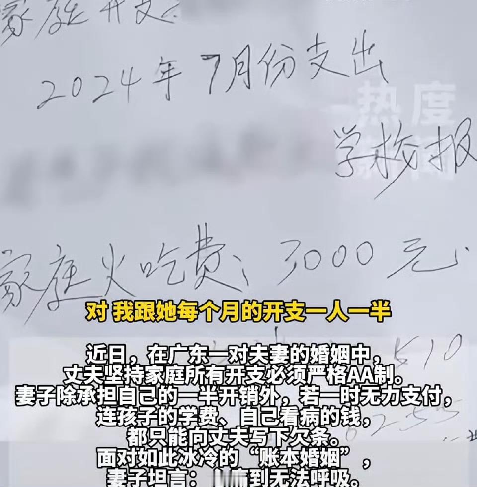 病床上的妻子正要被推去手术,丈夫递过来的不是安慰,竟是一张打印好的欠条,只冷冷一句“手术费你那半先写欠条,老规矩AA”。这不是电视剧里的狗血桥段,是发生在广东一对夫妻身上的真事,听得人心里发寒。 这对夫妻的AA制严格到离谱,家里买袋米、一瓶油甚至一包纸巾,丈夫都要记在小本本上,月底算清账催妻子转账。孩子的学费要对半分,妻子工资没发凑不够,他就让写欠条;就连感冒买药的钱,一时周转不开也得打借条注明还款日期。这次妻子要做手术,手头实在没钱,本想让丈夫先垫付,没想到等来的还是那张冰冷的欠条,上面清清楚楚写着欠款金额和还款方式。面对镜头,妻子哽咽着说“心痛到无法呼吸”,这八个字里藏了多少委屈,不用多说也能体会。 可最让人想不通的是,这男的算得清金钱账,却算不清婚姻账。婚姻从来不是搭伙过日子的财务合伙人,是两个人要手拉手扛风雨的共同体啊。他盯着妻子该出的那一半手术费,却没看见妻子平时带娃、做家务的隐形付出;他执着于“规矩不能破”,却忘了夫妻本就该是彼此的靠山。这样的家庭缺乏温度,本质上就是变相的拼婚。 我想知道家务A不A?怀孕哺乳孩子姓氏A不A?当生活的一切都变成了计算,婚姻还有存在的必要吗? ​ 法律是允许夫妻约定财产AA,但前提是不能伤了情分啊。豆瓣上曾有个热帖,丈夫连妻子的卫生巾、两人用的安全套都要按比例分摊,连丈母娘送的土鸡蛋都要折现抵扣,这不叫公平,叫自私。 婚姻里哪能什么都算得明明白白?你给我带杯奶茶,我给你煮碗热汤,这些细碎的付出才是家的温度。 要是换作你,能接受这样的AA制婚姻吗?评论区说说你的想法。 来源:新浪新闻