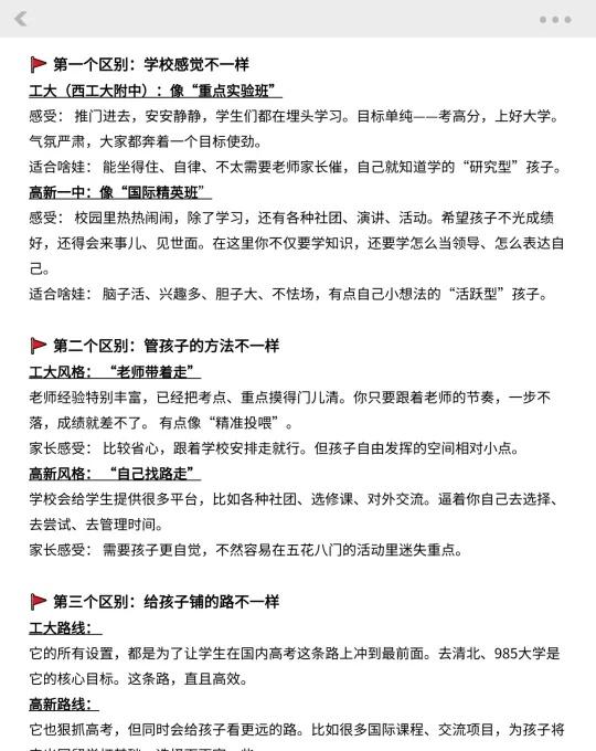 西安工大附中和高新一中真正的区别在哪? 在西安有学生的家长,肯定纠结过“工大和高新这两所学校选哪个?” 今天不扯分数线,就说点实话,帮你搞清楚它俩的区别。具体看图片内容 最后总结下来: 👉 如果你家娃: 是块学习的料,能吃苦,不太爱社交,就喜欢钻研题目。 你觉得踏踏实实走国内高考这条路最稳妥。 那闭眼选“工大”,绝对不亏! 👉 如果你家娃: 学习也好,但兴趣广泛,是个“小机灵鬼”,很有主见。 你希望他以后不光会考试,眼界、口才、领导力都能培养一下。 甚至未来有送出国的打算。 那“高新”可能更对他的路子! 说白了,没有绝对的好坏,只有合不合适。 就像给孩子买鞋,牌子再响亮,不合脚他也跑不起来呀! 西安的家长们,你们觉得呢?聊聊呗!👇 择校 多元升学途径 学业规划 教育规划 规划的重要性 高校 西安小升初 西安五大 西安高新一中