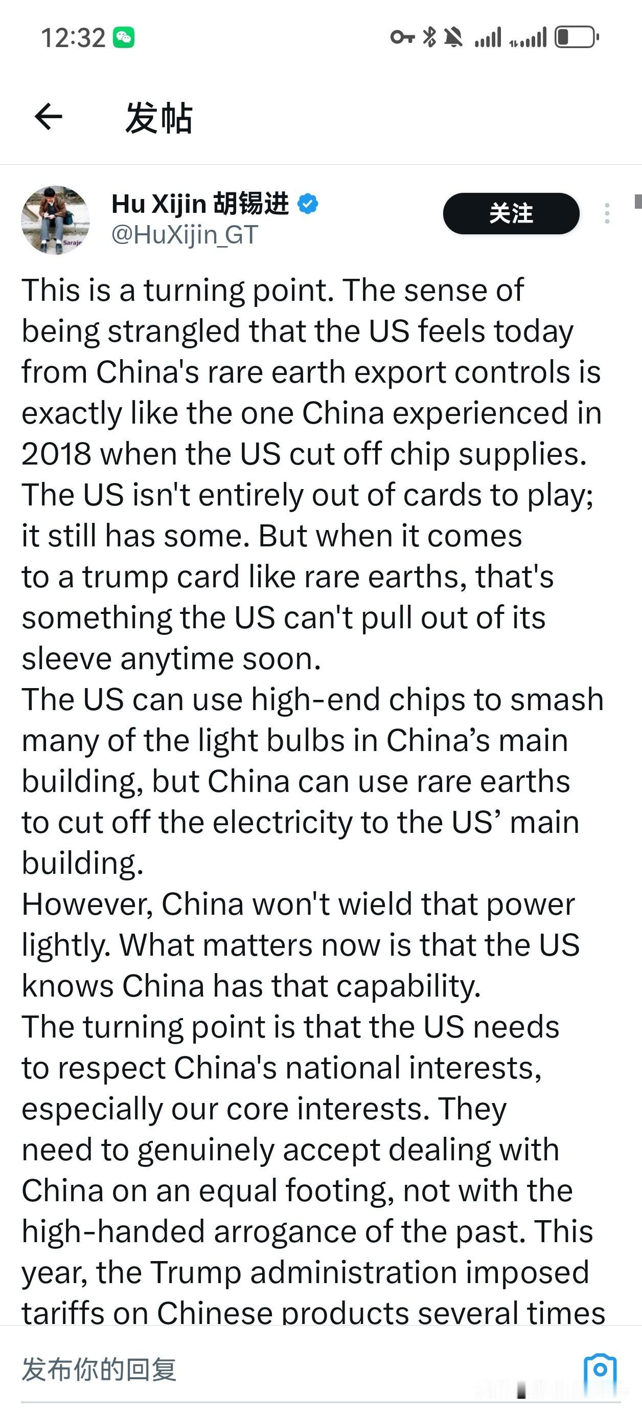 胡锡进在推特上发文表示,这是一个转折点。这个帖子居然有近20万的阅读量。不得了中国对美稀土 稀土出口限制 美国稀土需求 美国稀土需求 稀土出口限制 中美稀土之争 中方稀土战略 中国稀土重要性 美国稀土战略 美国稀土事端 美国稀土 美国今天感受到的被中国稀土出口管制扼杀的感觉,与2018年美国切断芯片供应时中国经历的感觉完全一样。 美国并没有完全没有牌可打;它仍然有一些。但是,当涉及到像稀土这样的王牌时,这是美国短期内无法拿出的东西。 美国可以用高端芯片砸碎中国主楼的许多灯泡,但中国可以用稀土切断美国主楼的电力。 然而,中国不会轻易使用这种力量。现在重要的是,美国知道中国有这种能力。 转折点是,美国需要尊重中国的国家利益,特别是我们的核心利益。他们需要真正接受在平等的基础上与中国打交道,而不是过去的高压傲慢。今年,特朗普政府多次对中国产品征收关税,甚至没有咨询我们。制裁我们的公司也是一样随意。这些行动是完全不可接受的。 在这个转折点之后,中国将利用自己的力量阻止美国越界。 在这个边界内,我相信中国将充分尊重美国的利益。