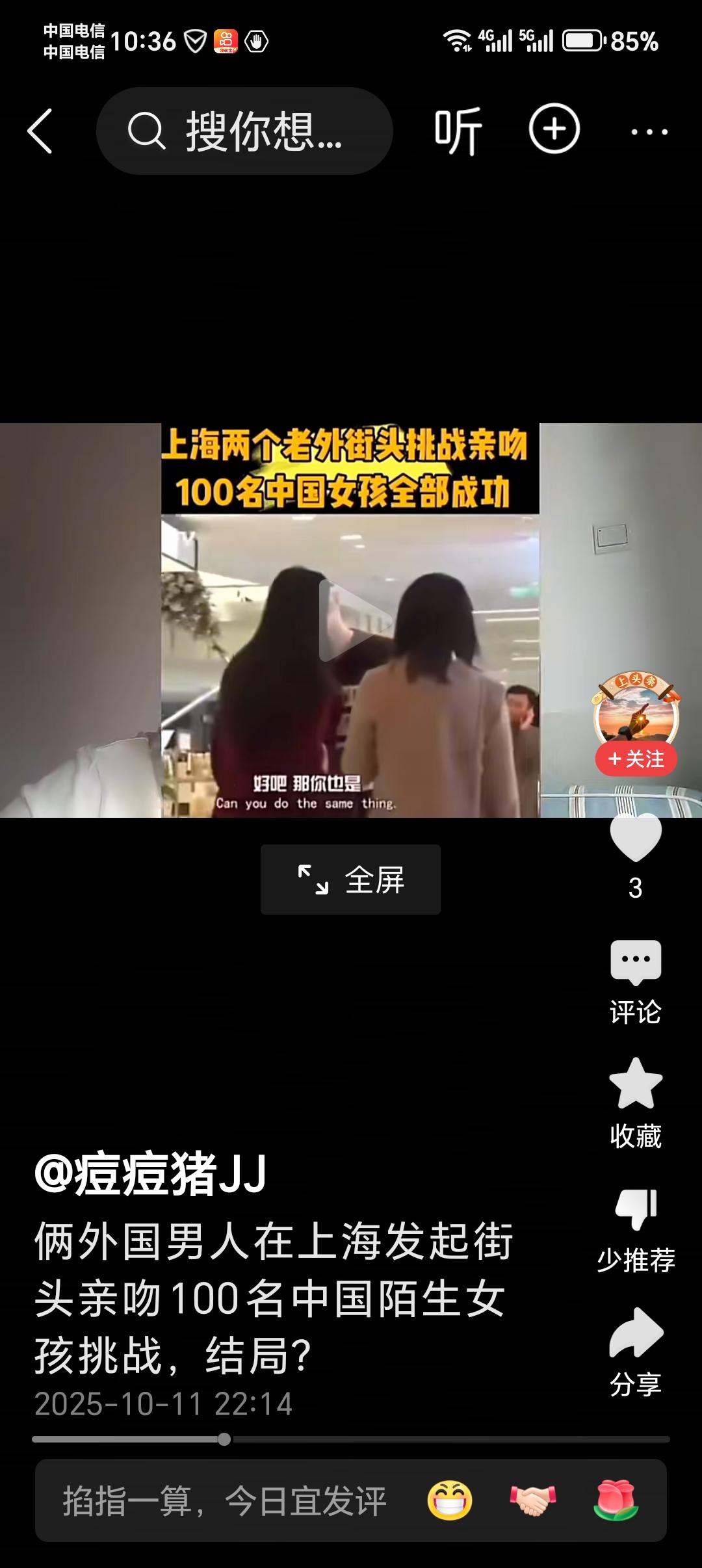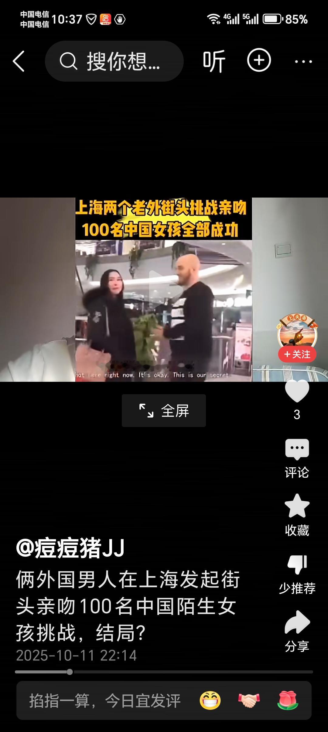 中国女生,别让“跪舔”丢了我们自己的尊严!老外在上海成功挑战了吻100个中国陌生女孩,讽刺的是挑战成功,并被老外发到网上,引爆了全网热议,被吻的有在等男友的女子,请问你和一个陌生的外国男人接吻,考虑到你男友的感受了吗?叫你们的亲人怎么面对邻居?还有两个被所谓的低劣游戏套路,不但心甘情愿被吻,还第二次送吻!你们就贱到这种程度,如果是换了二位中国男子,遭遇肯定截然不同,要么告性骚扰,要么说是猥亵。你们不怕跟素不相识的外国男人接吻得病?请问你们的底线在哪?中国的女生们,请问中国男生哪点不如外国人,是他们守住了祖国的边疆,是他们任劳任怨,是他们保护了你们!请你们自尊自重,不要为中国人抹黑,也请你们守住自己的血脉。友友们认为我的想法观点对不对?评论区见上海外国人 上海老外 双人接吻 吻人