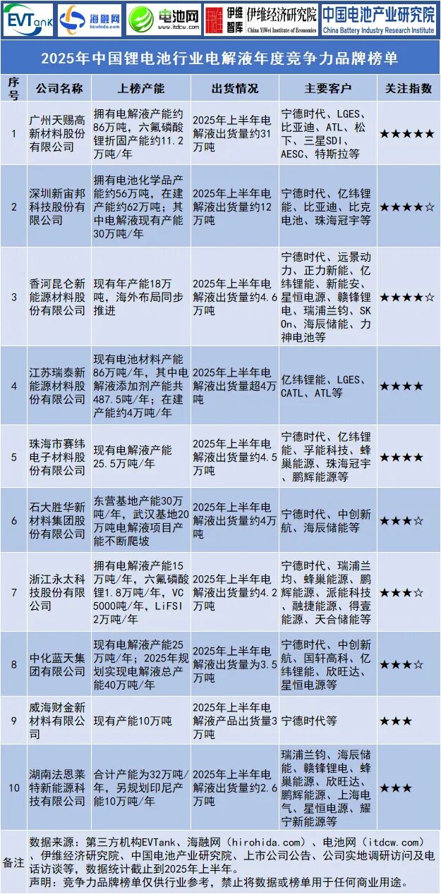 2025年中国锂电池行业电解液年度竞争力品牌榜单