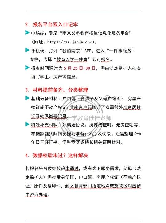 2026南京小升初学区房解读 南京小升初学区房:买了不代表能入学!关键条件速看 不少家长以为买了南京学区房就稳了,实则需满足多重条件。核心是“三者一致”,且落户时间、学位占用等问题都可能影响入学,具体如下: 一、硬门槛:“三者一致”缺一不可 1. 户籍:孩子户籍需与父母在同一户口本,且地址在目标初中施教区内; 2. 房产:房产证持有者须为法定监护人,部分区域要求100%产权; 3. 居住:户籍、房产地址需与实际居住地一致,部分学校会上门核查。 二、落户时间:“一区一策”要提前 - 鼓楼、秦淮、建邺:需提前1年落户(入学前一年5月31日前完成); - 玄武、栖霞:二手房需提前1年办好房产证与户口,新房咨询区教育局; - 江北新区:入学当年7月31日前完成即可。 三、避坑点:“三年一学位”必核查 每套住房原则上3年内仅1个初中学位(多子女除外)。买二手房时,务必向原房主或区教育局查询房源近3年学位是否被占用。 四、特殊情况:材料要备齐 - 父母离异:需离婚协议、抚养权判决书; - 户籍随祖辈:需父母无房证明、孩子长期共同居住证明; - 军人子女:凭部队证明享优待,具体咨询区教育部门。 五、派位风险:确认即不可逆 报民办、热点公办或南外派位,若被派中,需在规定时间(如往年7月11日17:00前)现场确认;确认后失原学区学位,放弃或未中则由区里统筹。 六、报名提醒 通过“我的南京”APP“教育入学一件事”报名,提前备户口簿、房产证原件及复印件;数据校验没过,及时带材料到对应初中咨询。南京 江宁 小升初 择校