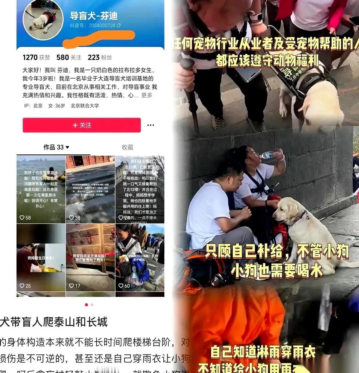 我真是惊了。 带着导盲犬芬迪爬完泰山,现在说要维权了。 我听完人都傻了。 维什么权? 维护你把一只狗当成登山杖、当成越野车,硬拖着爬完7000多级台阶,导致关节可能永久损伤的权利? 再说一遍,导盲犬是为了维持盲人日常基本生活的,不是让你带着他游山玩水爬泰山的。 心理不健康,对导盲犬基地没有感恩之心,导盲犬资本那么少,已提供了一段时间帮助了,自己不懂得珍惜,维什么权?残联还要顾及广大的残疾人,绝大多数盲人还没享受过导盲犬的帮助咧…… 自私的只有自己,芬迪忍着关节疼痛为主人服务,路人心疼不对吗?芬迪只是不会说话!希望基地为芬迪找到有爱的新主人! 强烈呼吁不能让导盲犬芬迪和任何一个导盲犬再去这两个瞎子身边,不懂得珍惜、爱护导盲犬,虐待导盲犬,坚决不答应芬迪和其他导盲犬再回到两个瞎子身边。