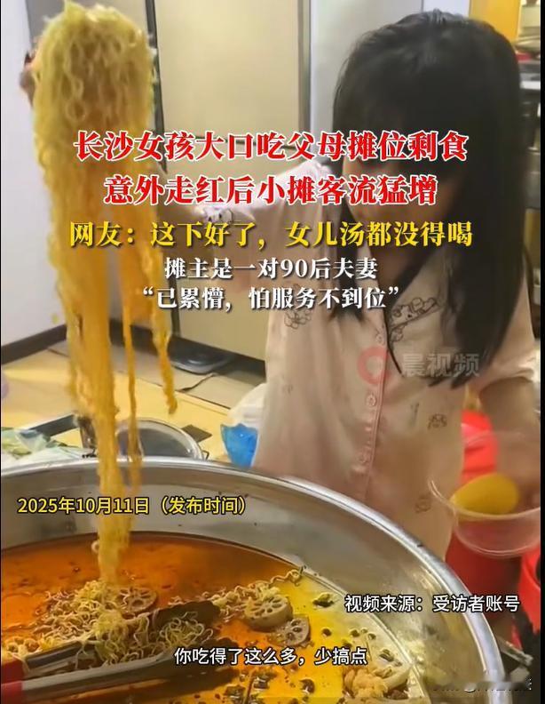 长沙,一对父母在景区摆摊,销售各种卤味。回家之后,看到女儿在大口他们吃摆摊剩下的食物,于是就拿起手机给孩子录制下来。在把视频发布到网上之后,很多网友表示,给孩子吃剩下的食物对孩子好吗?部分网友则称,摆摊父母肯给孩子吃摊位食品,证明他们家的食物非常健康。意外走红之后,摊位越来越火爆,客流量蹭蹭猛增。 潇湘晨报·晨视频10月11日报道了这则新闻。据报道称,现在随着客流量增多,90后夫妻俩忙到凌晨3点,7点就起来干活,生意好的不行。 在长沙有这样一对90后夫妻,他俩靠摆摊售卖卤味营生。夫妻俩勤劳肯吃苦,每天早早起床准备当天的食材物料。 他俩有一个可爱的女儿,但是夫妻俩整天忙碌,时常会疏于陪伴小孩。不过,女儿懂事听话,每次爸爸妈妈出摊回来的时候,小孩几乎都已经早早入睡。 这一天,夫妻俩回家,看到孩子还没有睡着,就让孩子先在客厅里看一会电视。夫妻俩把今天摆摊剩下来的食材,包括凉拌方便面、海带丝、花菜、兰花干等,就放在客厅里。 孩子在认真看电视,夫妻俩心想,就把今天卖剩的食材先放着吧,稍后再来处理。然后俩人就到厨房里去准备明天的食材了。 忙碌一阵之后,俩人来到客厅。回到客厅的时候,居然看到女儿正在“解决”剩下的食物。拿着饭碗,自己夹着筷子,大口大口的吃着拌面。不一会,就把食物都吃的干干净净。 吃完之后,小家伙还举着空碗对爸爸妈妈说:“爸爸妈妈快来看呐,今天的我又空盘了哦!真香!”听到孩子的夸奖,夫妻俩内心感到非常幸福。 俩人随手就把挖空盘的视频发布到网上,发布之后,视频迅速就走红。有不少网友则产生了质疑:作为父母,你们给孩子吃剩饭,就不怕不卫生吗? 相反,却也有更多的网友开始声援:“人家既然肯把自家做的菜给孩子吃,虽然是剩下的,但是起码证明对自己的食材卫生、安全这块非常放心啊!” 很快,视频就火遍全网,随之爆火的,是他们的摊位流量。现在,这对90后夫妻,摊位生意异常火爆。每天都会工作到凌晨3点,凌晨7点又要起床继续忙活。 看到妻子非常辛苦,丈夫也表示,愿意陪着妻子一起吃苦。妻子表示,一个人忙就行了,更希望丈夫可以多陪伴孩子,自己也多多休息一下。 而身旁的丈夫则表示,忙完之后,反正孩子都已经睡下了,也不忍心让妻子一个人吃苦,既然是夫妻,肯定要同心协力、共同奋斗。 根据长沙这边网友的反馈,现在这对90后夫妻的摊位,火爆到人挤人,每天出摊几乎都销售干净,甚至连卤味的汤水都被“搜刮”得一干二净。 对此,有网友调侃道:这下好啦,孩子连一口汤都喝不到了。虽然火了,不过这对夫妇,更多收获的是生活的幸福,因为他们把日子过得更加充足。 1.爸爸妈妈给孩子吃剩菜,作为父母,这样的行为是否合理呢? 根据《未成年人保护法》第16条规定,作为监护人,父母应该关注未成年人生理、心理状况,长期提供不新鲜食物可能涉及监护失职。 虽然给孩子吃剩下的食物,此举不当,但是也从侧面体现,这对夫妻做出来的食物非常健康、卫生,能够满足孩子的饮食需求。 但是,作为家长,也需要遵循合理均衡营养的原则,给未成年人吃的食物,还是以简单、营养为主。剩菜光盘行动,体现了父母的教育观,但是建议优先让孩子去食用新鲜食材。 2.不忍心妻子一个人吃苦,丈夫全程陪伴,这样的另一半体现了怎样的价值观呢? 这位丈夫体现了共同生活于协助义务,根据《民法典》第1059条明确规定,夫妻双方具备互相抚养的义务,包括经济支持、生活照料和情感关怀。当另一方辛苦奋斗的时候,另外一方也需要主动帮忙、承担相应的家庭责任。 90后妻子工作辛苦,奋斗到凌晨,作为丈夫并没有袖手旁观,虽然妻子劝其多多休息,但是他坚持陪伴,体现了共同生活、互相协助的义务。 孩子懂事乖巧,夫妻俩踏实勤劳。对于本案例,大家都作何看法呢,欢迎前往评论区一起来讨论吧。