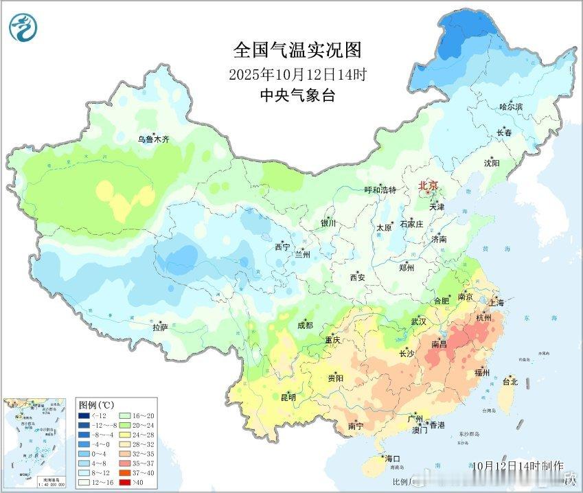【气温】今天长江南北两侧气温依然差异巨大。长江以北阴雨+冷空气,气温低迷。长江以南光照强,依然热力十足,江西浙江福建站点包揽高温榜前十。今天下午郑州济南气温不到14℃,南昌拿下今年第79个高温日,继续破省会城市全年高温日最多纪录。浙江开化、建德、江西上饶体感温度超40℃。