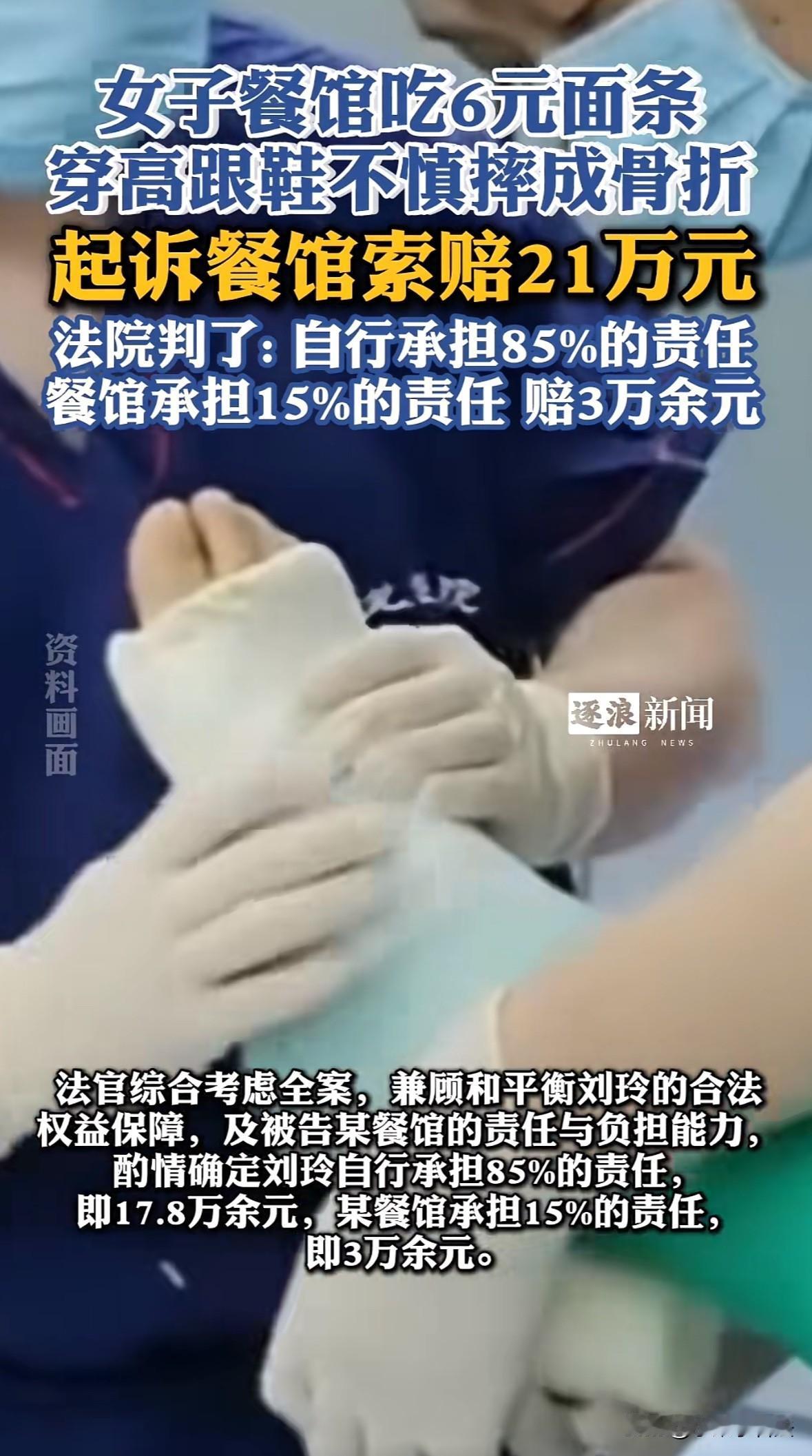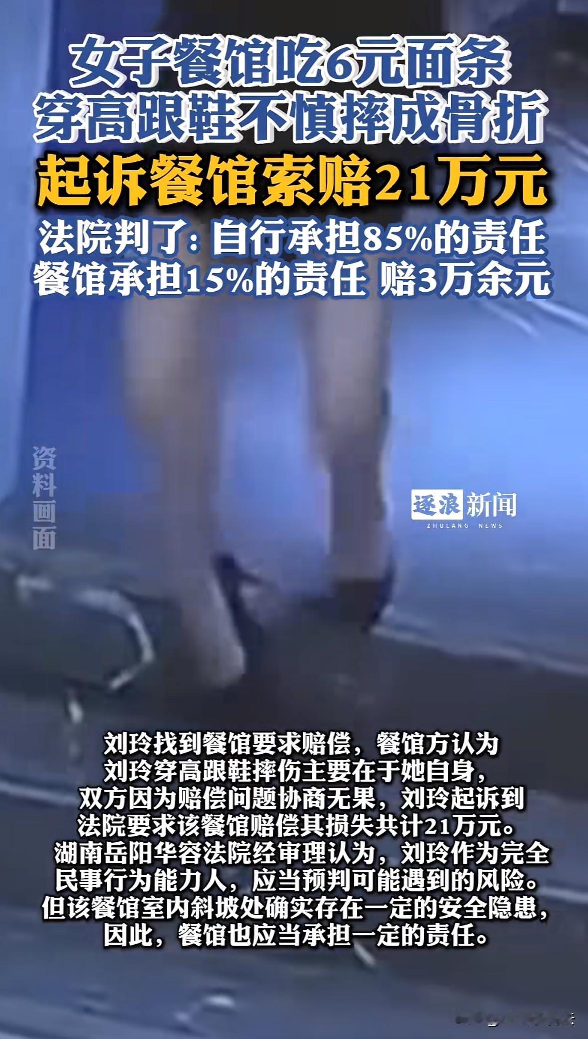 湖南岳阳,女子到经常吃饭的餐馆点了一碗6元的面条,穿着高跟鞋返回座位时,在斜坡的台阶处摔倒,被送医治疗后进行手术,伤情构成十级伤残。事后女子找餐馆索赔,餐馆认为是女子穿高跟鞋导致摔倒,拒绝赔偿,协商未果女子起诉索赔21万,法院这样判决。 刘女士经常到家附近的一家餐馆吃饭,餐馆的面食很合刘女士的口味,而且价钱并不高,所以刘女士隔三差五就会去吃上一次。 有次刘女士又馋了那家餐馆的面条,于是就在下班后来到餐馆,点了一碗6元的面条,然后就像往常一样回到座位上等待。 就在刘女士往座位走去的时候,在店内玻璃推拉门的台阶处摔倒受伤。刘女士坐在地上疼得大叫,餐馆老板赶紧将刘女士送往医院救治。 医生初步检查是左髌骨骨折,需要尽快手术。手术进行的很顺利,但是需要住院治疗。 出院后,刘女士赶紧就去做了司法鉴定,刘女士的伤情经鉴定为十级伤残,而且建议刘女士伤后伤休180天,护理90天,营养60天。 从住院治疗到伤情鉴定,前前后后刘女士花了不少钱。如果刘女士不去餐馆吃饭,就不会发生摔倒受伤的情况,所以刘女士认为自己的伤餐馆也要给予赔偿。 拿着司法鉴定,刘女士找到餐馆,想着双方商议出一个解决方案,看看赔偿多少合适。 餐馆老板看了司法鉴定,但并不觉得餐馆应该进行赔偿,因为刘女士当天是穿着高跟鞋来就餐的,而且除了刘女士以外,其他顾客也没有摔倒。 餐馆认为是刘女士自身的原因,跟餐馆无关,所以拒绝赔偿。 既然双方协商未果,刘女士将餐馆告上法庭,要求餐馆赔偿其损失21万元。 刘女士认为,她在餐馆就餐发生的摔倒受伤,那么餐馆就应该负有责任和赔偿的义务。 因刘女士在餐馆并未的第一次就餐,所以她不可能故意讹诈餐馆。是因为在就餐当天餐馆的地面有明显的油渍水渍和脏污,才导致了脚底发滑摔倒,所以餐厅存在侵权责任。 根据《民法典》第1179条的规定:侵害他人造成人身损害的,应当赔偿医疗费、护理费、交通费、营养费、住院伙食补助费等为治疗和康复支出的合理费用,以及因误工减少的收入。造成残疾的,还应当赔偿辅助器具费和残疾赔偿金;造成死亡的,还应当赔偿丧葬费和死亡赔偿金。 刘女士住院治疗的花费费用清单有详细的记录和报销凭证,刘女士认为餐馆应该赔偿21万损失给自己。 餐馆在法院上提供了餐馆就餐内部的环境照片,还有在刘女士就餐那天,其他顾客作为人证。 餐馆在玻璃推拉门处的确是有点坡度的,但餐馆已经就斜坡做过相应的防护措施,就是避免顾客就餐时在此处摔倒。 在刘女士到店就餐前,有很多老顾客也来到过餐馆就餐,但是并无一人摔倒,足以证明当天餐馆内的地面并非是行走困难的情况。 餐馆认为,作为公共场所的经营者,已经做到了谨慎注意的安全保障义务。刘女士摔倒应该是由于其就餐当天穿了高跟鞋的缘故,与餐馆无关,所以不应对刘女士的受伤进行赔偿。 法院经过审理后认为: 刘女士作为完全民事行为能力人,穿高跟鞋到餐馆就餐应更加注意风险防范。餐馆本身可能会存在的汤汁酒水的滴撒的情况,刘女士在餐厅就餐时更应该注意安全防范。 刘女士经常到该餐馆就餐,理应对餐馆内部的陈设以及台阶处有斜面很清楚。在经过台阶处时更应该做到谨慎注意的情况。 刘女士声称就餐当天的餐馆地面存在行走异常的情况,但根据到场的多名证人证词可以推断出,在刘女士就餐当天的餐馆地面并没有行走异常的情况。 因刘女士无法举证证实餐馆地面存在行走异常的情况,法院不予采信。 法院认为,刘女士穿着高跟鞋在餐馆就餐时发生摔倒是由于其自身不注意造成,其造成的损害应该由李女士负有主要责任。 根据《民法典》第1198条的规定:宾馆、商场、银行、车站、机场、体育场馆、娱乐场所等经营场所、公共场所的经营者、管理者或者群众性活动的组织者,未尽到安全保障义务,造成他人损害的,应当承担侵权责任。 因第三人的行为造成他人损害的,由第三人承担侵权责任;经营者、管理者或者组织者未尽到安全保障义务的,承担相应的补充责任。经营者、管理者或者组织者承担补充责任后,可以向第三人追偿。 餐馆作为公共场所,其就餐环境的斜坡的确存在安全风险,餐馆应该承担一定的责任,但是在合理限度内对刘女士进行赔偿。 法院综合考虑衡量后,酌情认为餐馆应该承担15%的责任,即赔偿3万元。判决结束后,双方均为上诉,判决已经生效。