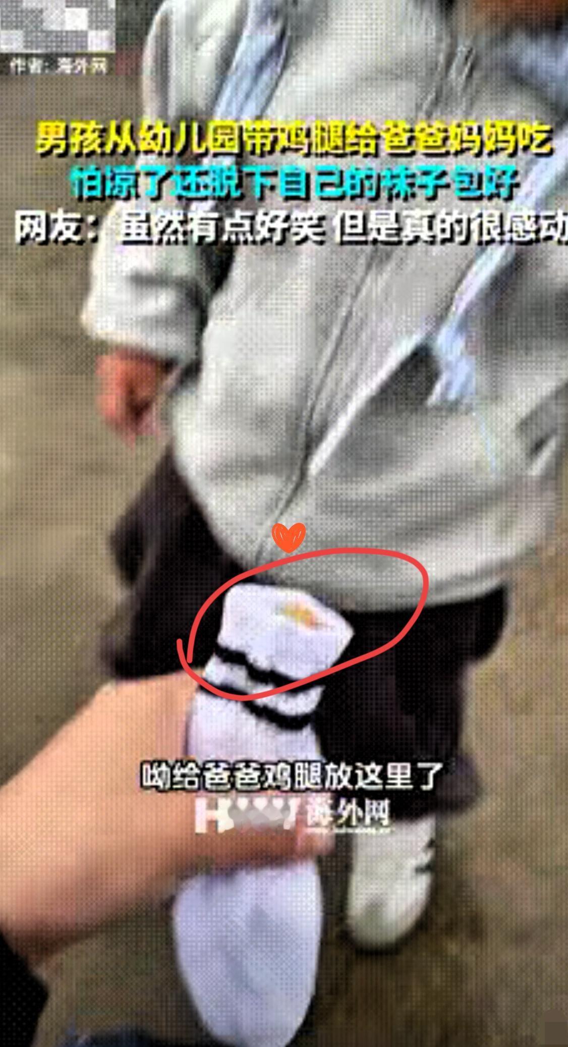 特别的爱!河南,一3岁男孩从幼儿园带回鸡腿给父母吃,担心凉了,脱下一只袜子包好,