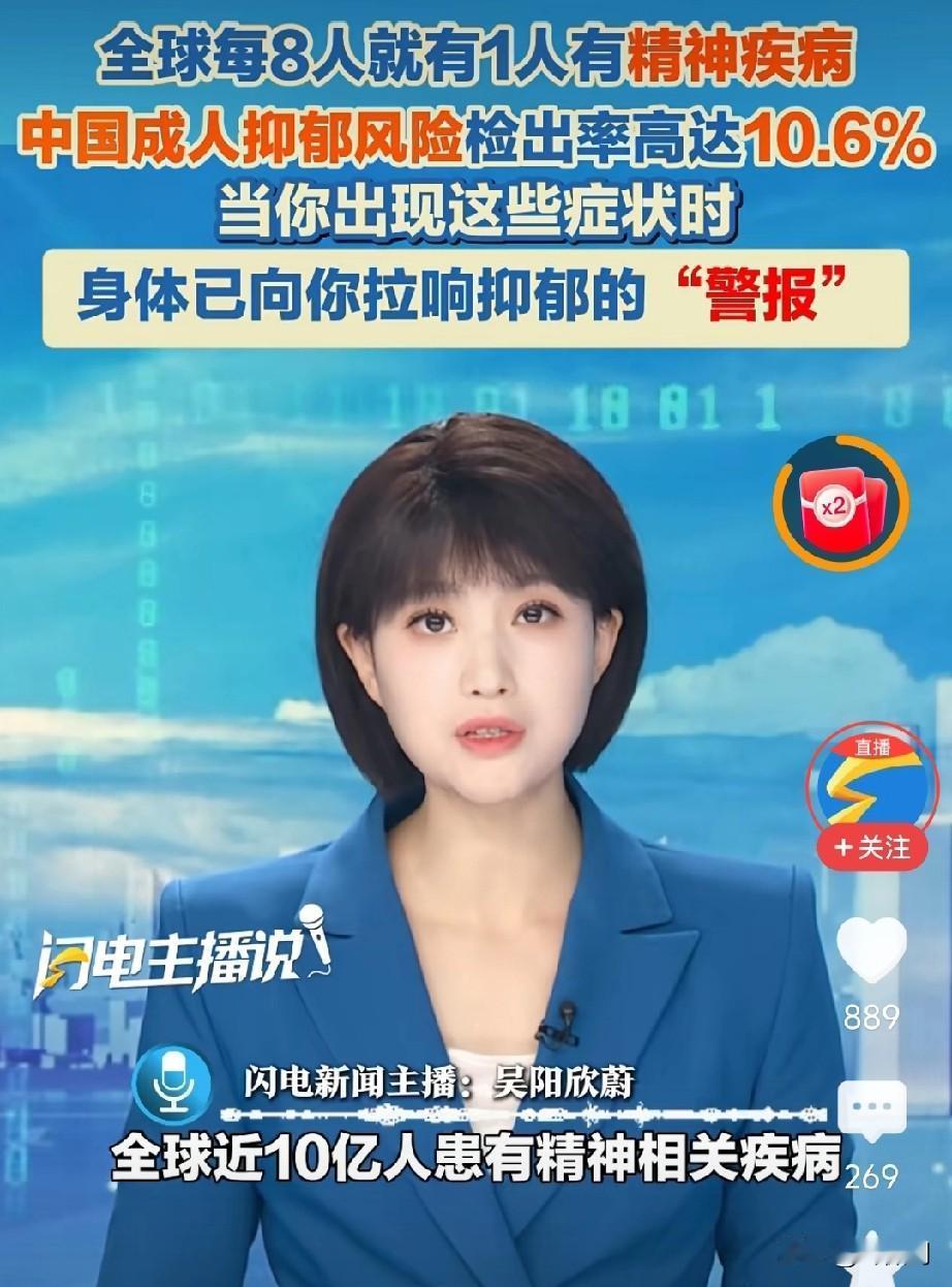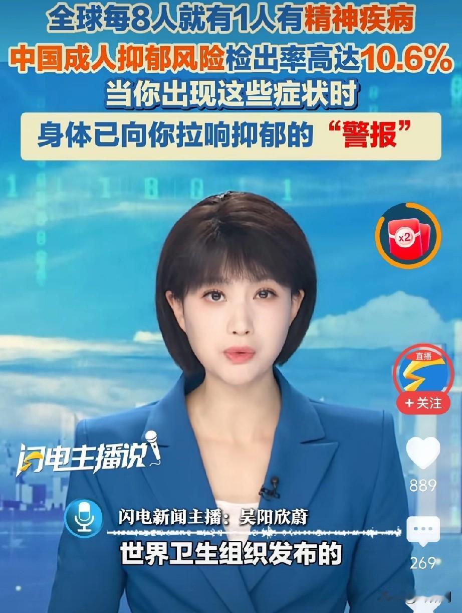 全球每8人就有1人有精神疾病,也就是说你身边除了自己7个人里面,就有一个精神疾病,当然前提是你自己没问题。 精神疾病中,抑郁症比例最高。 我们国家的成人抑郁症风险高达10.6% 我们都有一个习惯,不太注重精神疾病,总觉得精神病离自己很远。 而且很多抑郁症患者,不觉得自己生病了,只是归结于心情不好,自己调节一下就好了。 轻度抑郁症,如果自己意识到问题了,改变生活环境,调节心理压力,用各种方式调整,是可以自愈的,不过会反复。 而中度到重度抑郁,自愈的概率就低很多。如果不及时治疗,症状可能持续半年甚至更久,还可能影响到日常生活、工作能力,甚至增加自杀风险。 我们应该注重精神疾病,必要的时候可以寻求专业帮助。